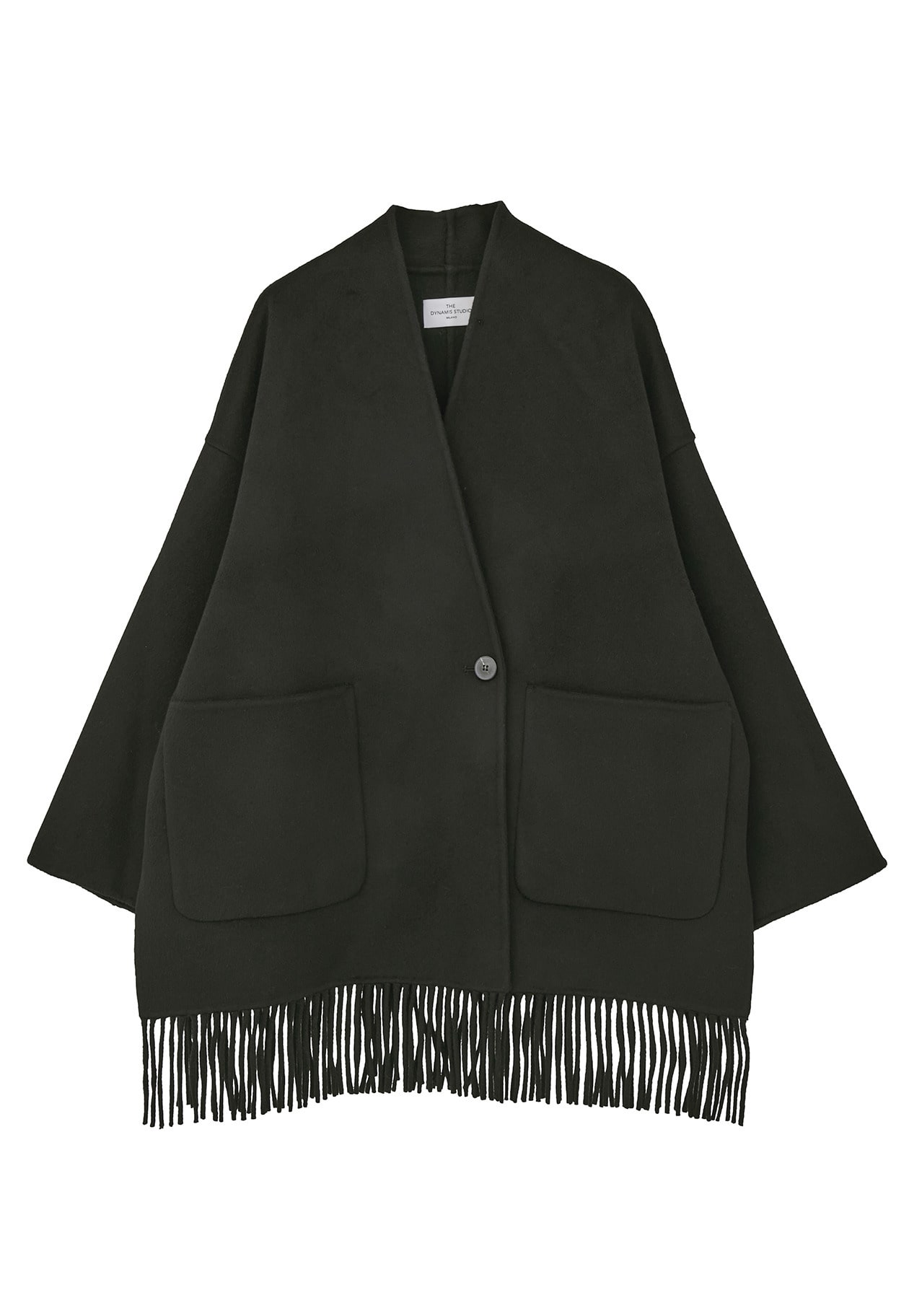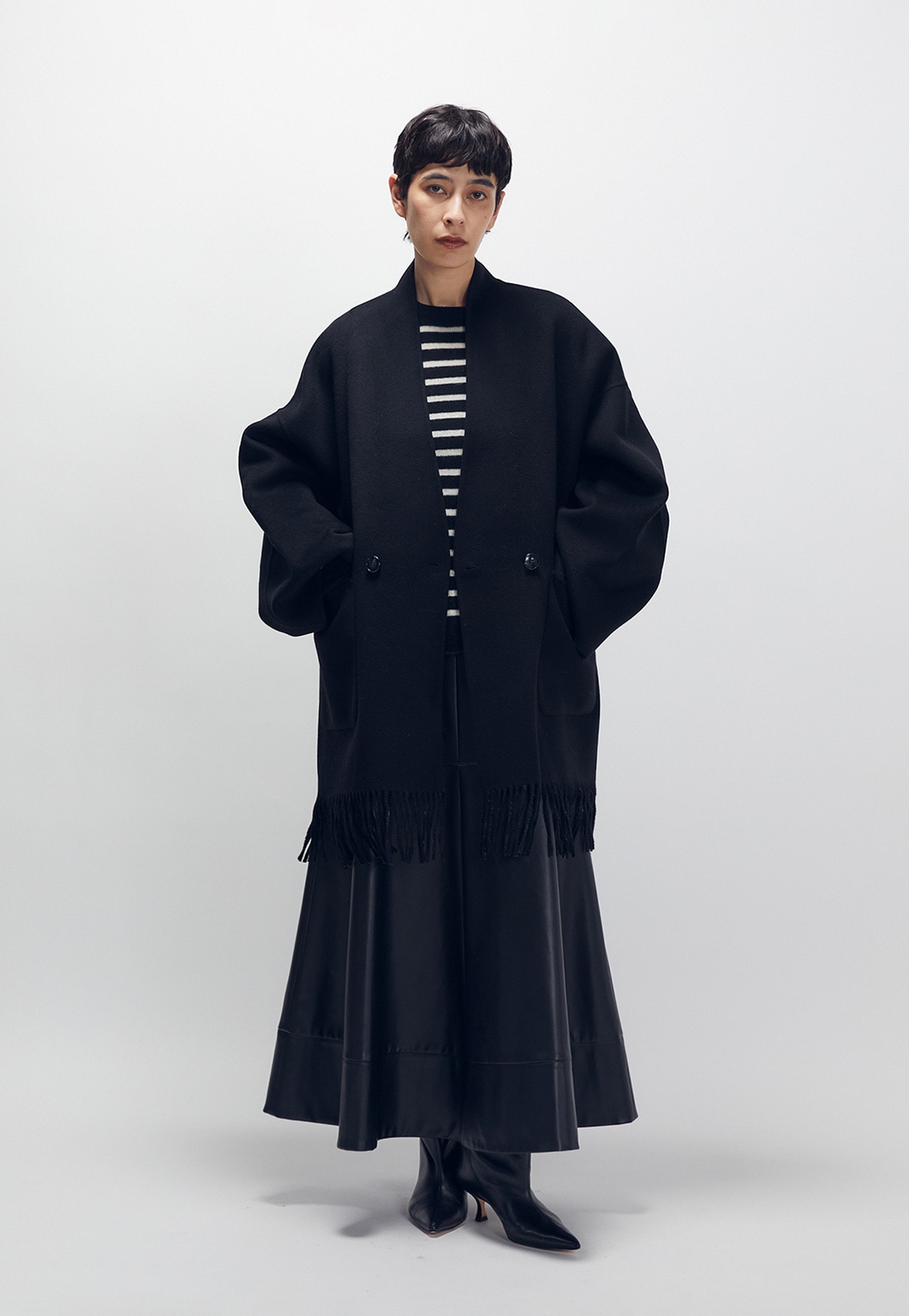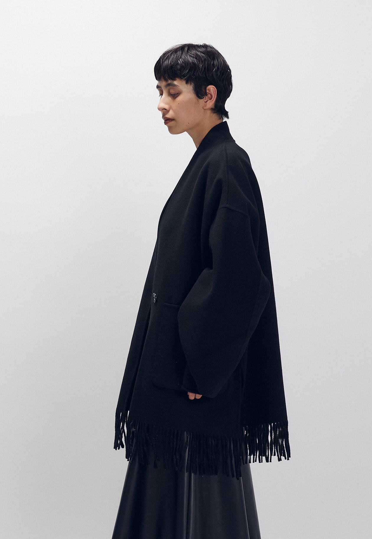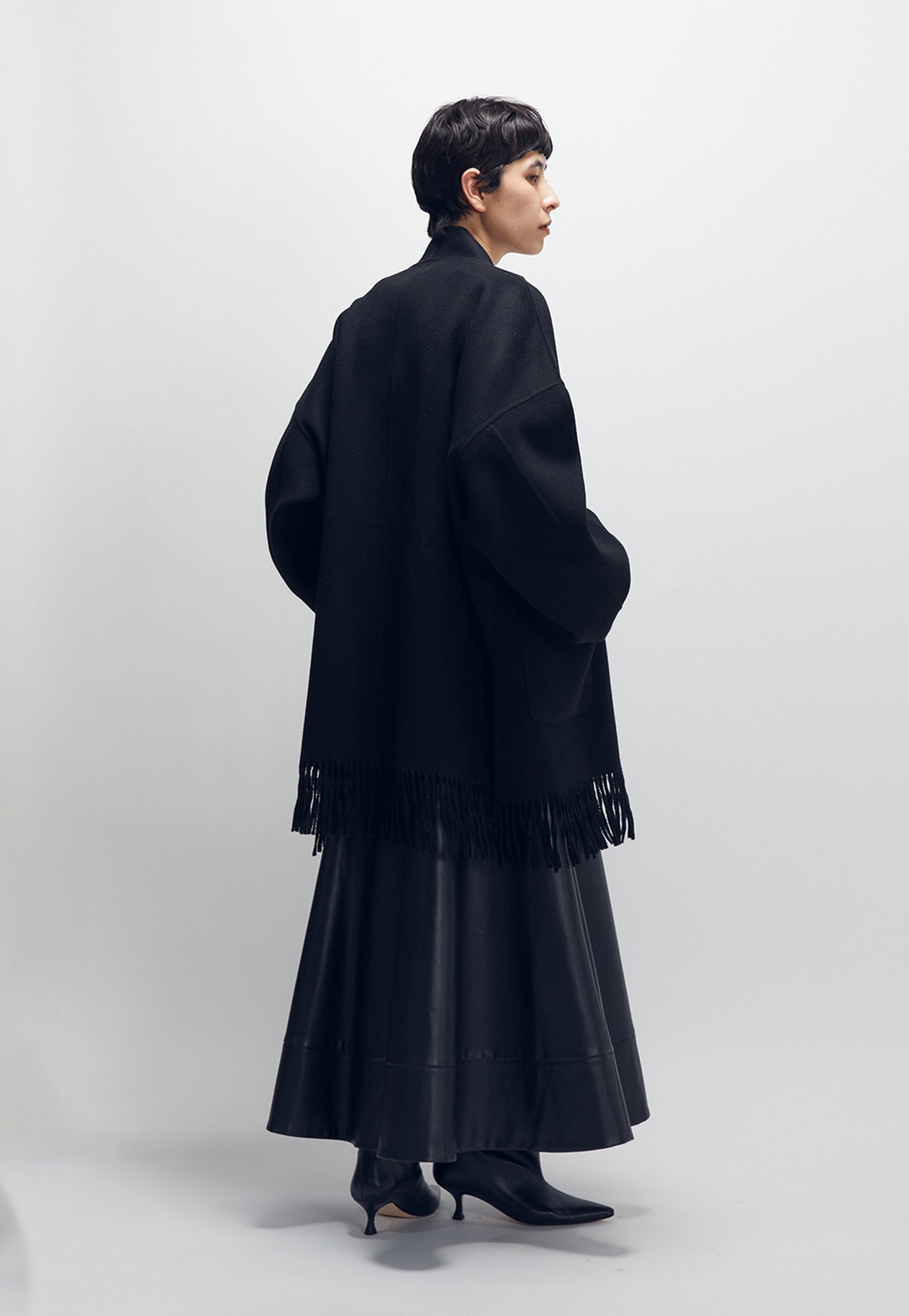 同系糸のフリンジを裾に施したデザインのミドル丈コート。
