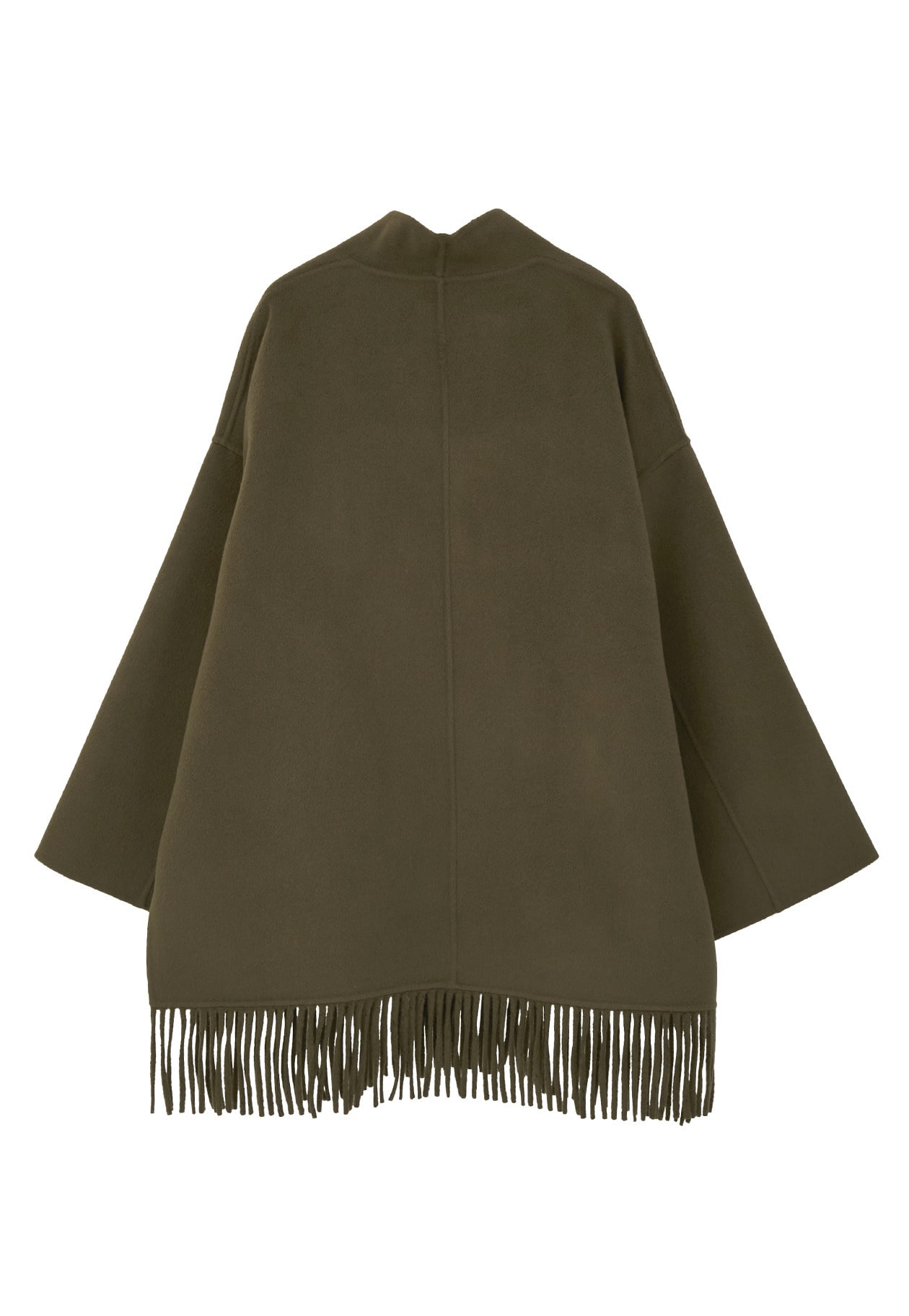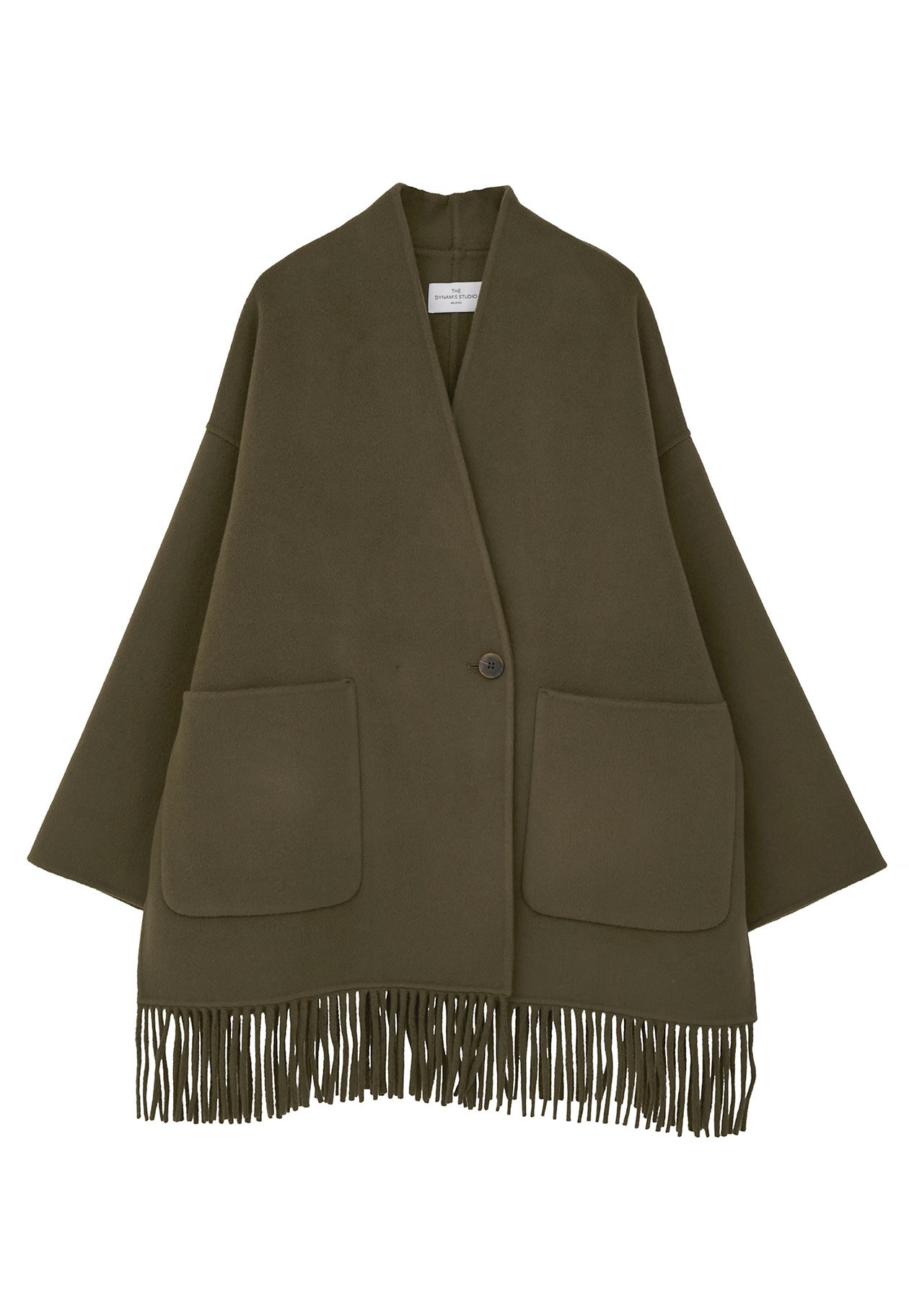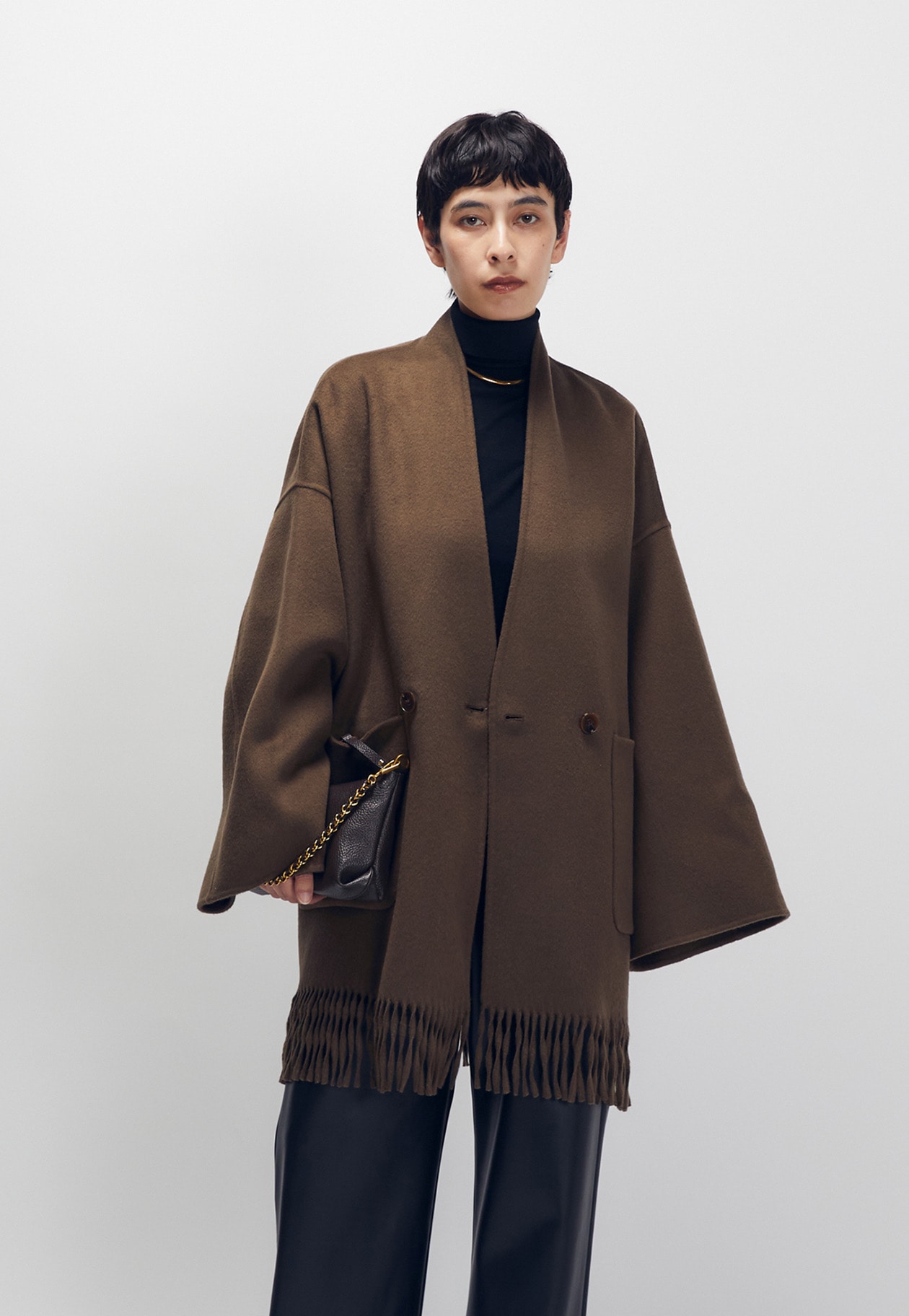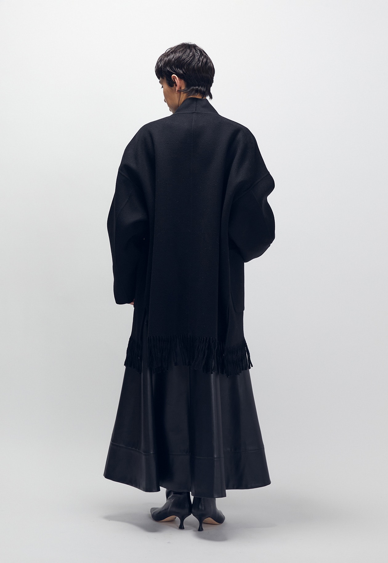 同系糸のフリンジを裾に施したデザインのミドル丈コート。
