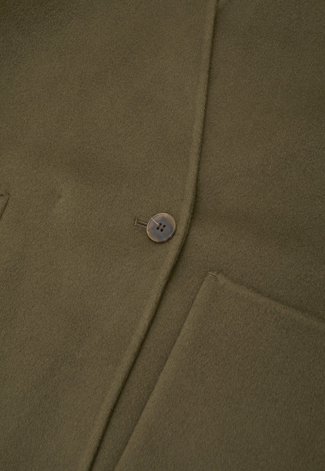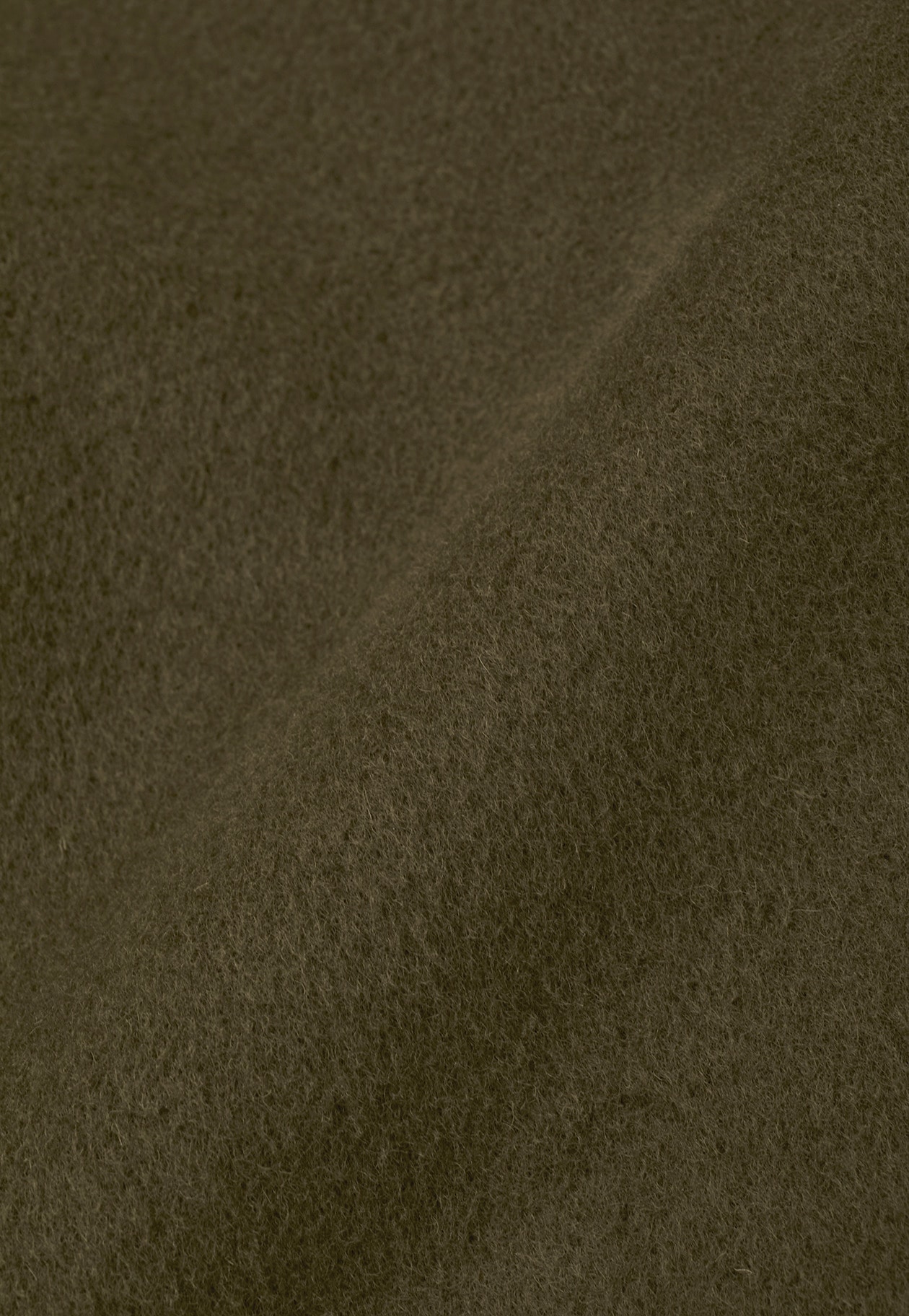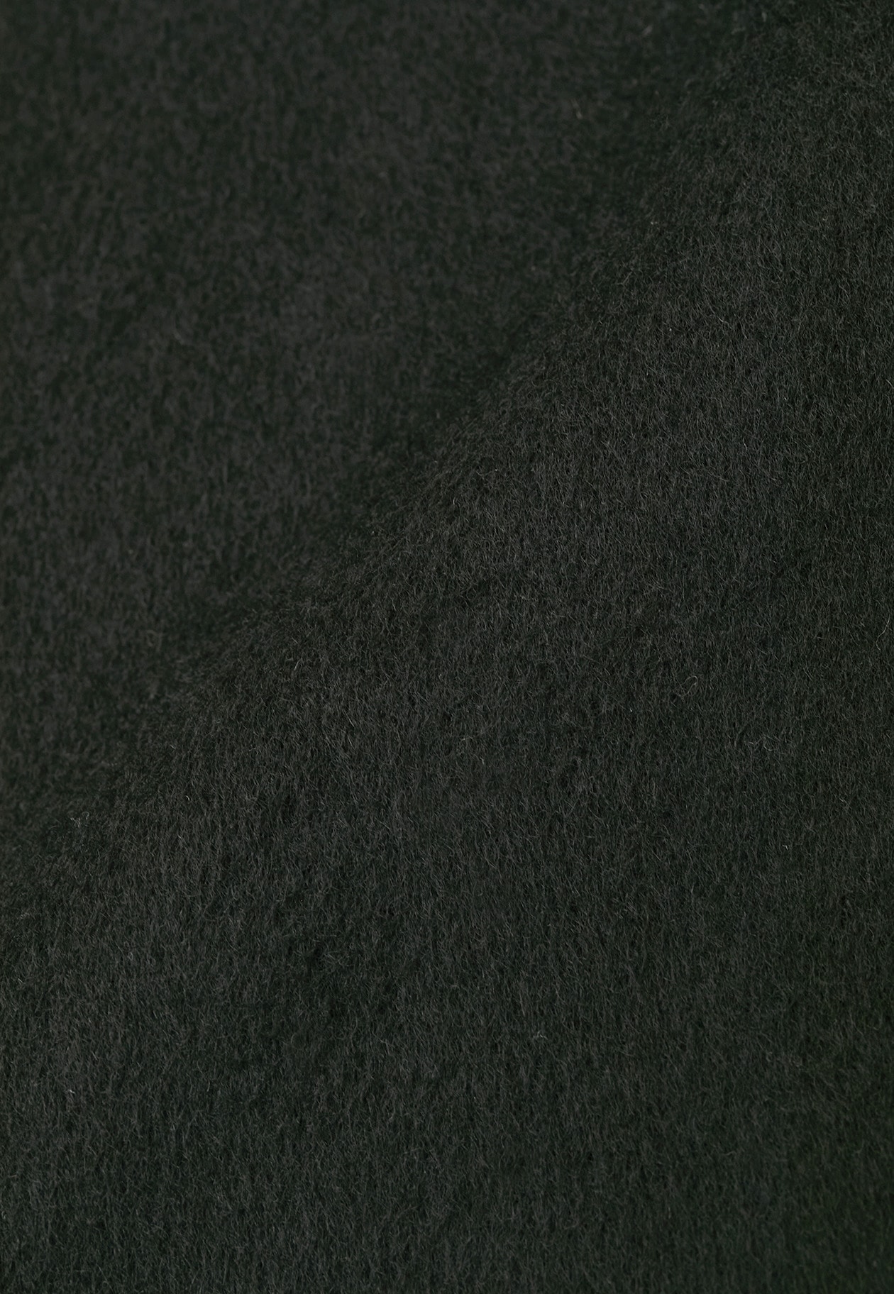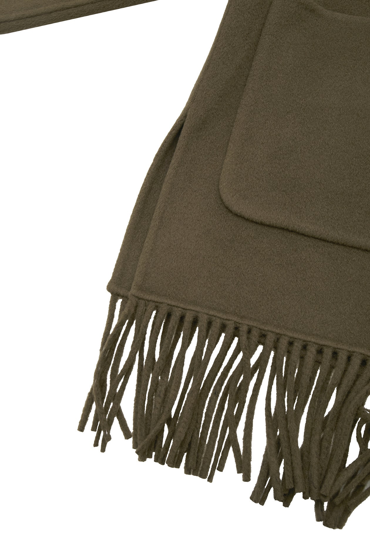 同系糸のフリンジを裾に施したデザインのミドル丈コート。