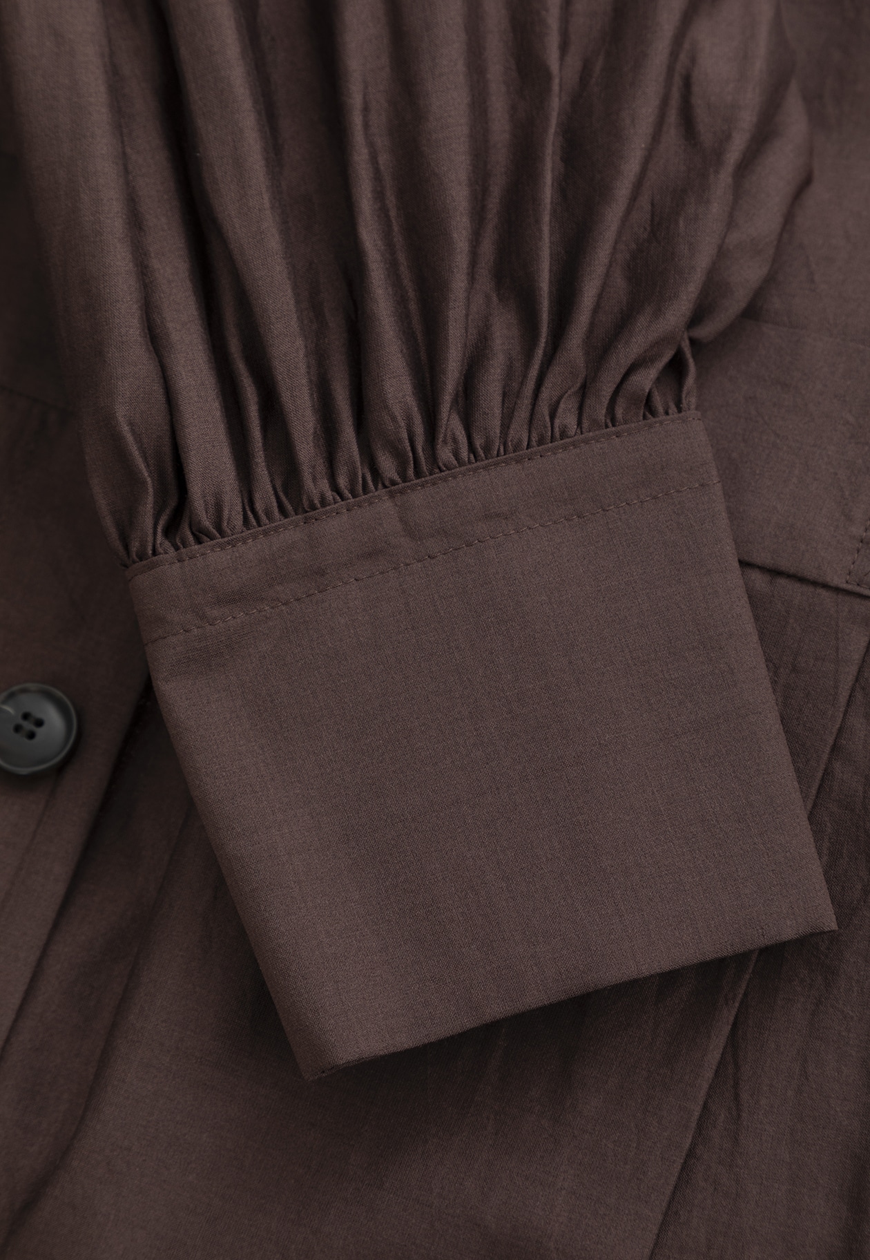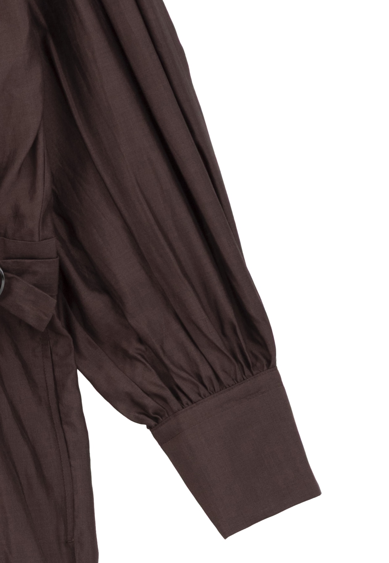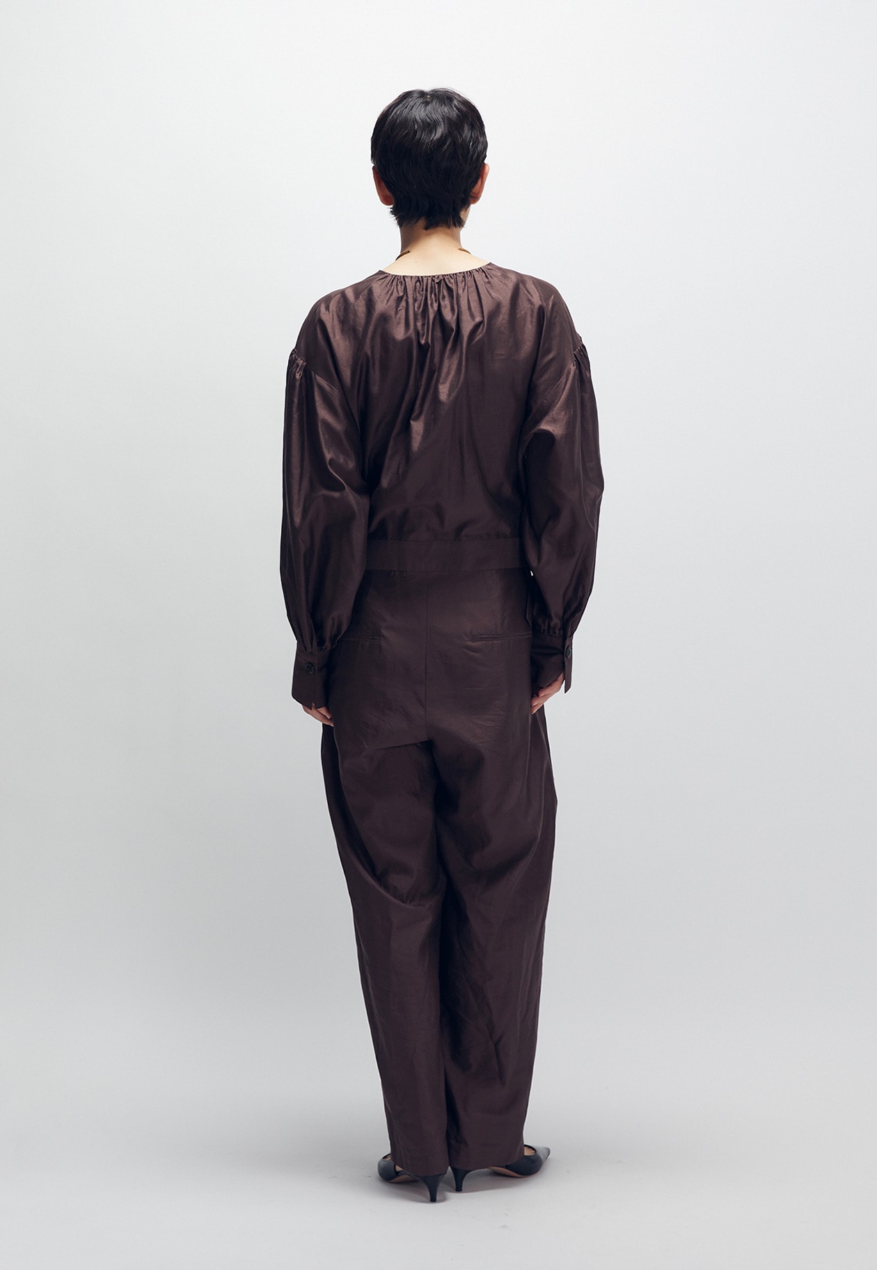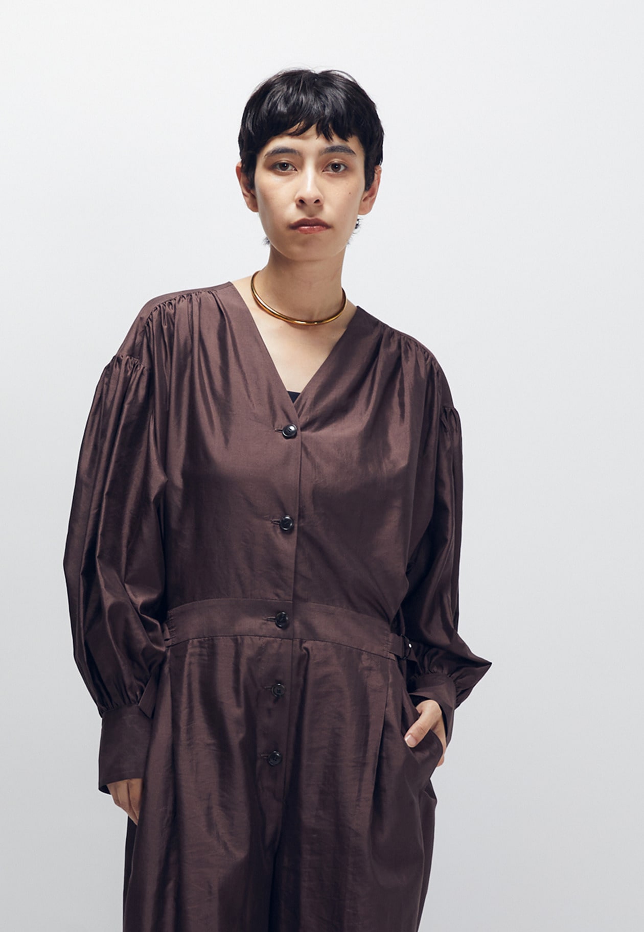 デザインは、肩や背中、袖にたっぷりとギャザーを入れ、まるで空気をまとうような軽やかなシルエットに。