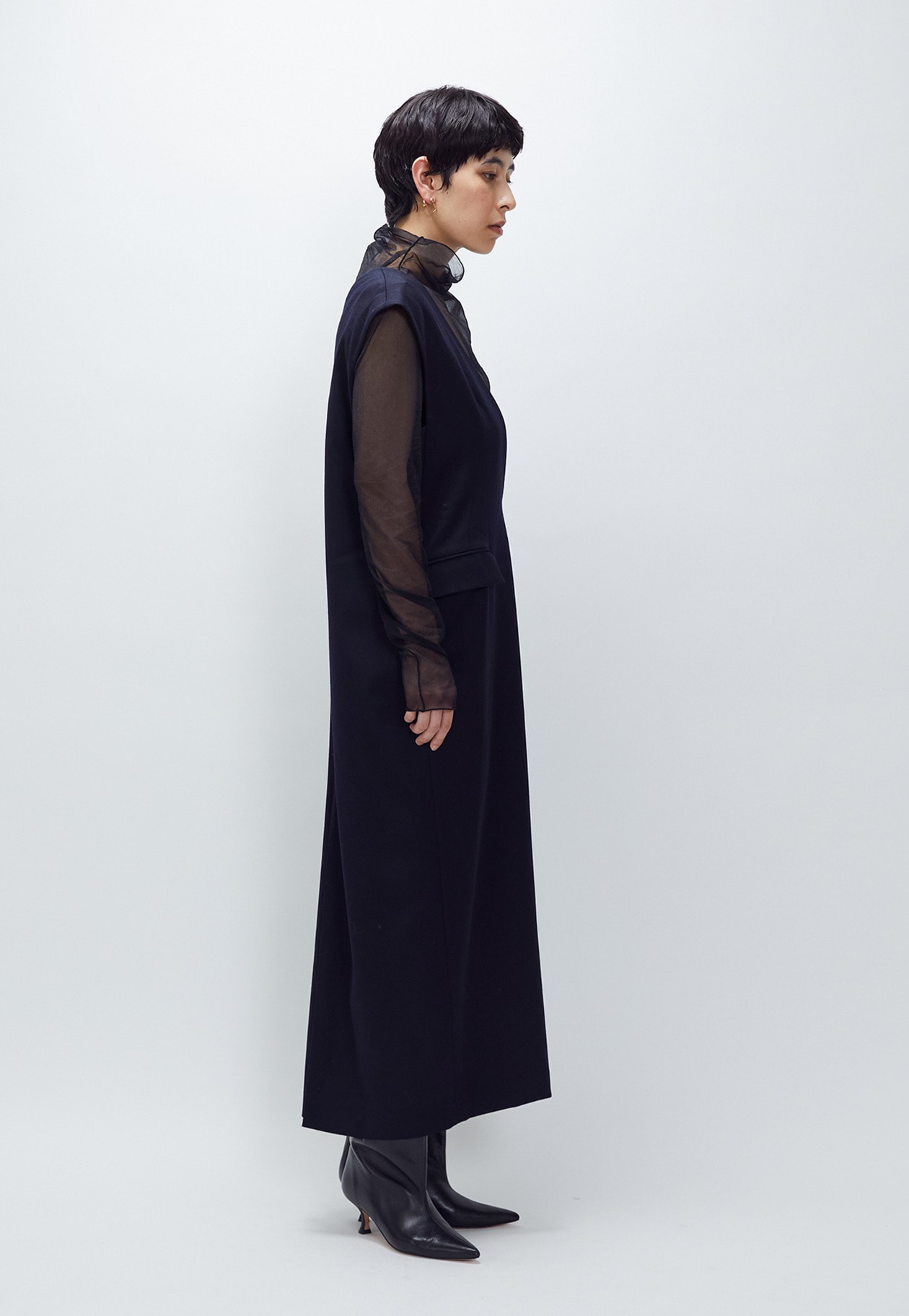 肩パッドを効かせた程よい構築感がモードな印象を与え、シアーインナーとのレイヤードで都会的な抜け感を演出します。