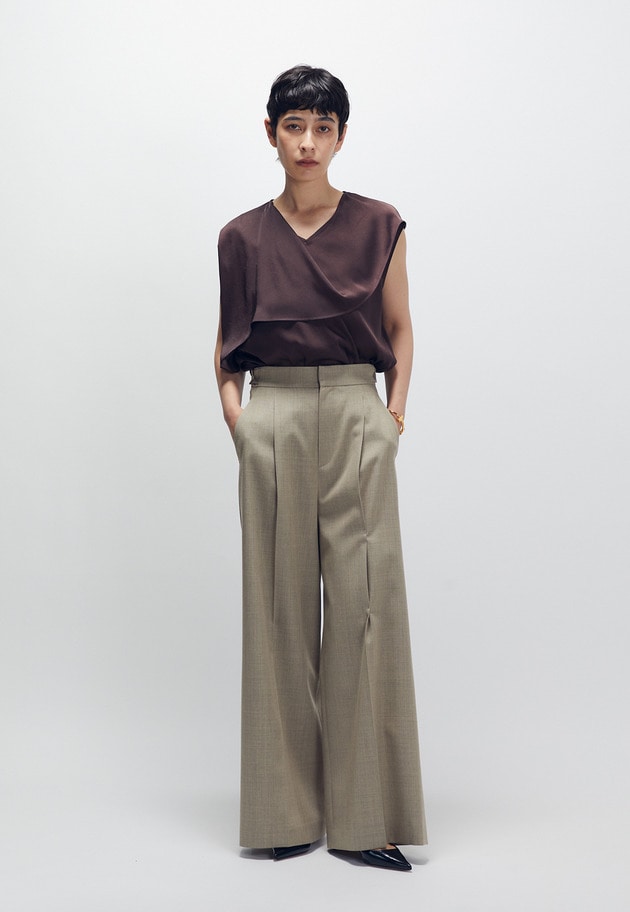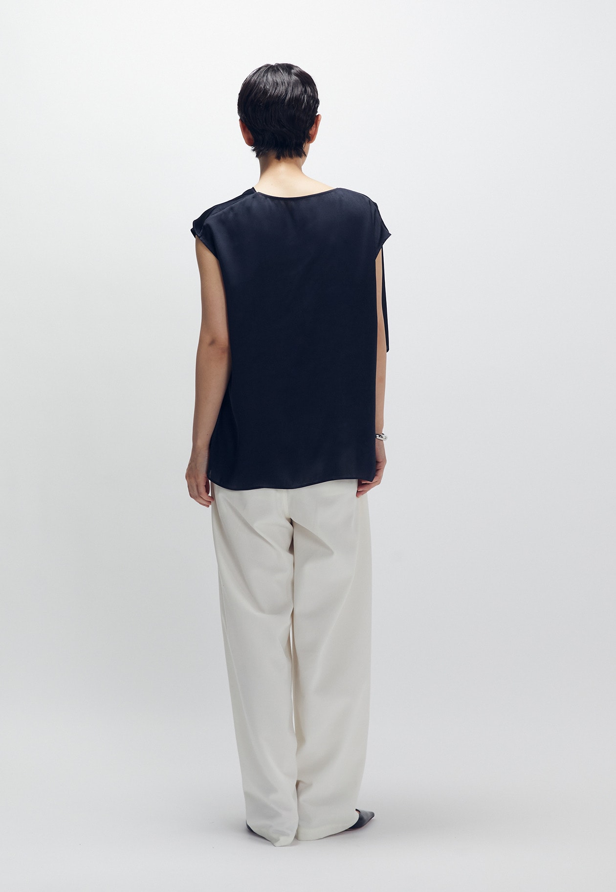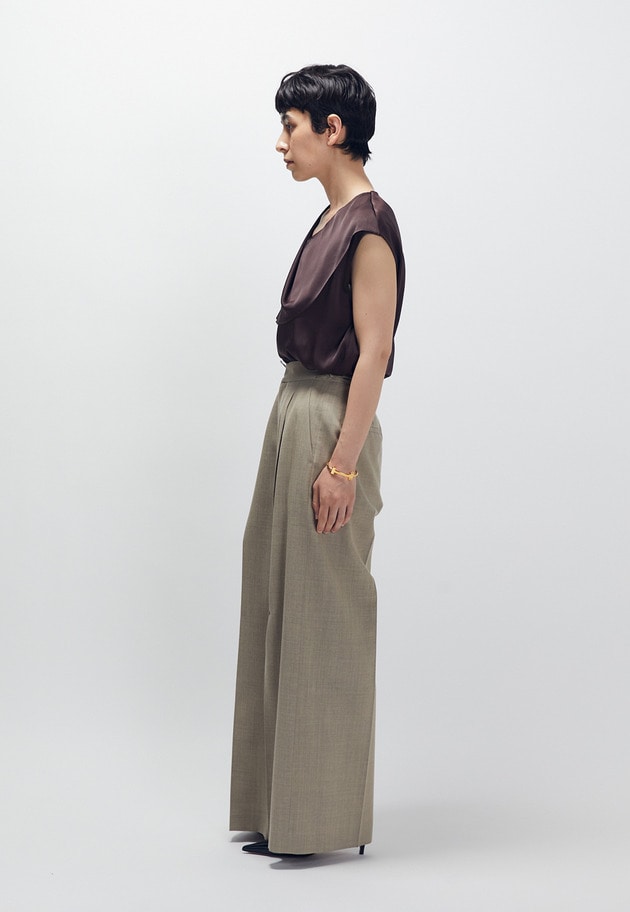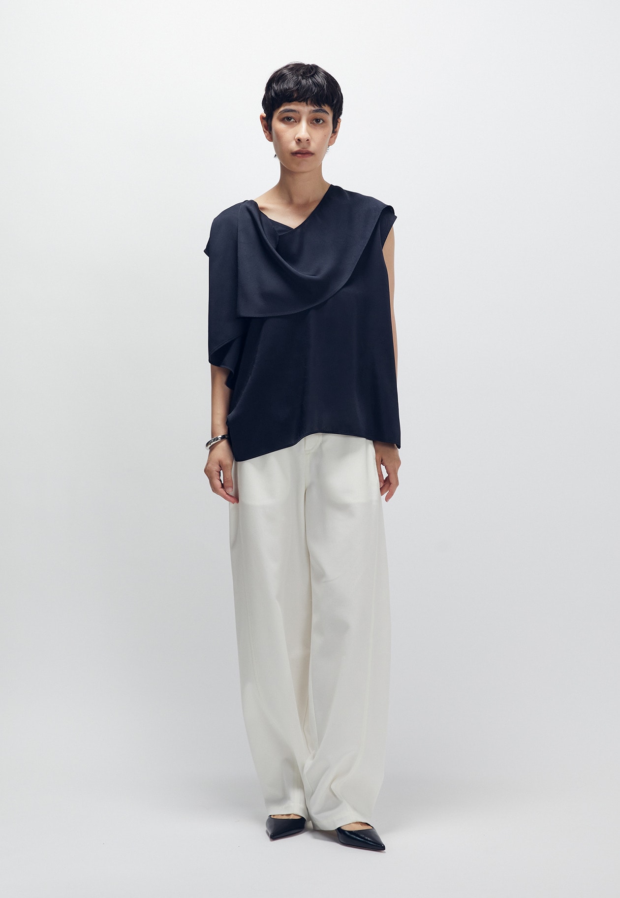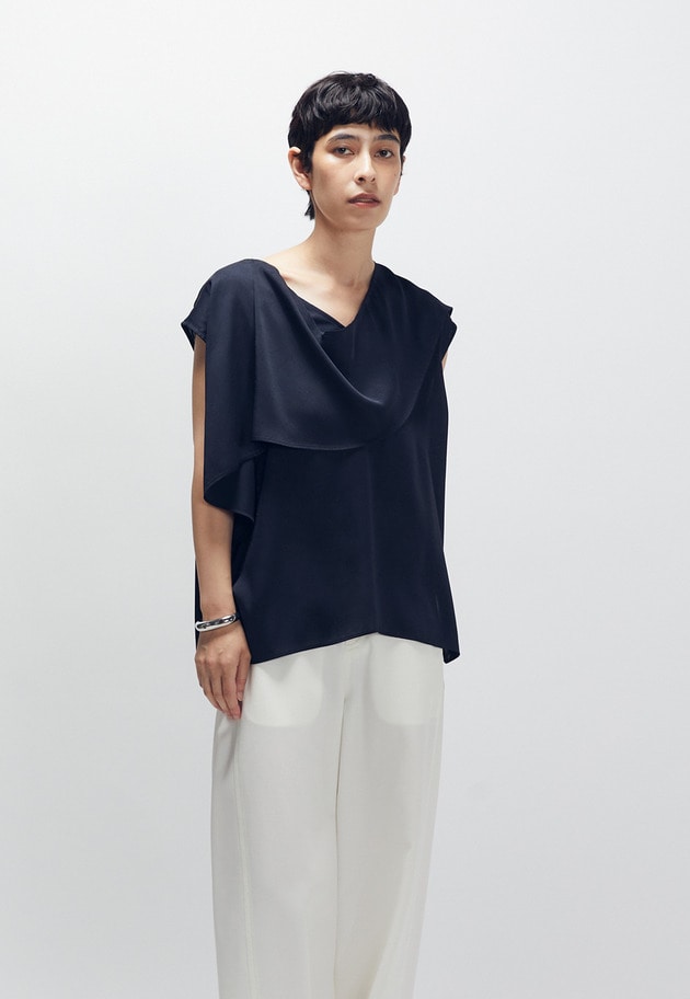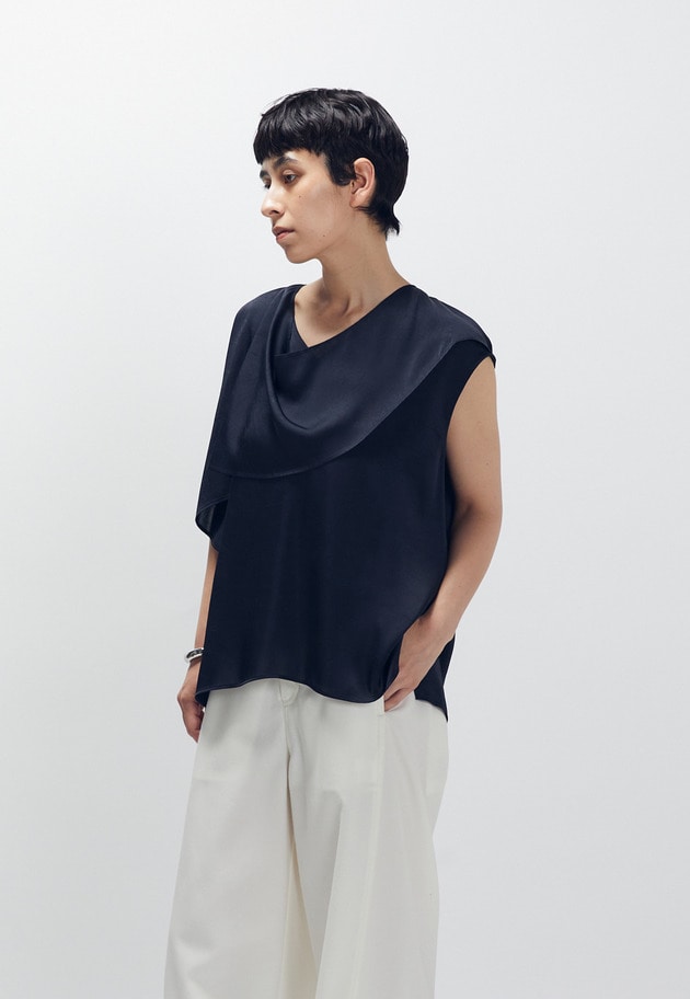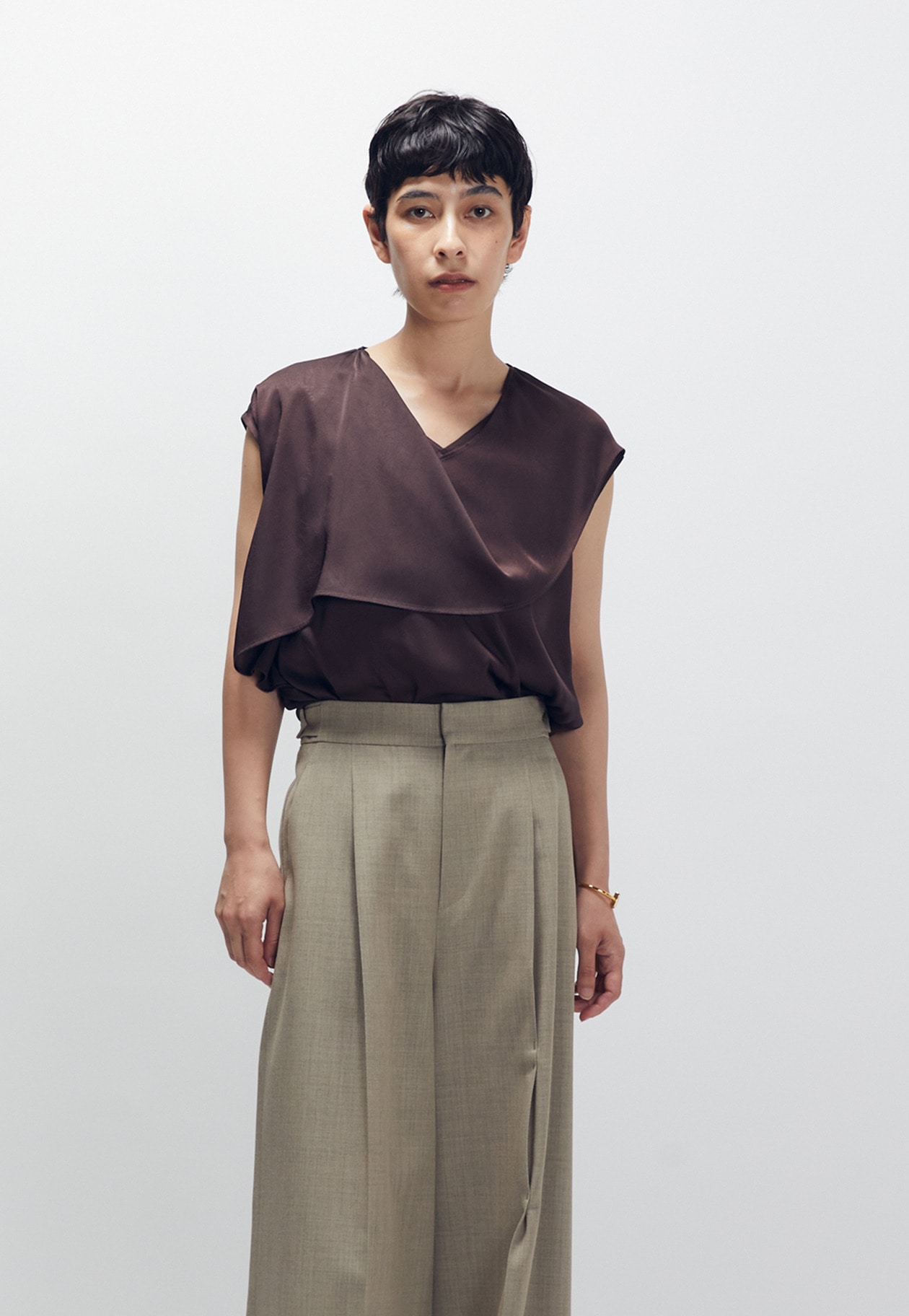 胸元にスカーフを纏ったようなアシンメトリーのノースリーブデザインブウスは、残暑厳しい時におすすめの1枚に。