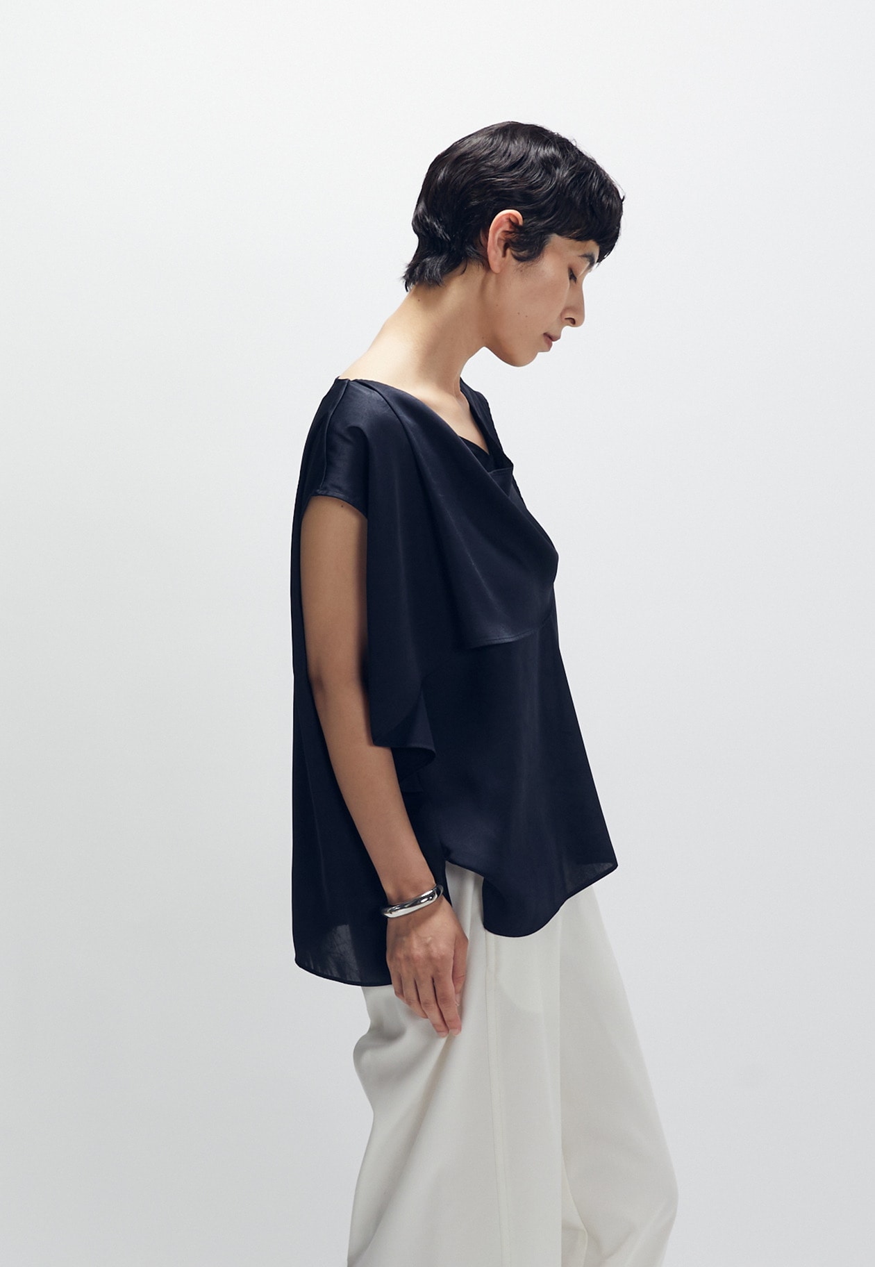 上からジャケットを羽織ることもできるエレガントなサテンブラウス。