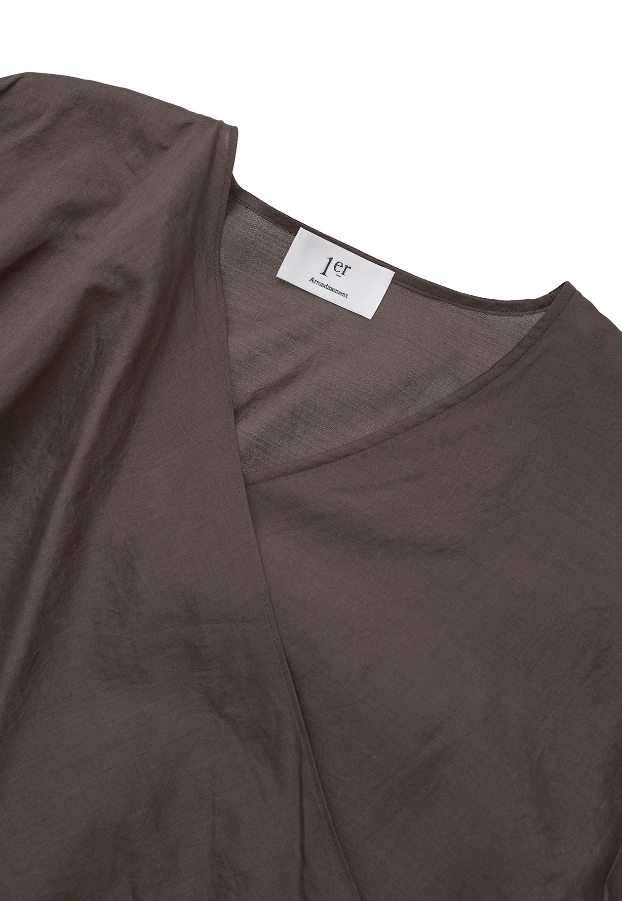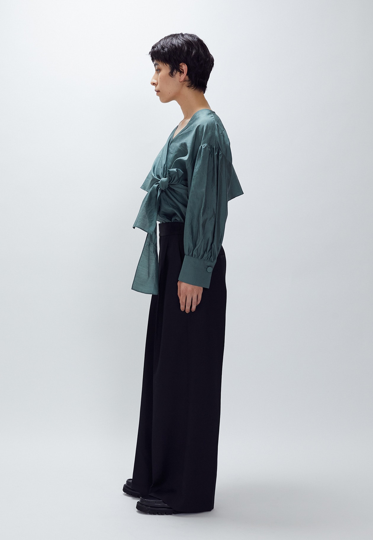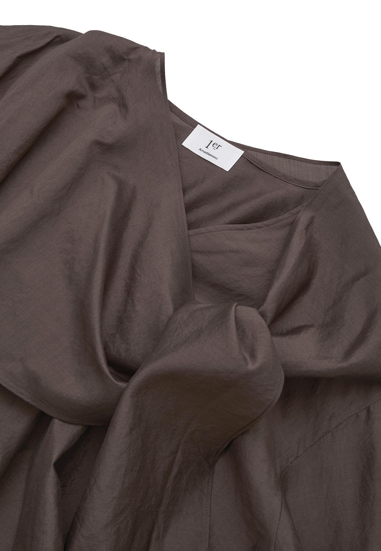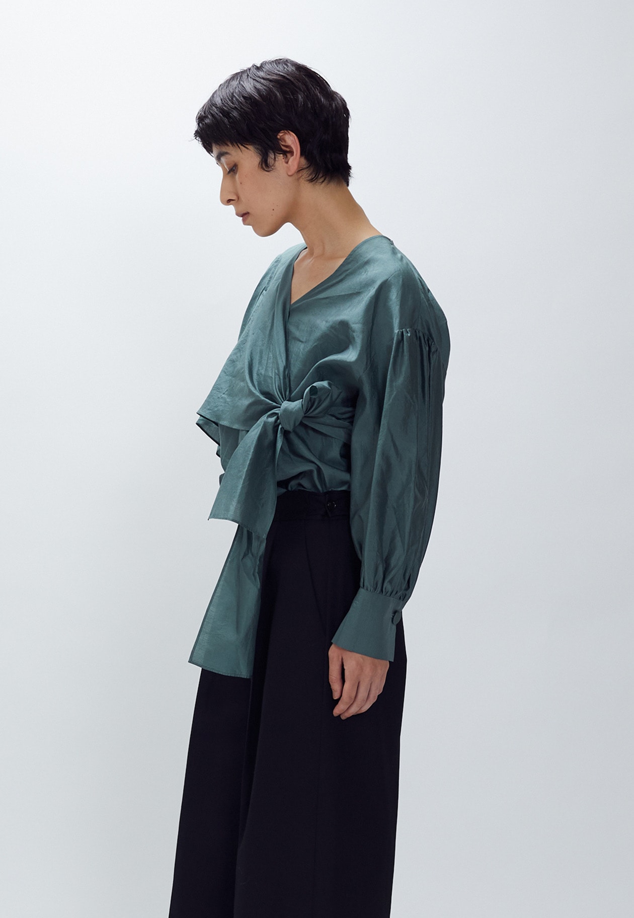 軽やかなオーガンジーシルクを贅沢に使い、肩元に大胆なボウタイを配したアシンメトリーデザインに。