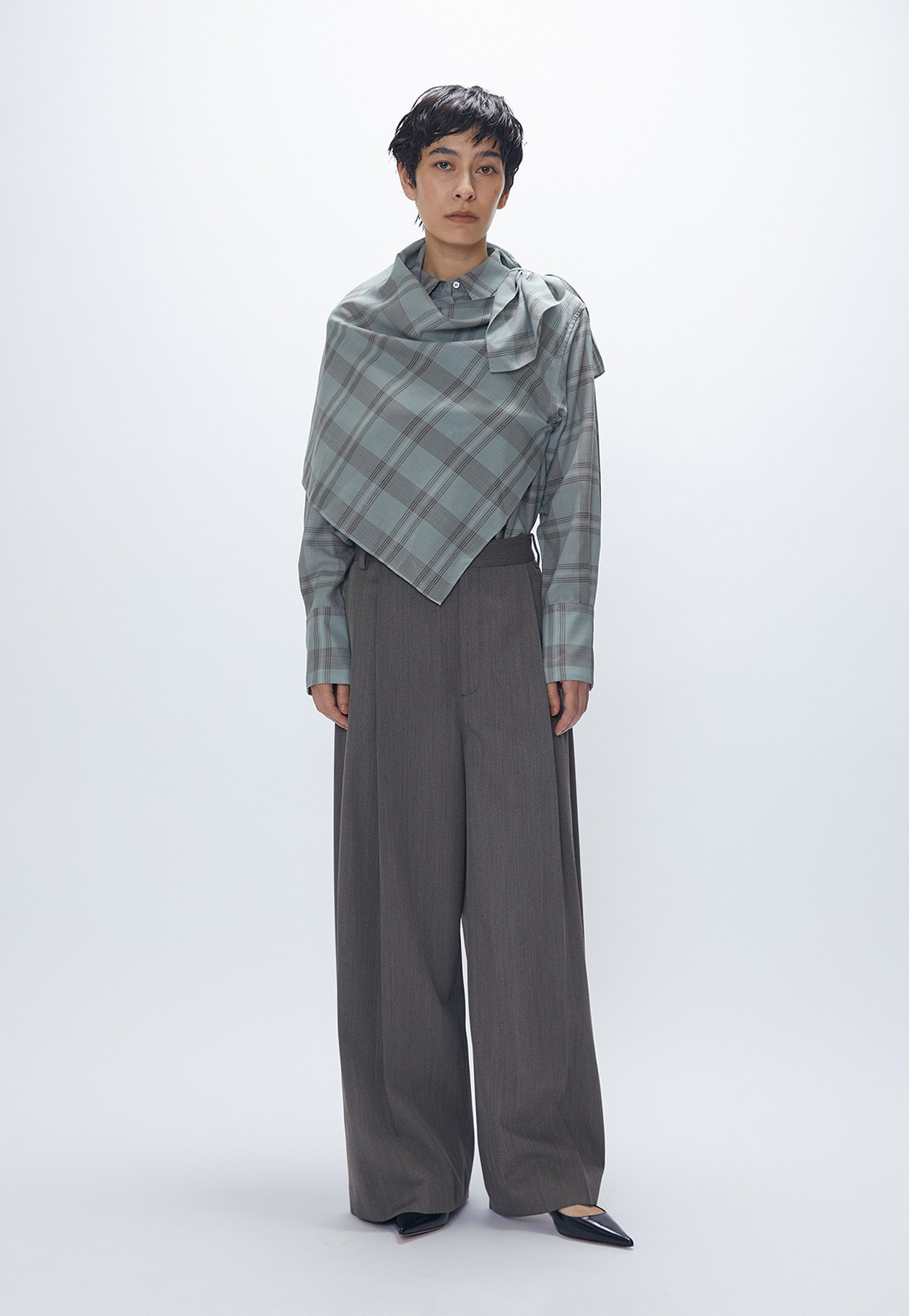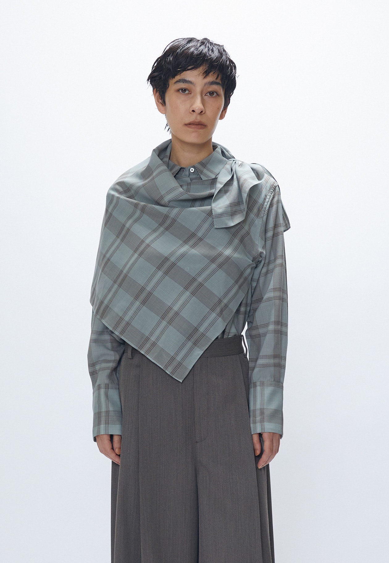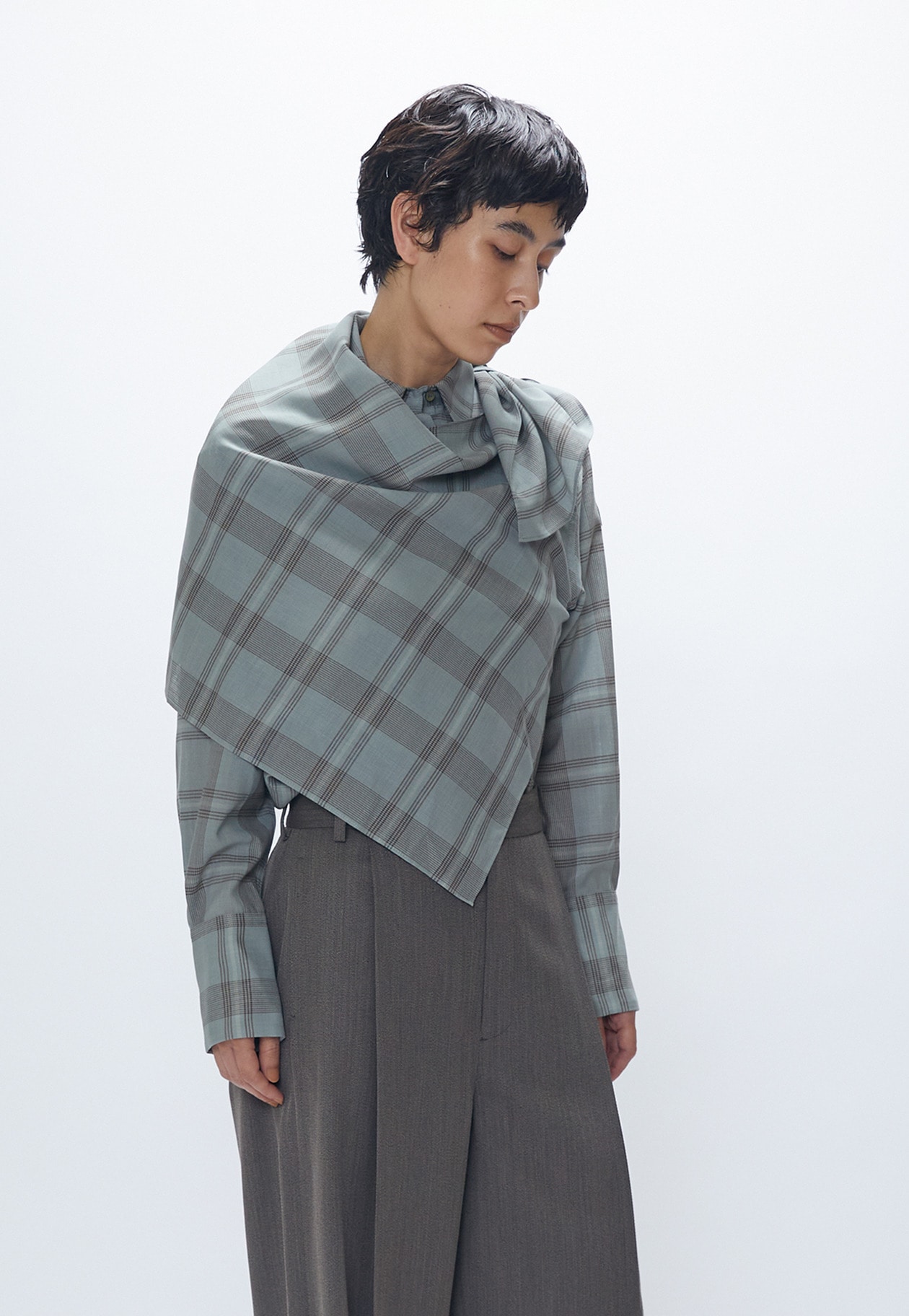 柄のズレが絶妙な遊び心を演出。肩に付いたループにスカーフの先を通すことで、アレンジも楽しめます。