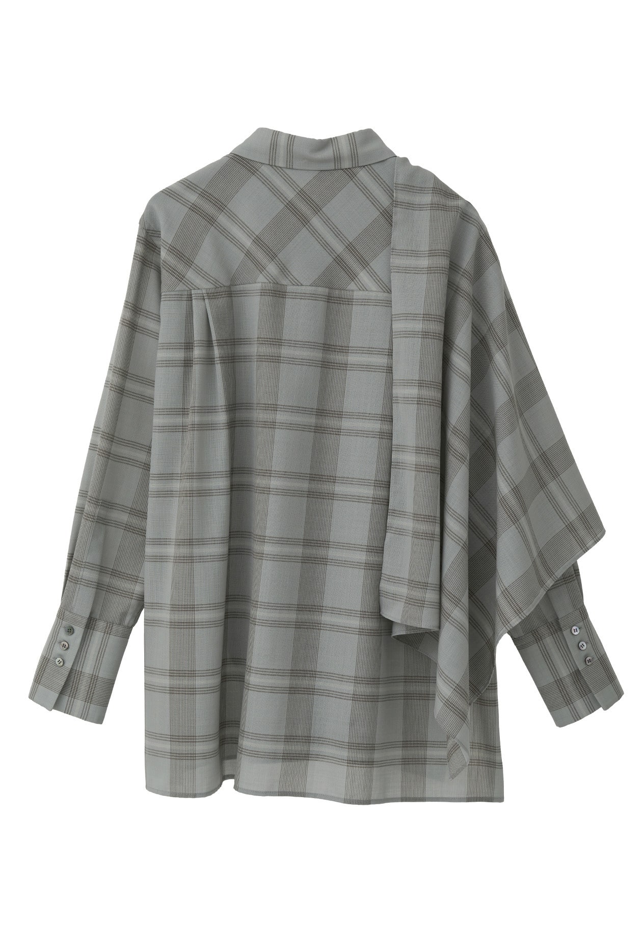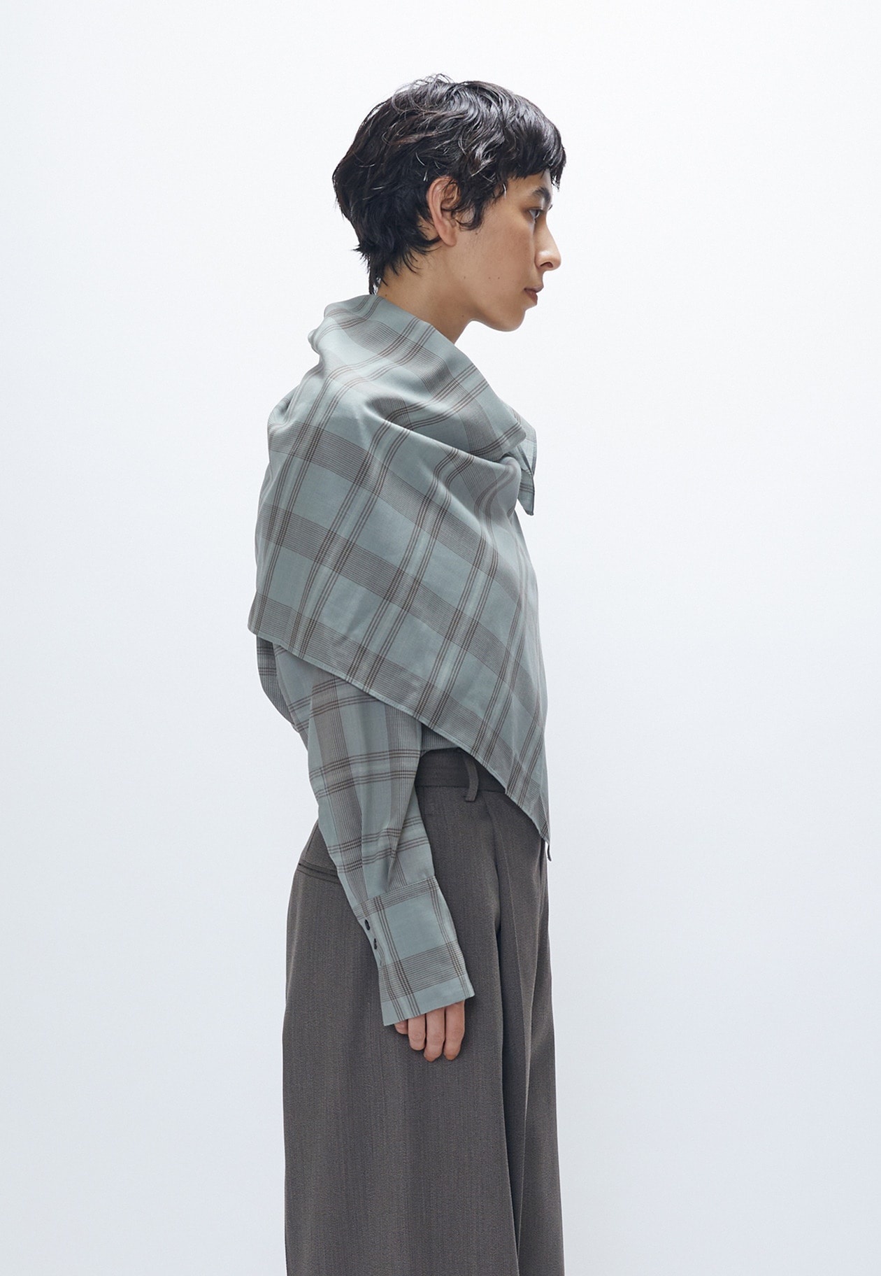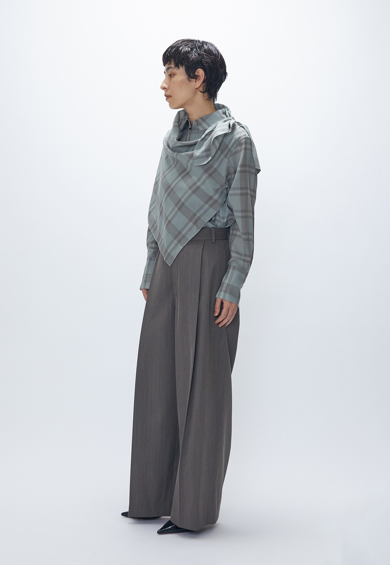 柄のズレが絶妙な遊び心を演出。肩に付いたループにスカーフの先を通すことで、アレンジも楽しめます。