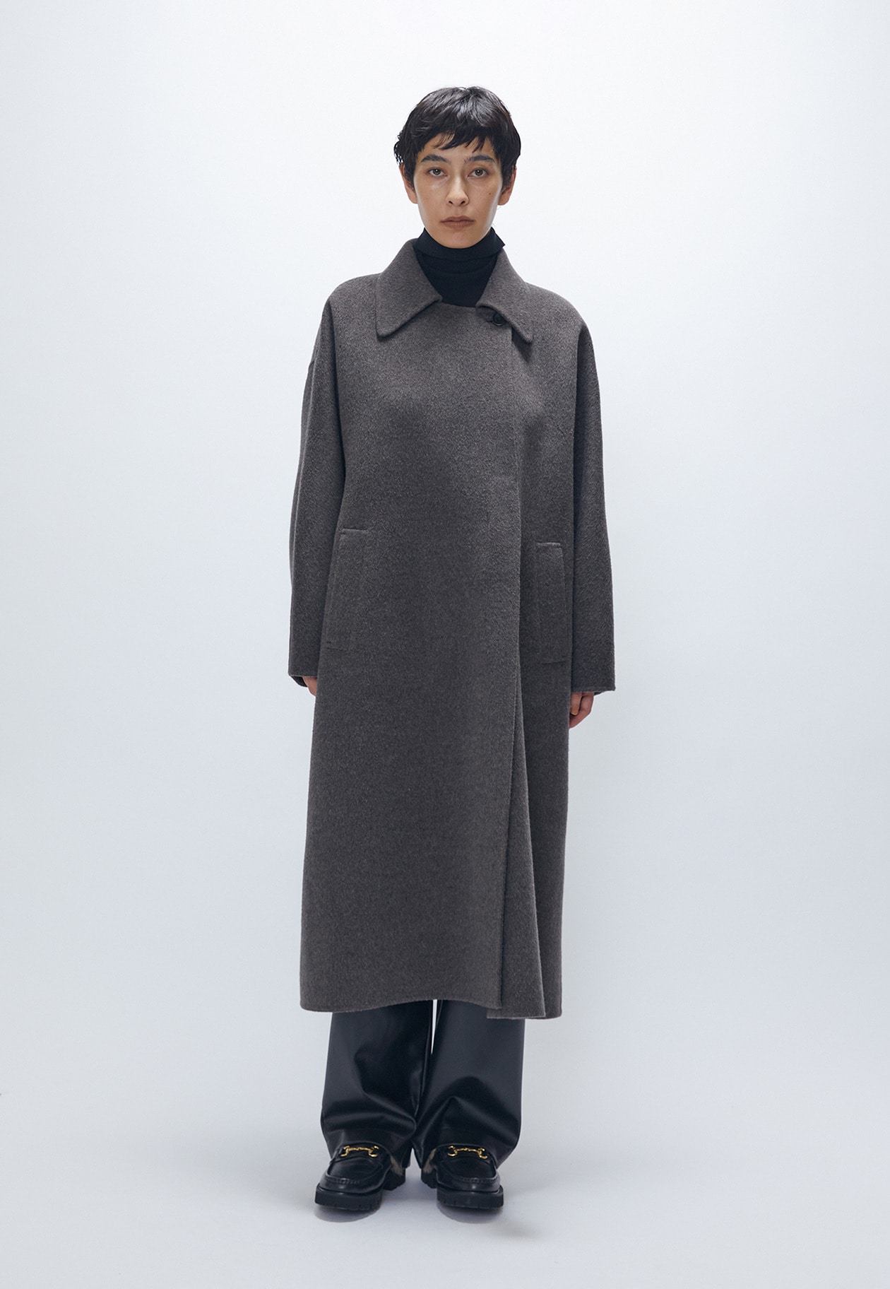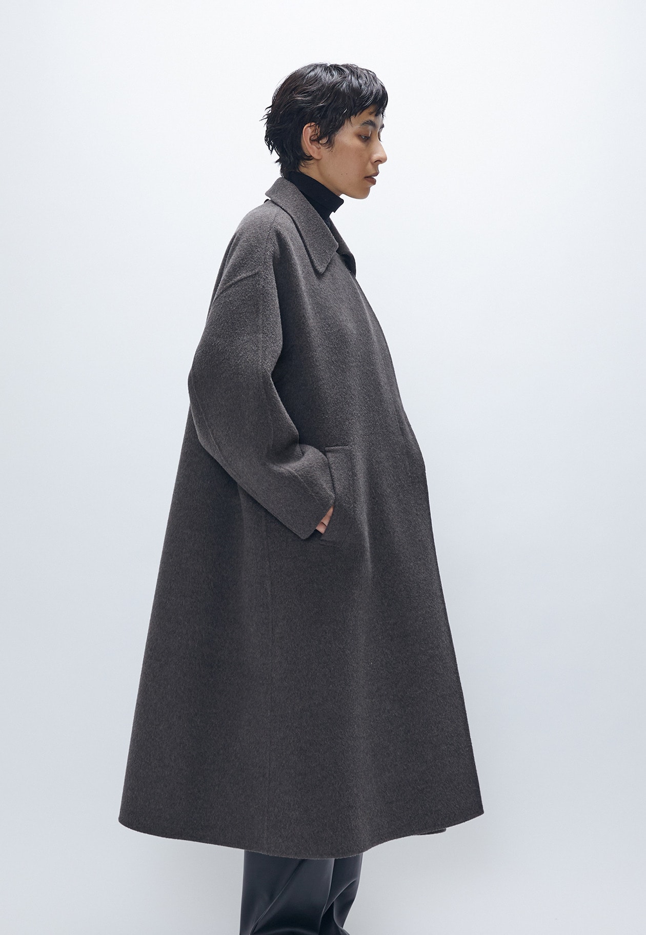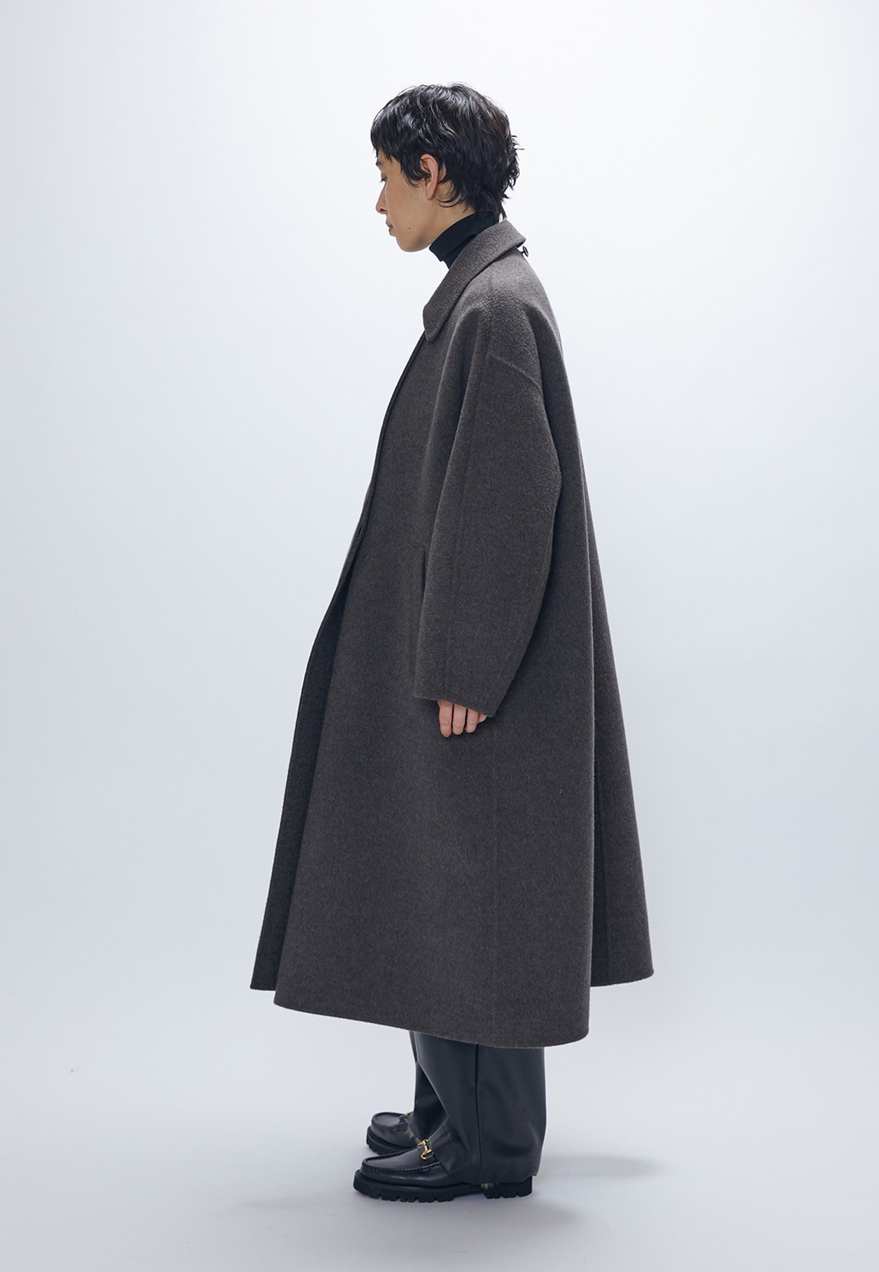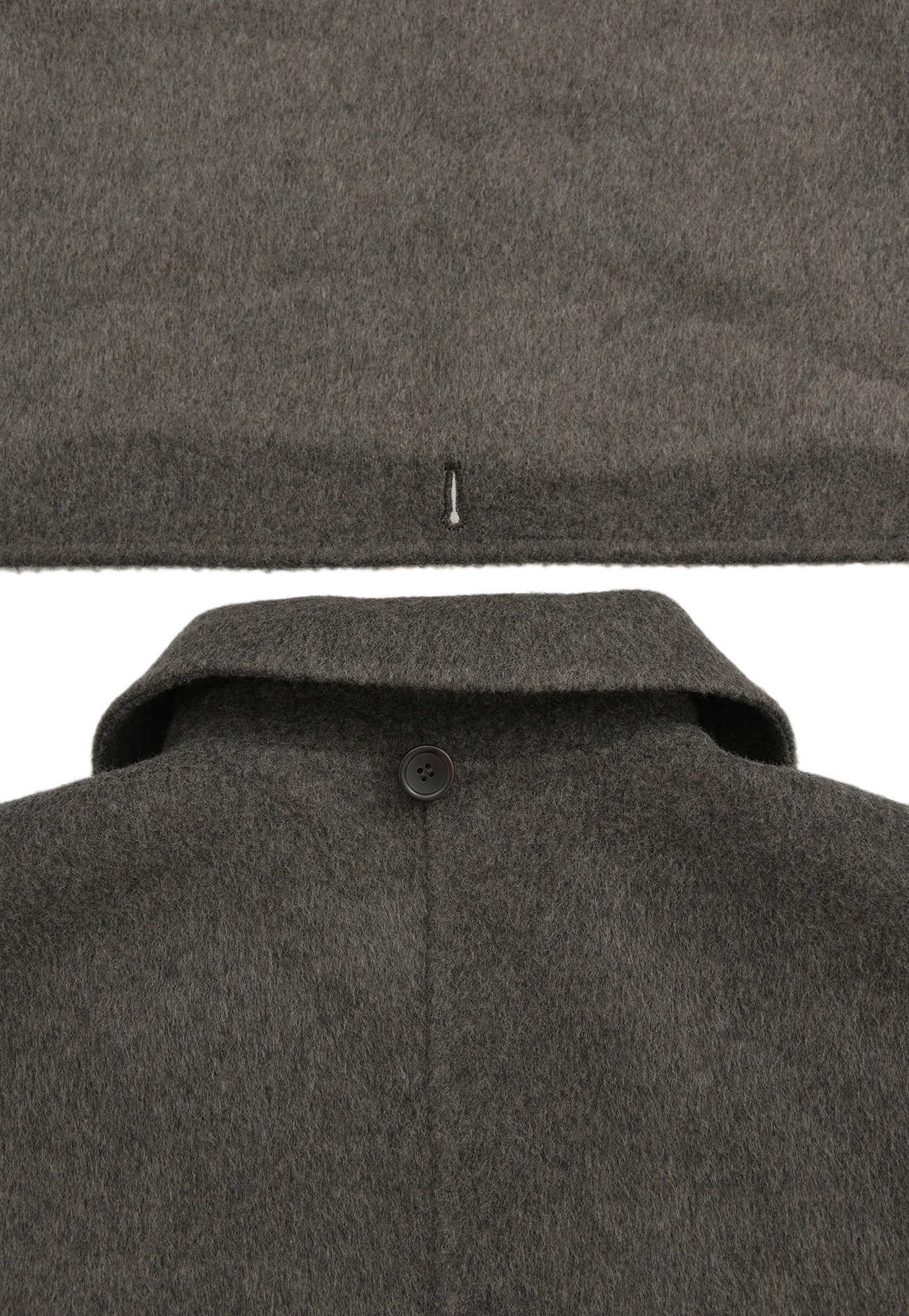 TOP糸を使用することで奥行きのある色合いを表現し、さらに艶とふくらみを持たせる高級仕上げ「両面シャルム」で仕立てたステンカラーコート。
