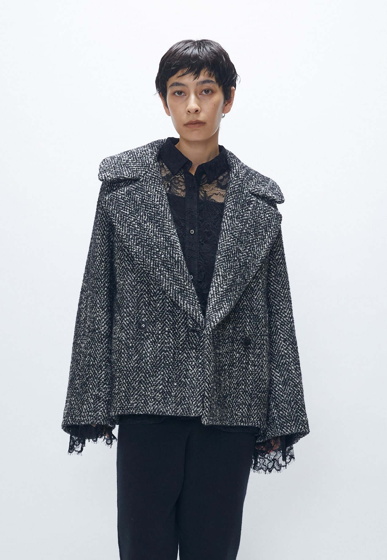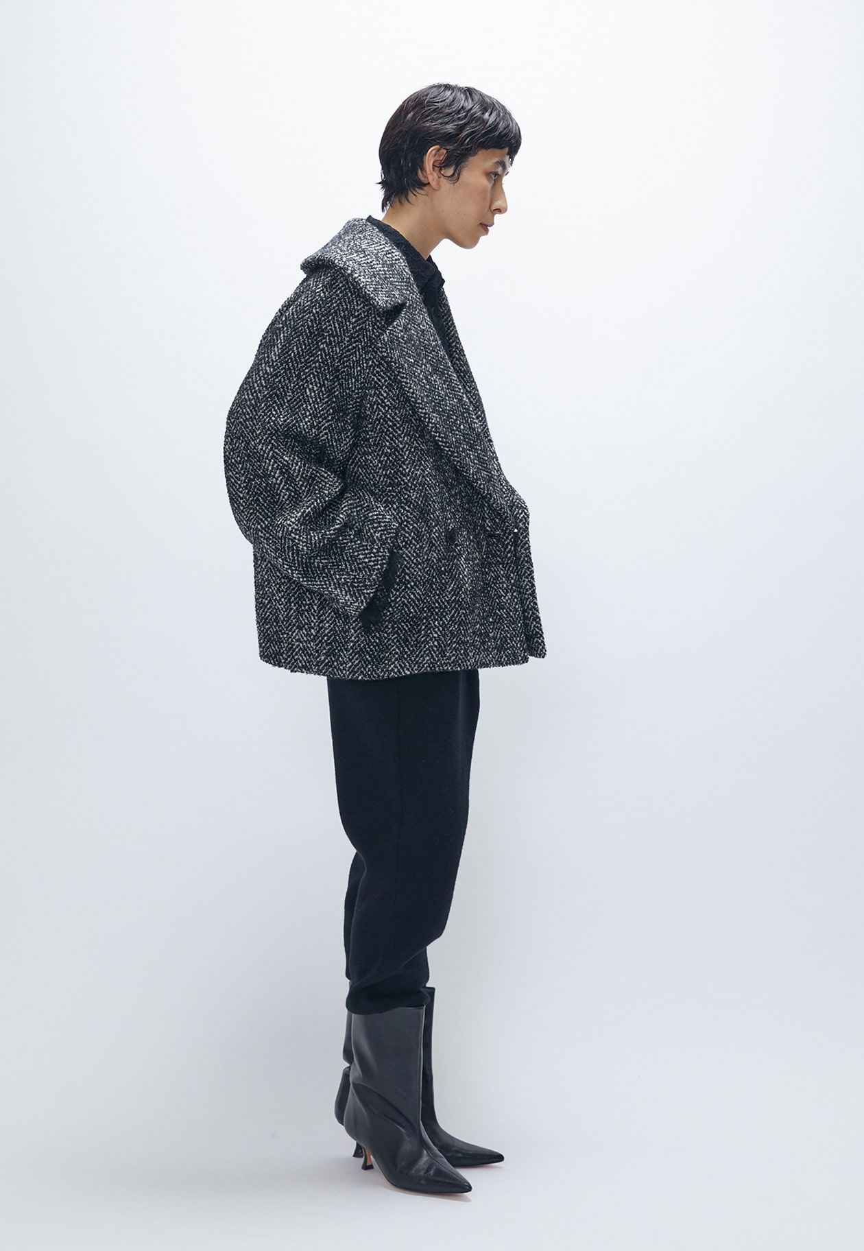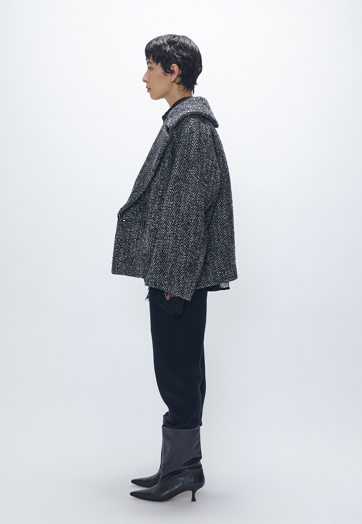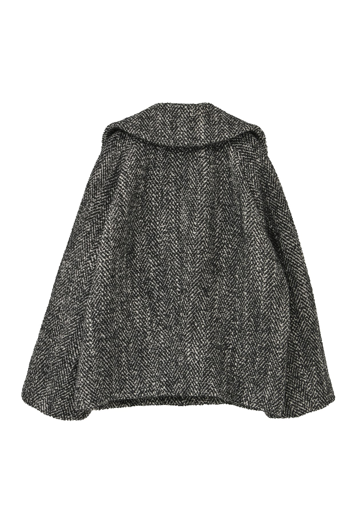 やや後ろ下がりの緩やかなコクーンシルエットが優しい印象を与え、大きめの襟が顔まわりを華やかに演出。