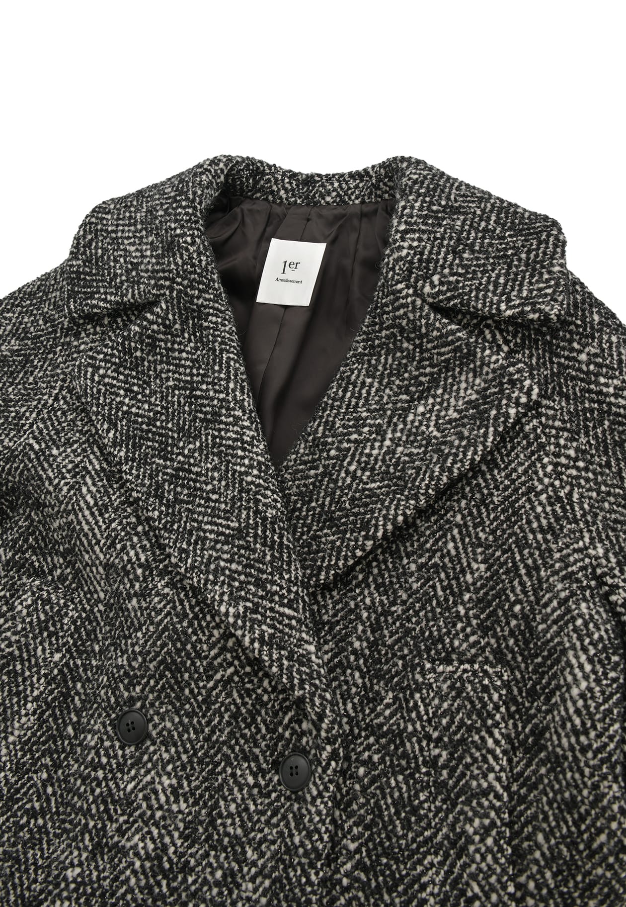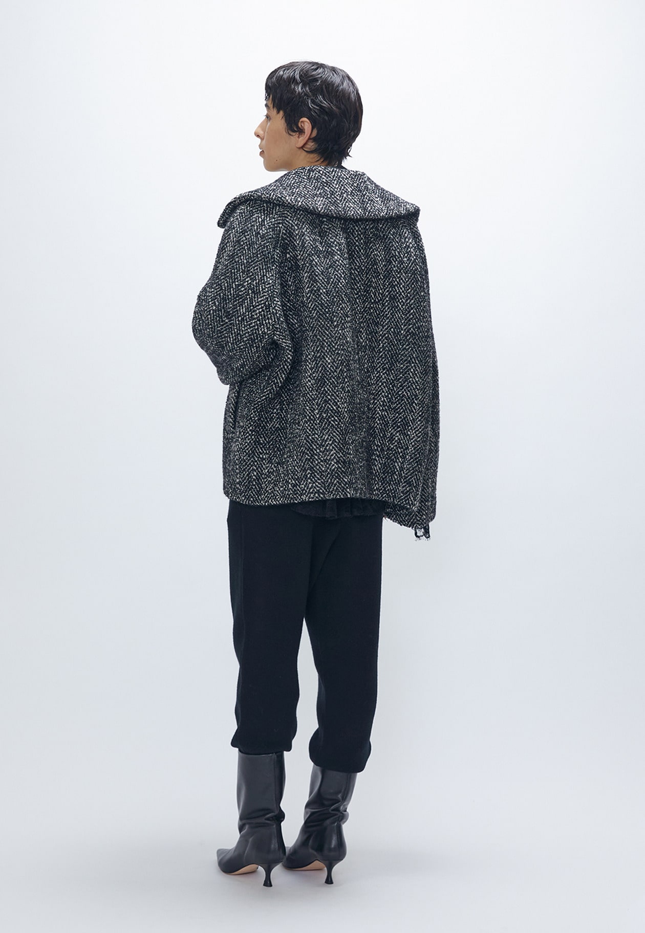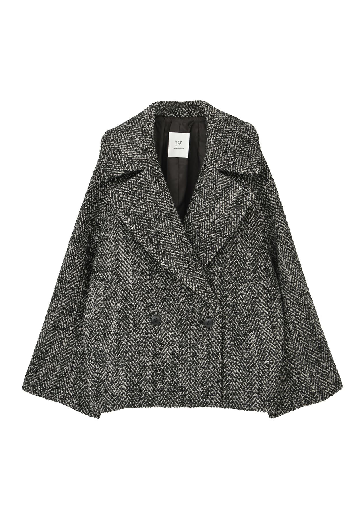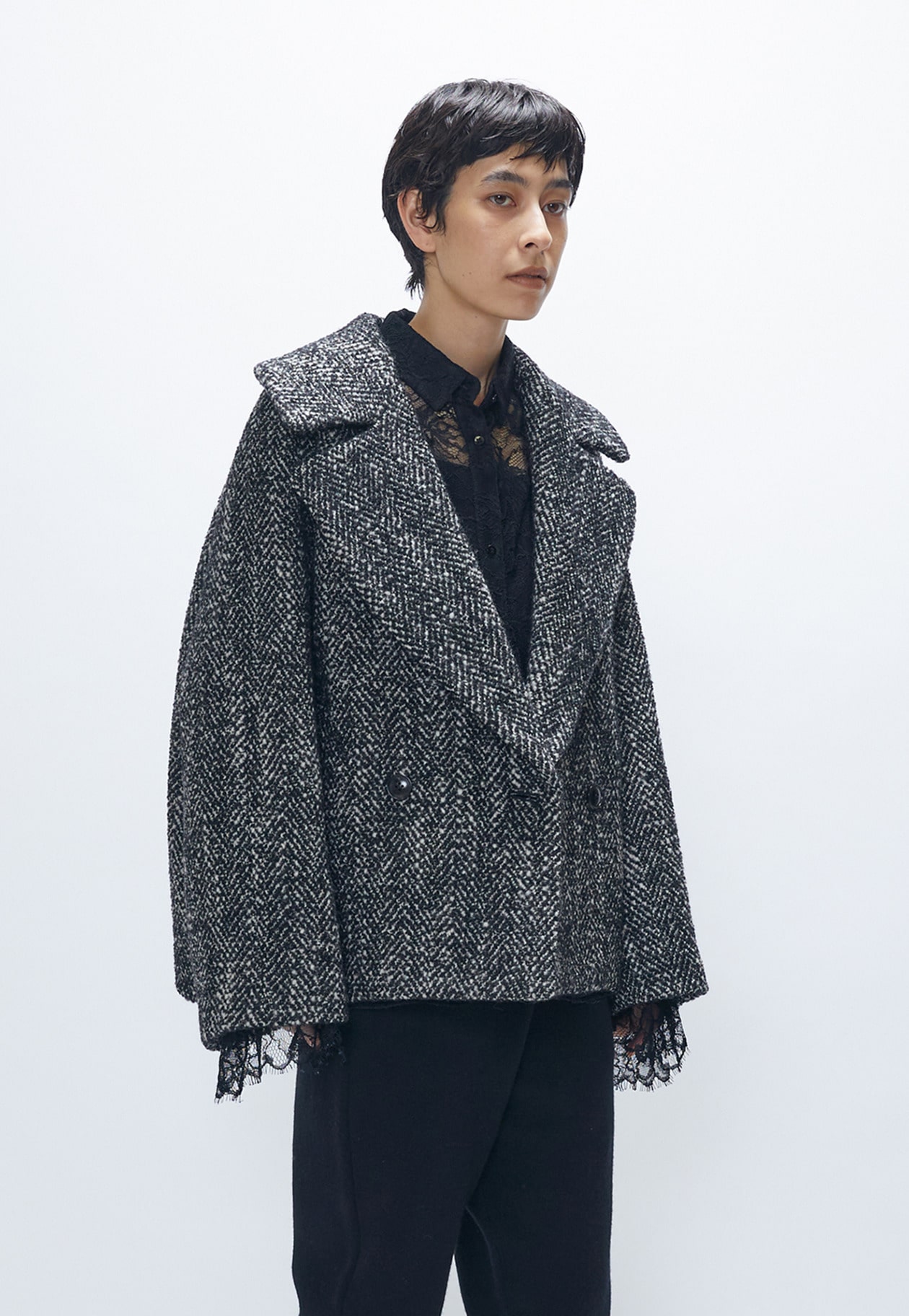 やや後ろ下がりの緩やかなコクーンシルエットが優しい印象を与え、大きめの襟が顔まわりを華やかに演出。