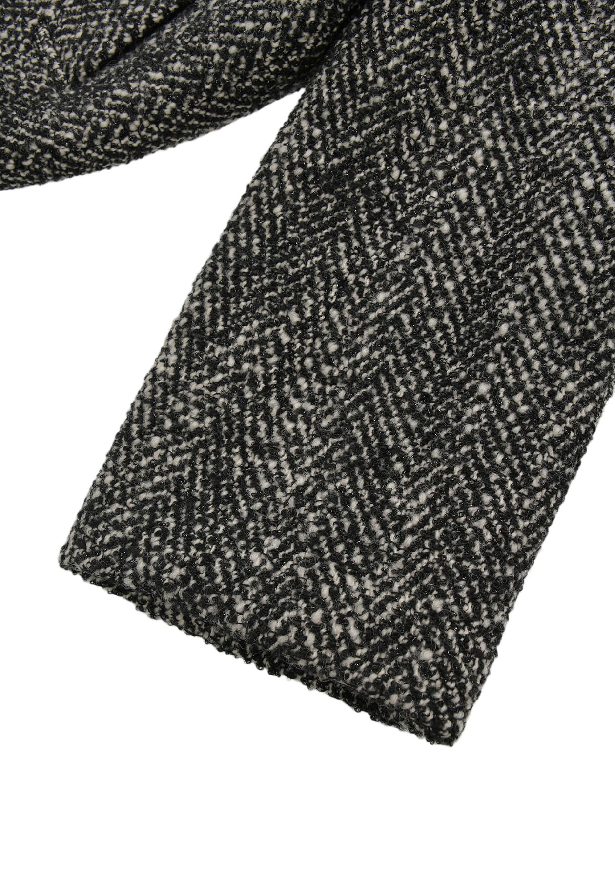 不規則な凹凸と立体感を生むスラブ糸に、繊細な光沢を放つラメ糸を組み合わせた、日本製オリジナルのヘリンボンラメツイード生地を使用。