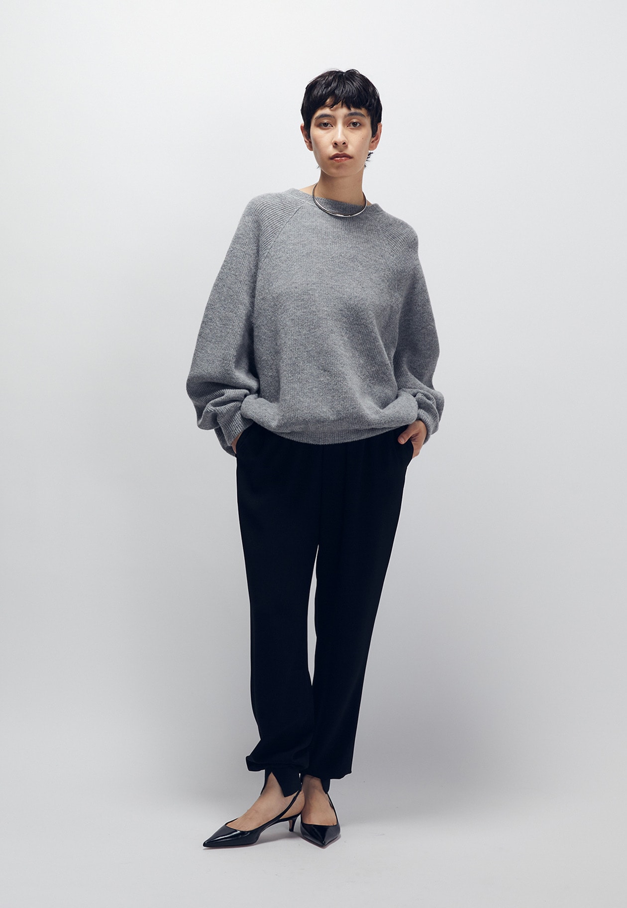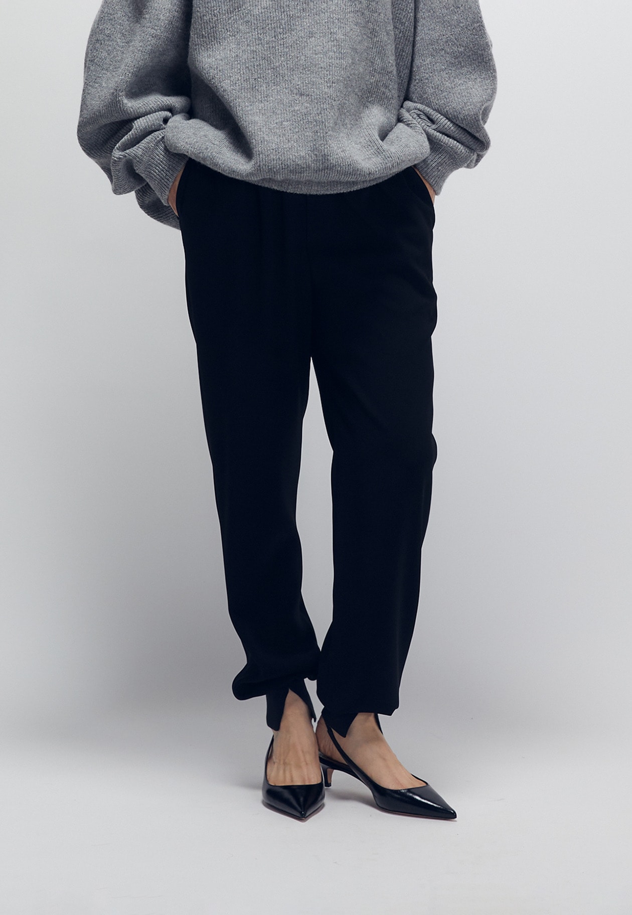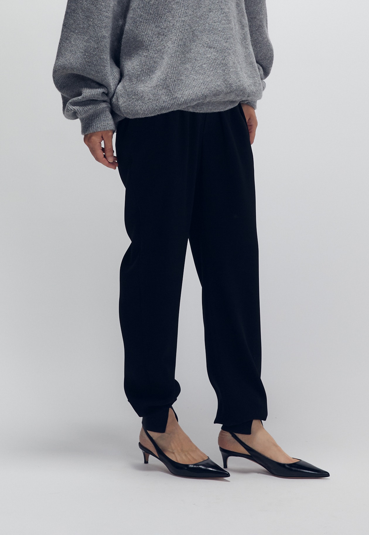 特殊な撚糸をしているので、おちすぎないドレープ感が魅力です。裾のリブにセンタースリットをいれているので、脚の甲を美しく見せてくれます。