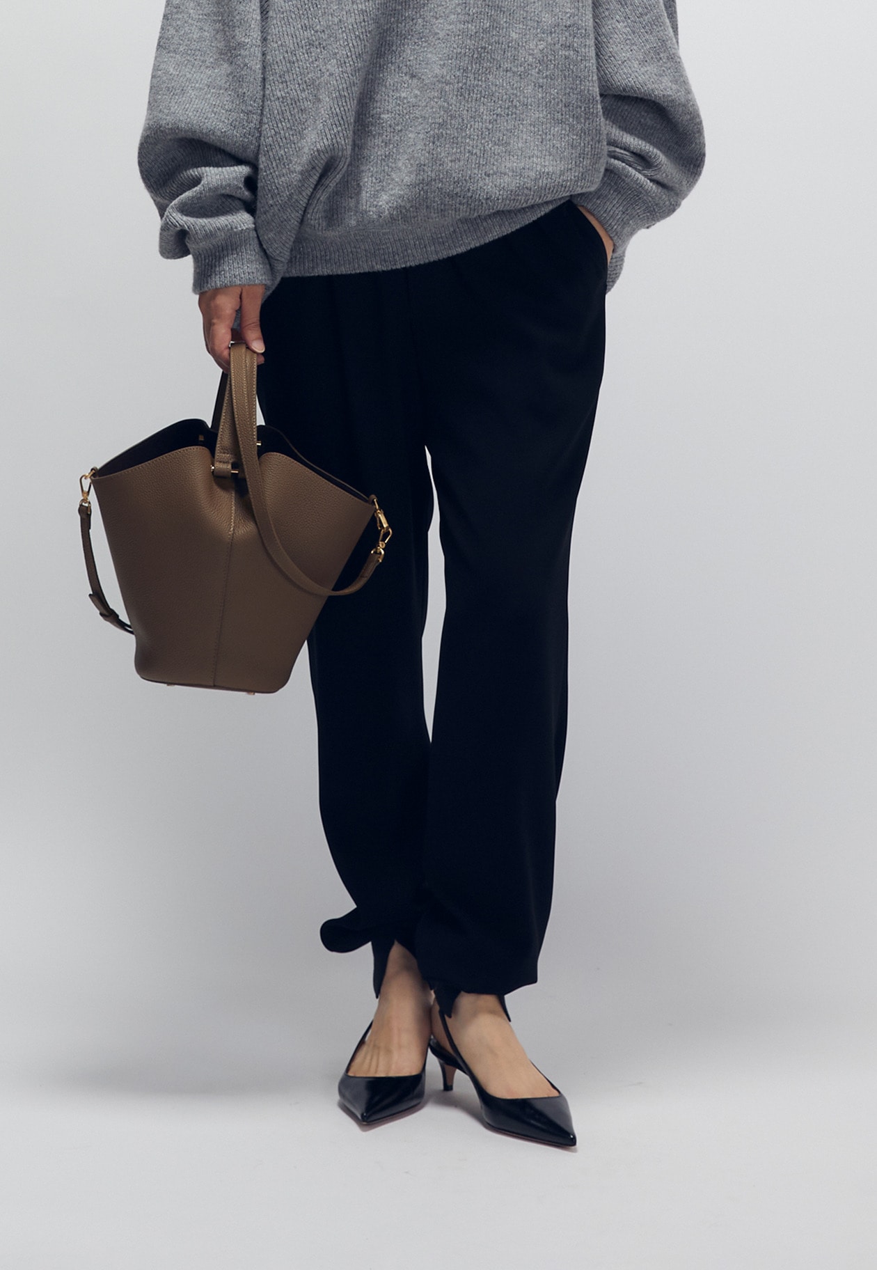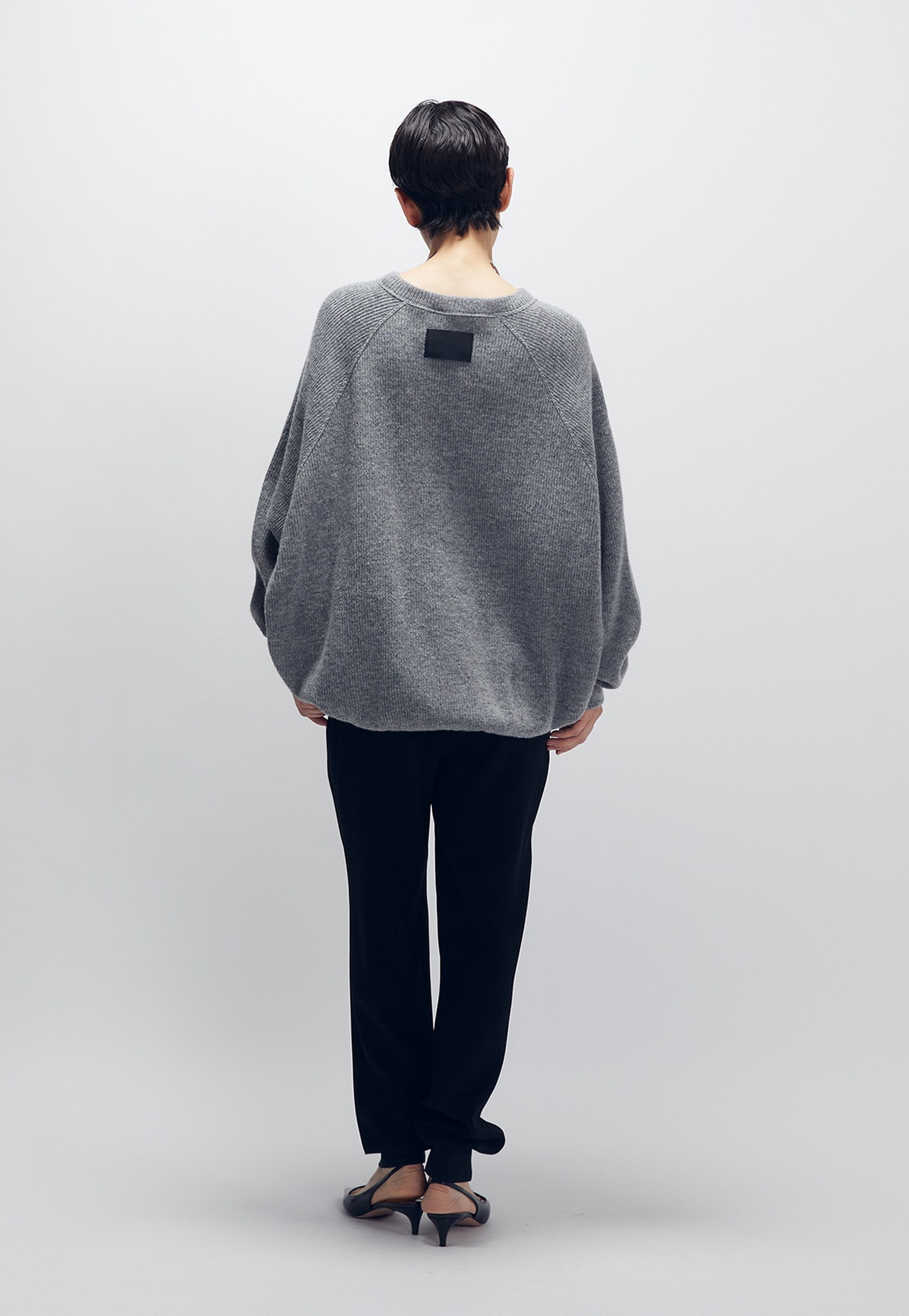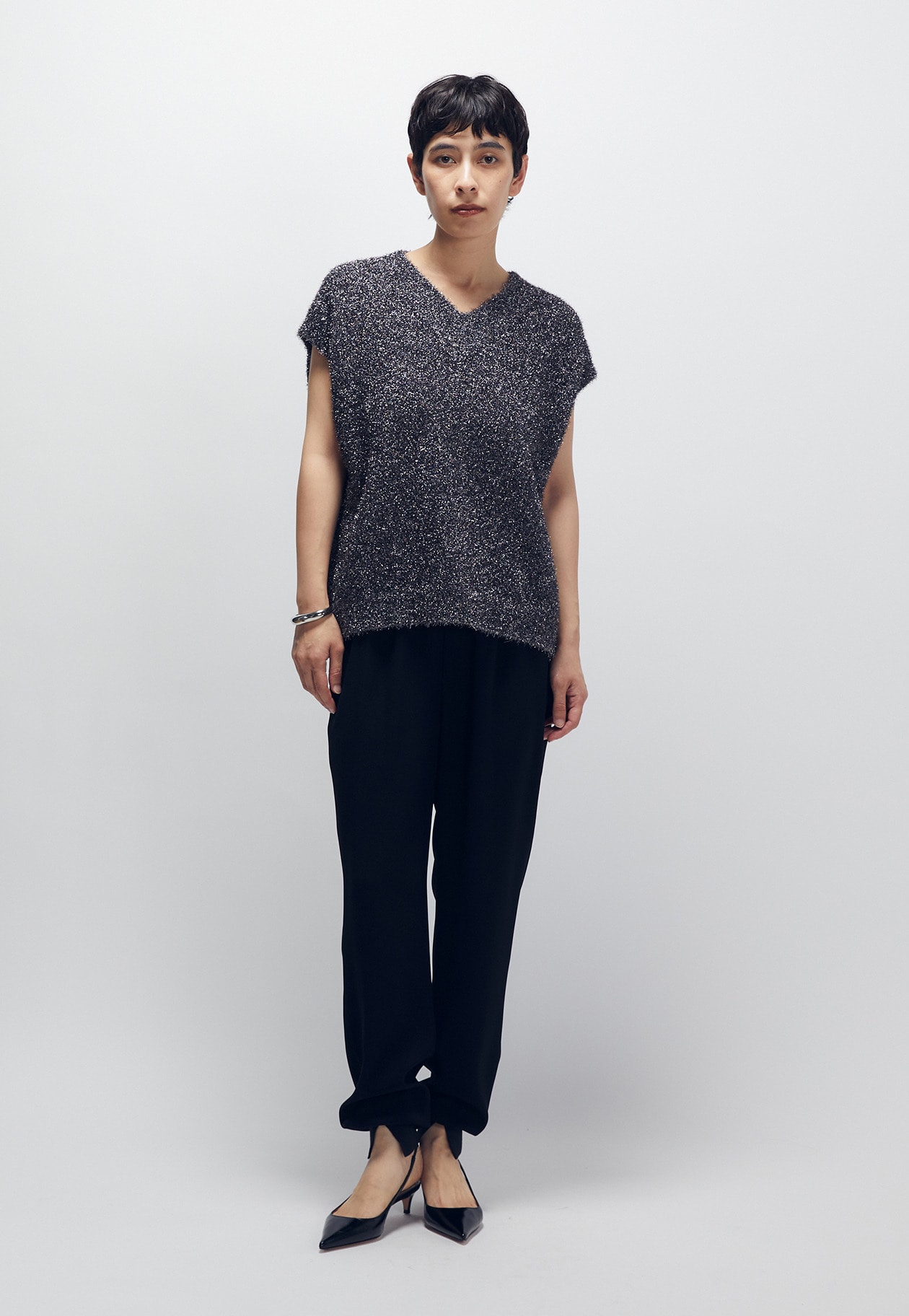 特殊な撚糸をしているので、おちすぎないドレープ感が魅力です。裾のリブにセンタースリットをいれているので、脚の甲を美しく見せてくれます。
