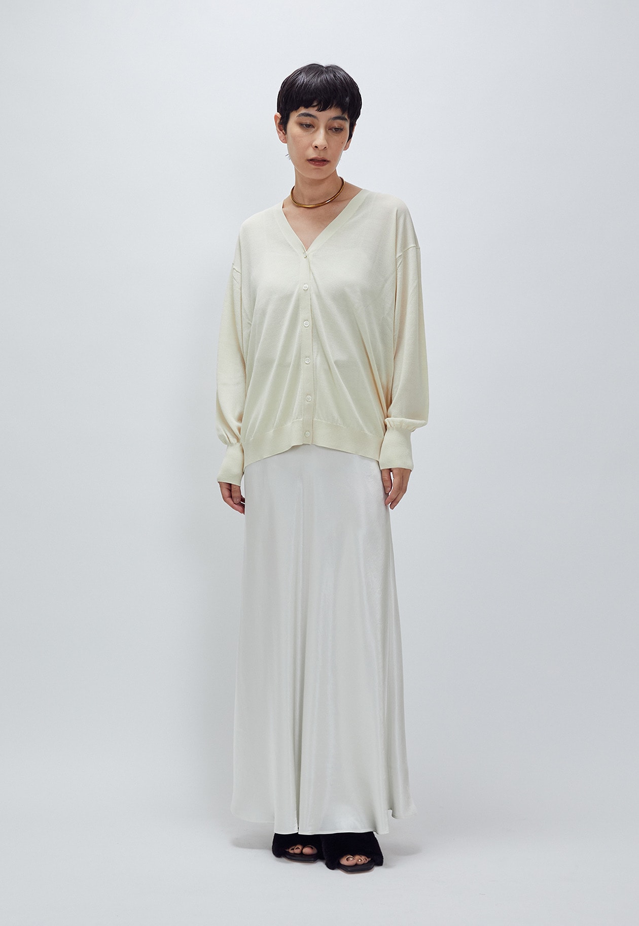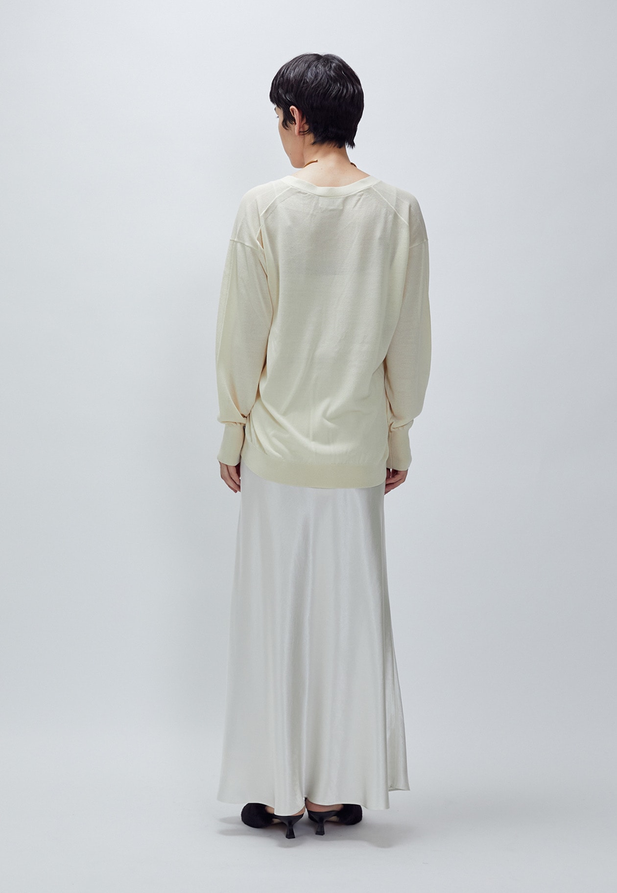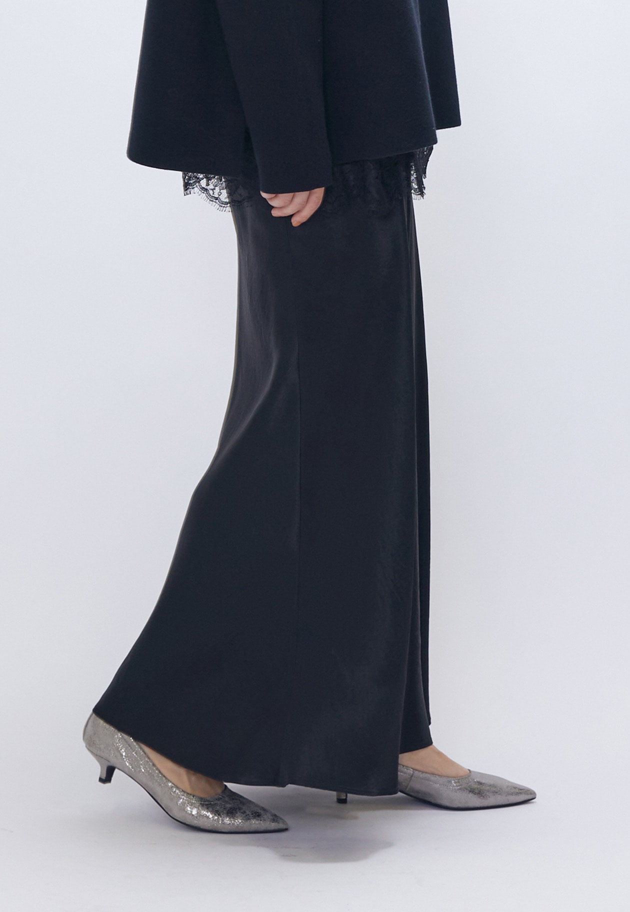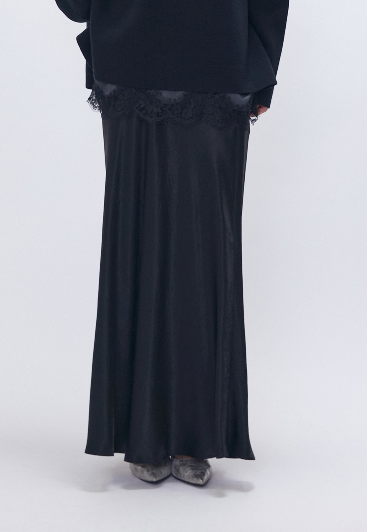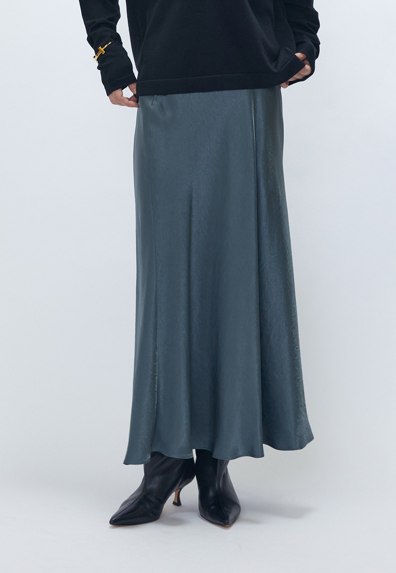 バイヤスカットで身体のラインに自然に馴染むヴィンテージサテンスカート。