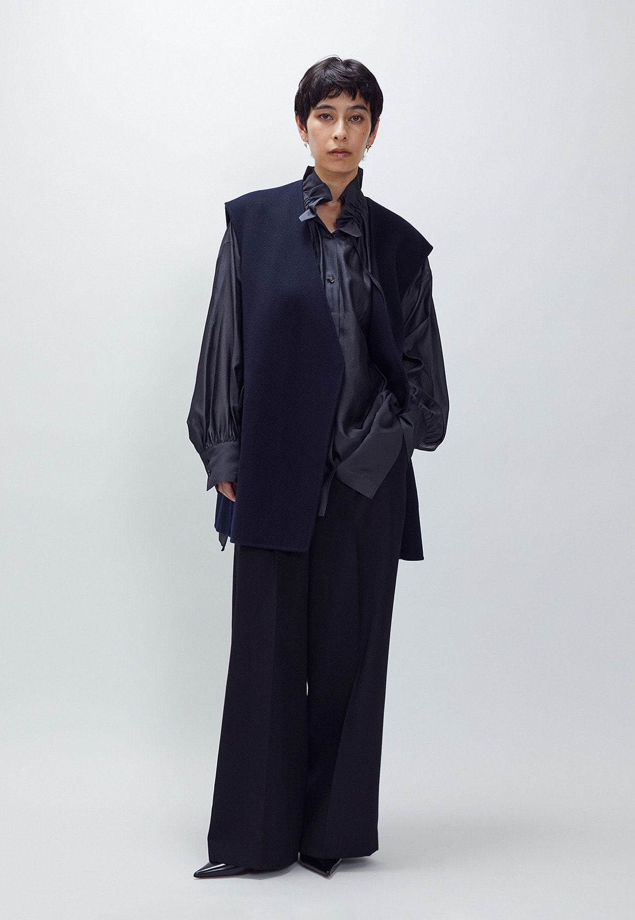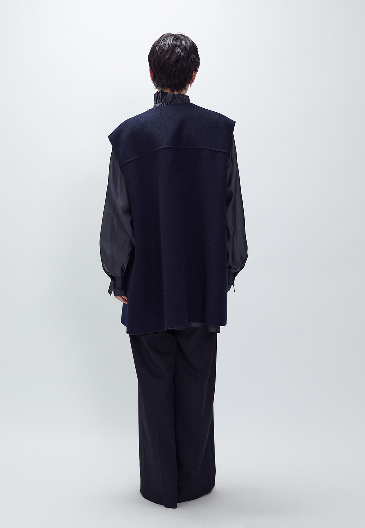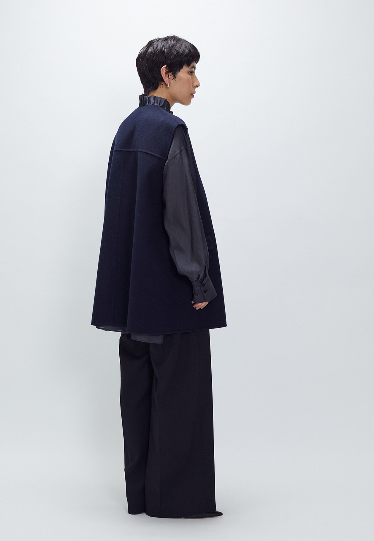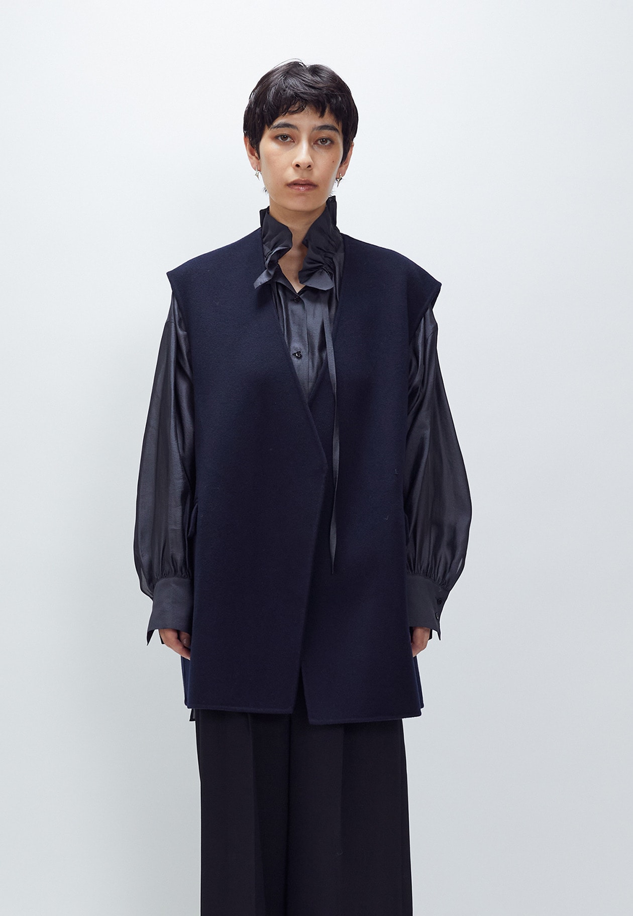 深めの打合せとゆったりしたシルエットで、一枚羽織るだけでエレガントな印象に魅せてくれます。