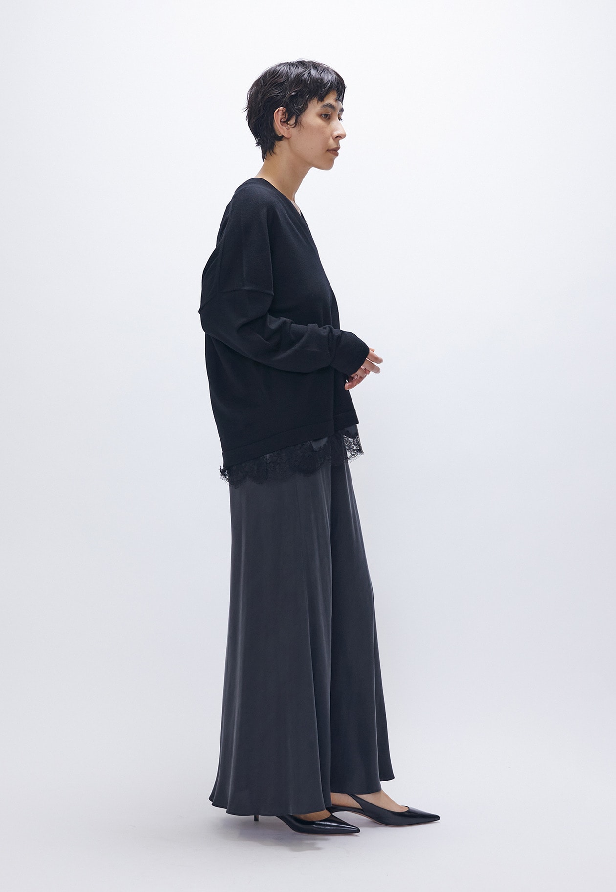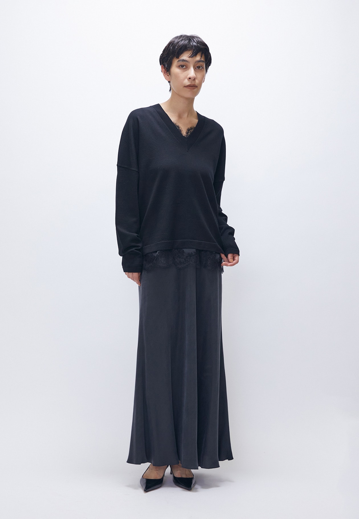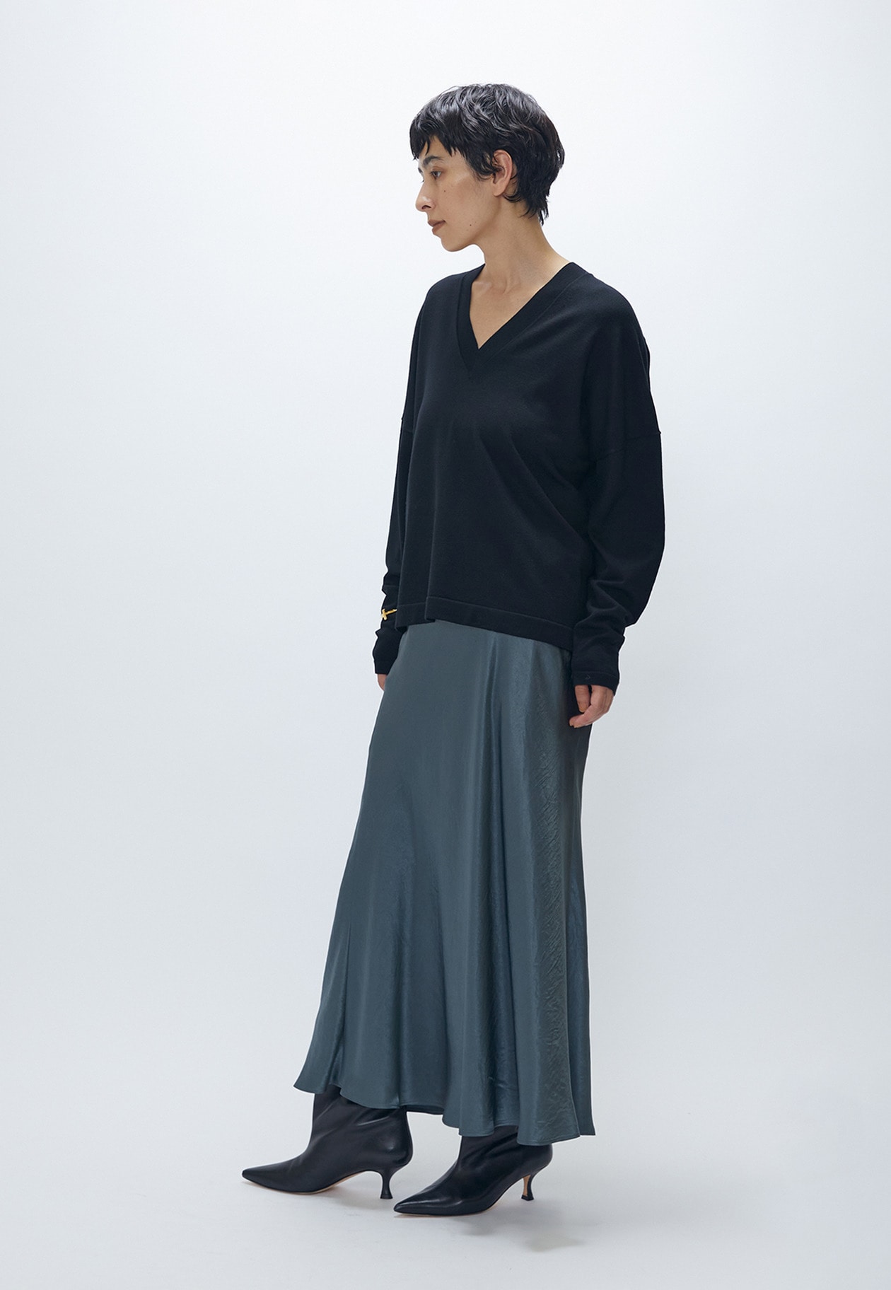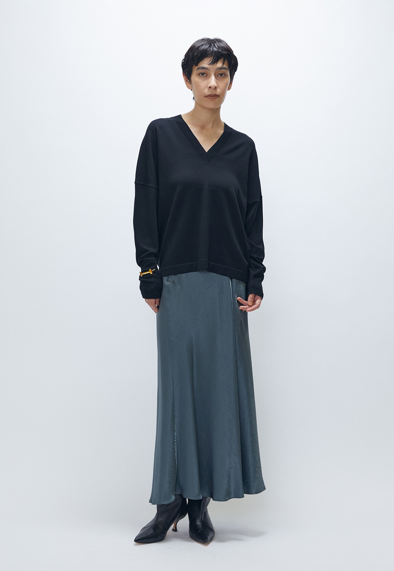 シャープに開いた胸元はセンシュアルな印象で、チョーカーやネックレスを合わせた女性らしいスタイルはもちろん、シャツを重ねてマニッシュに着こなすのもおすすめ。