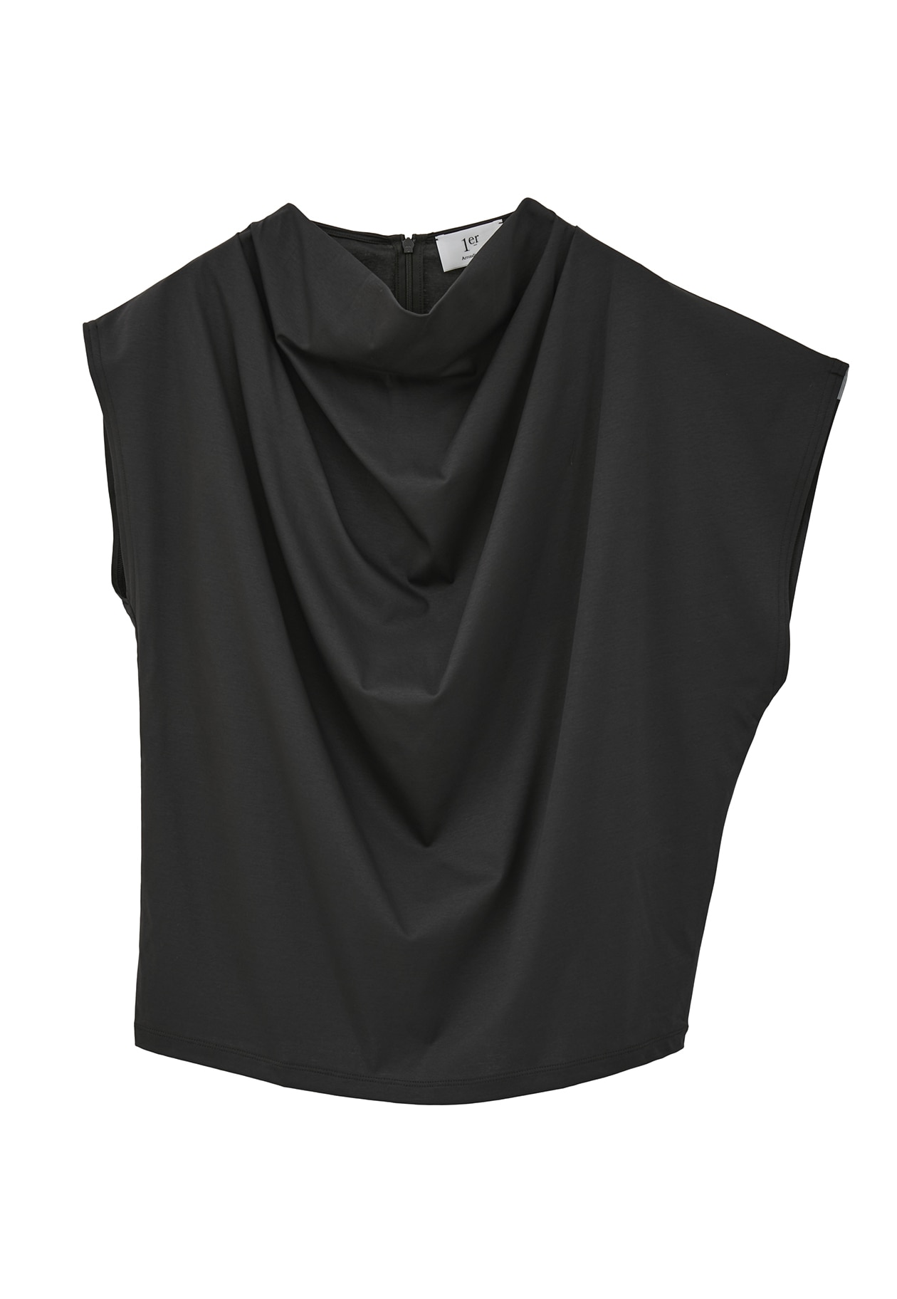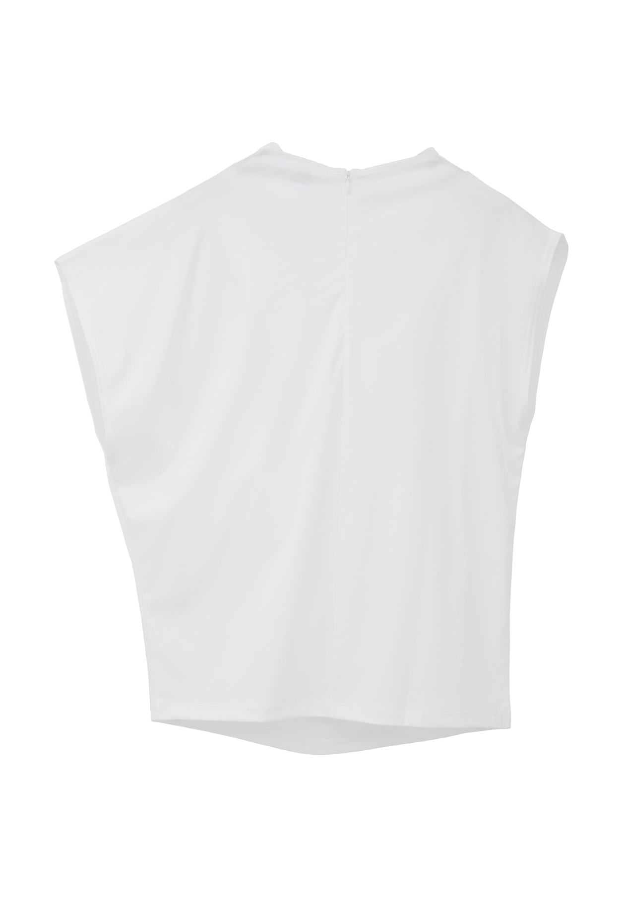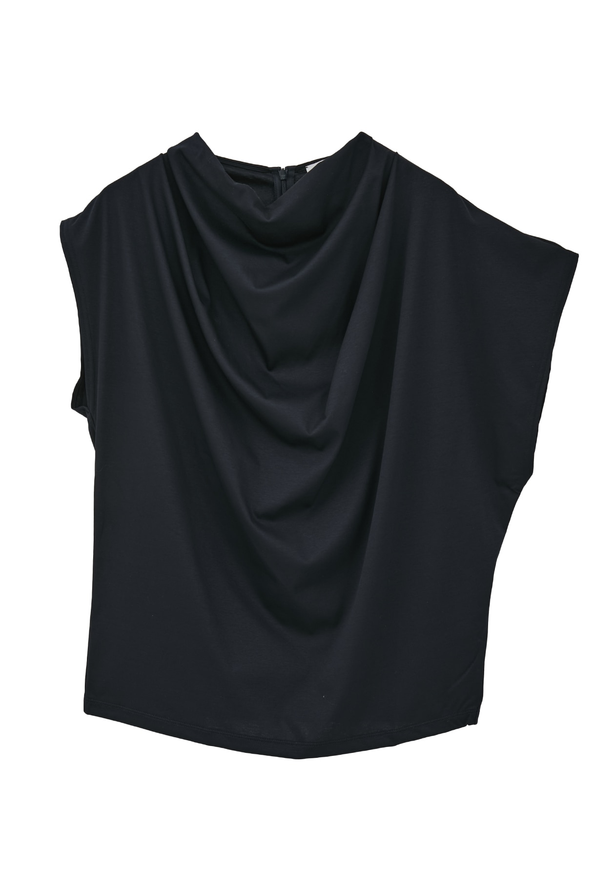 ややスタンドの襟元にドレープを出し、アシンメトリーデザインのエレガントなカットソーです。