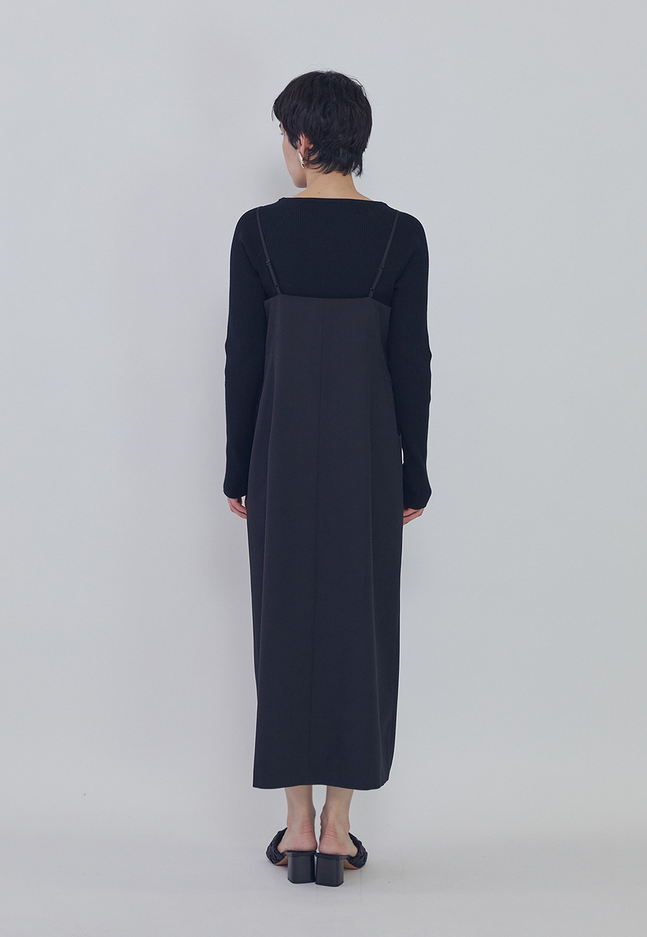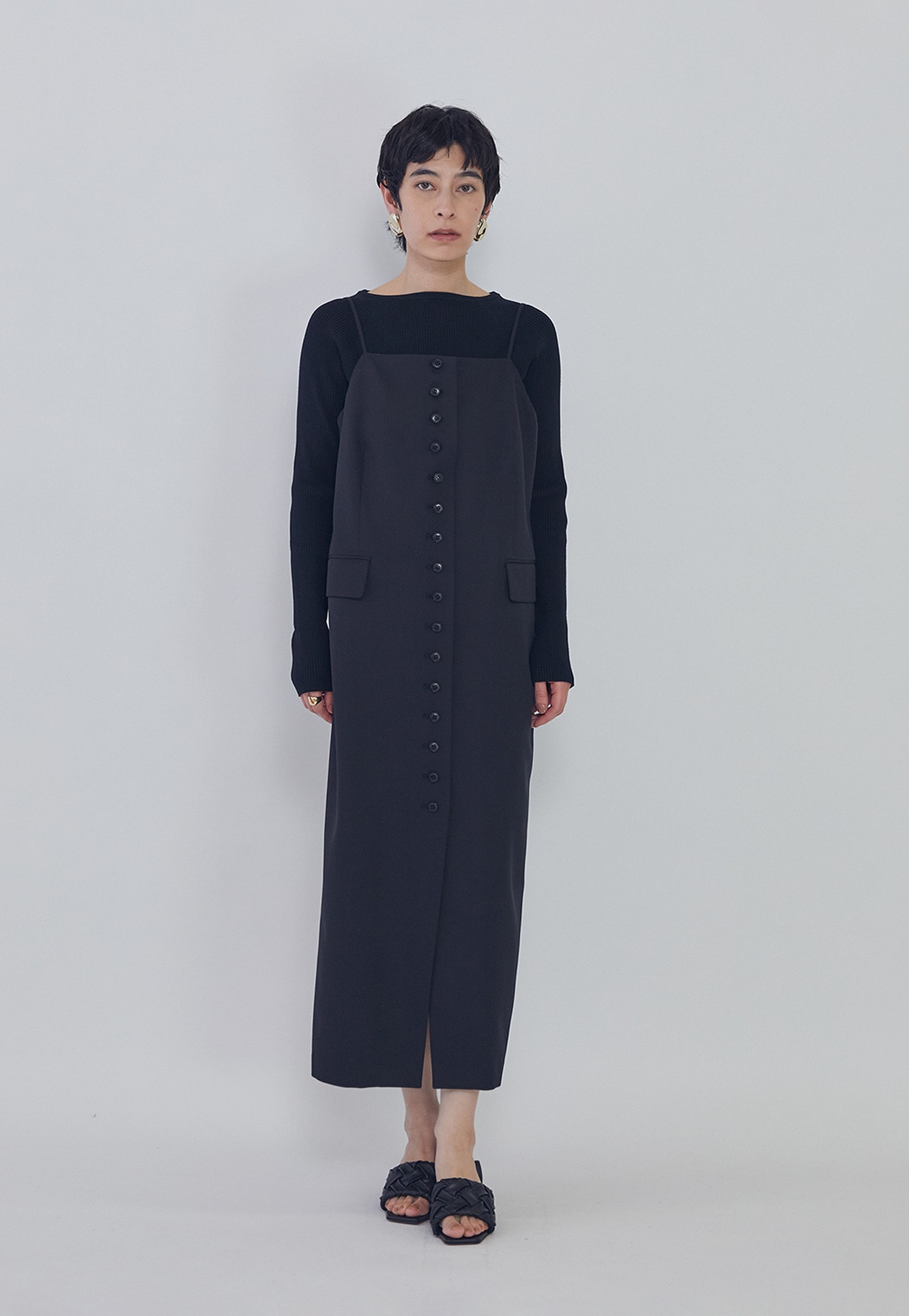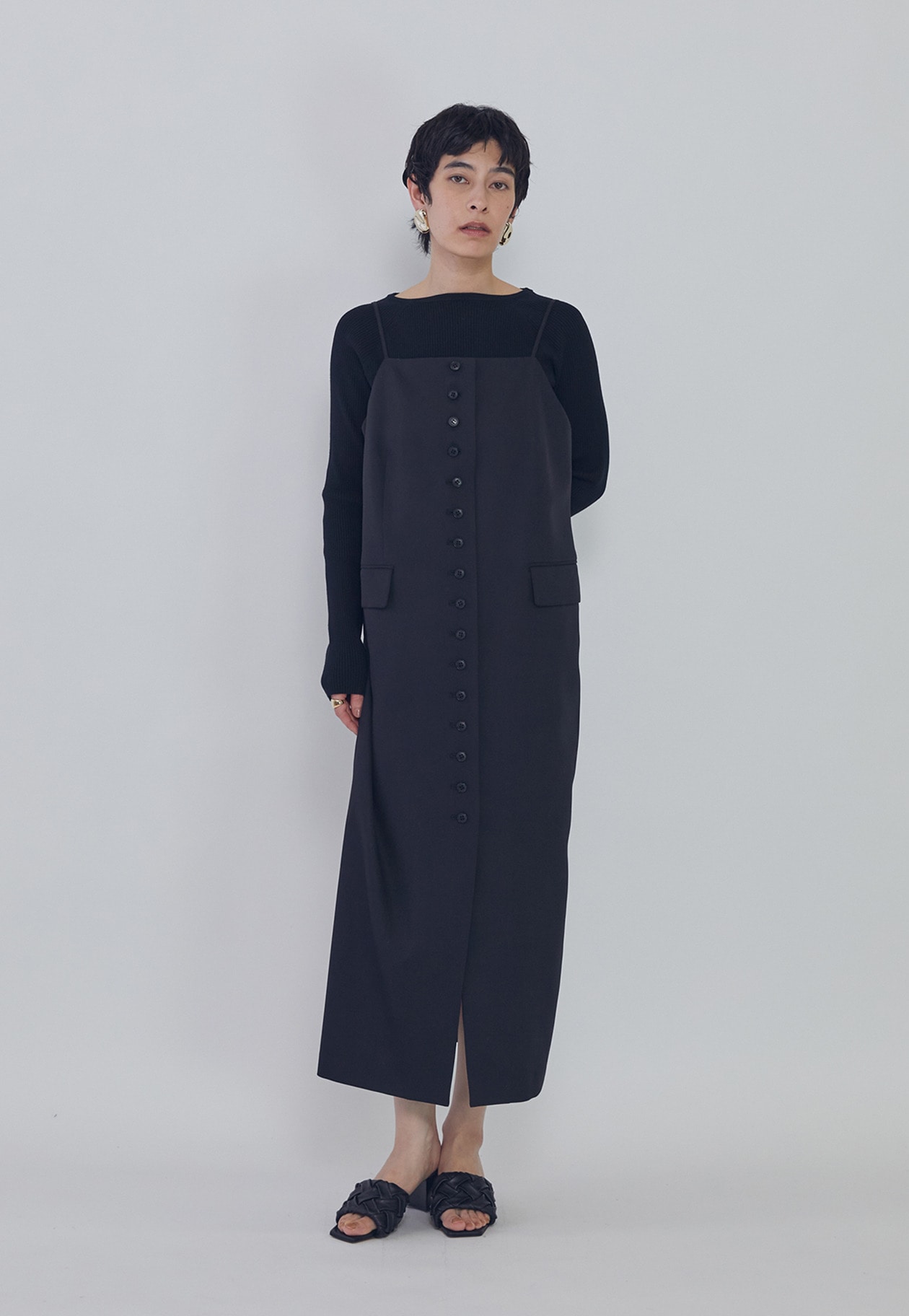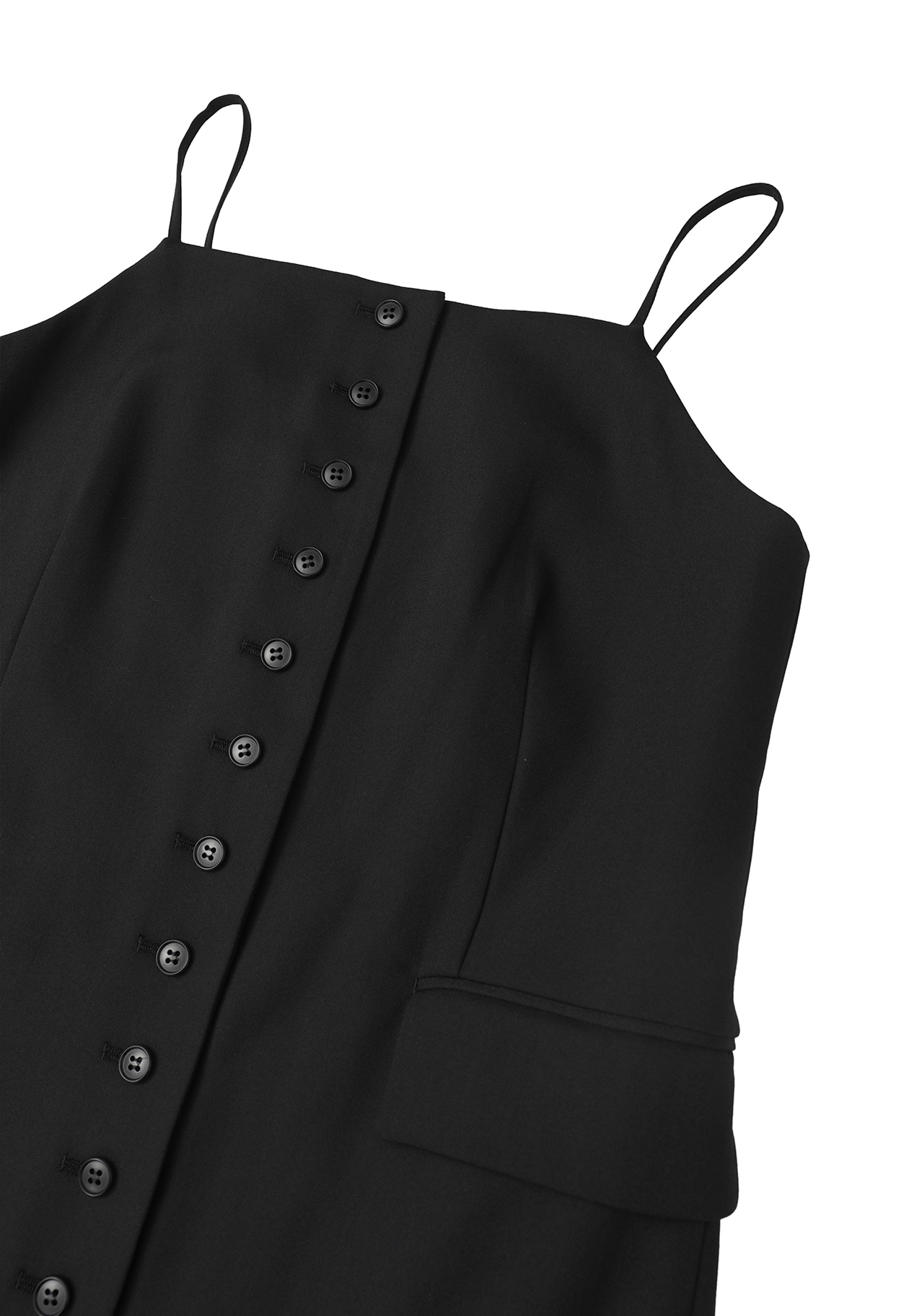 フロントボタンデザインが印象的なキャミソールワンピース。