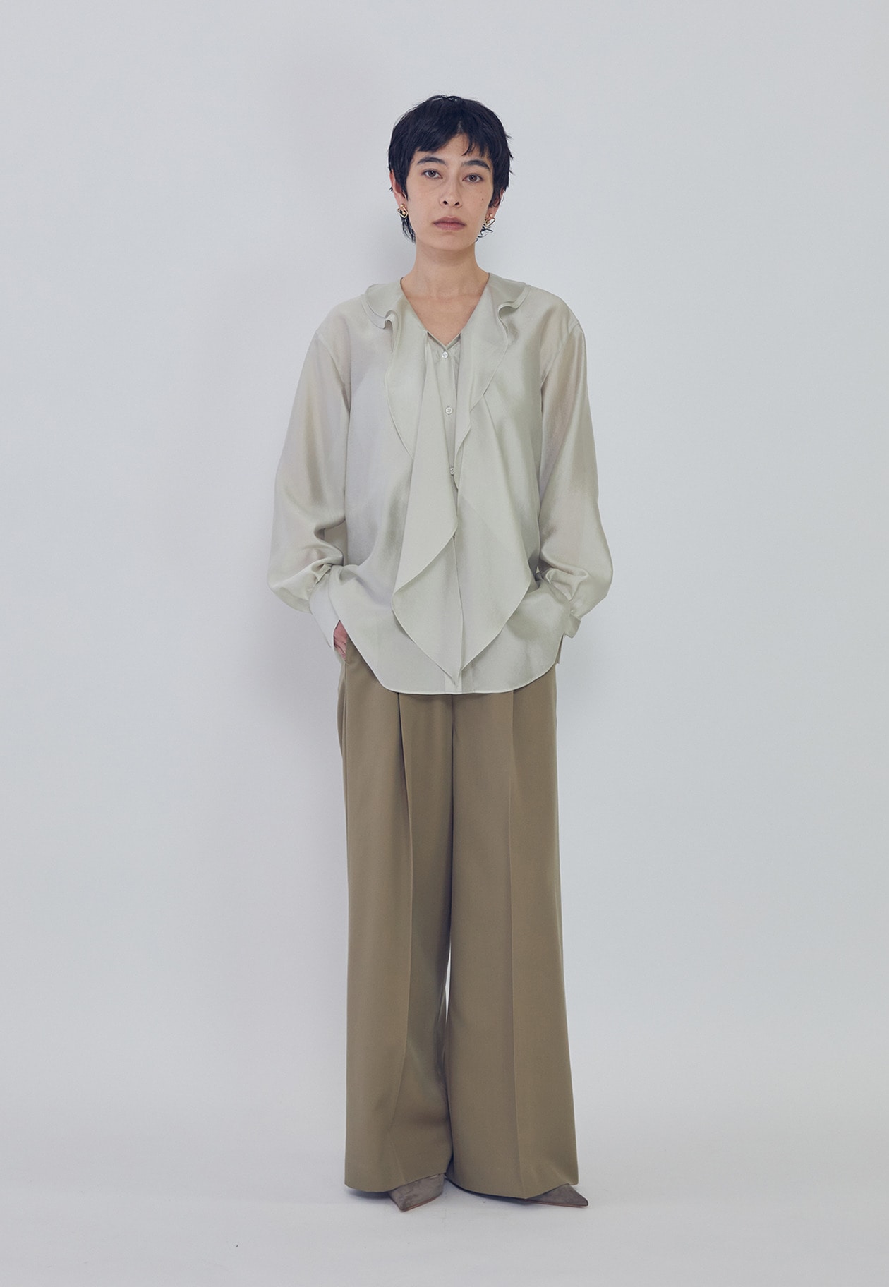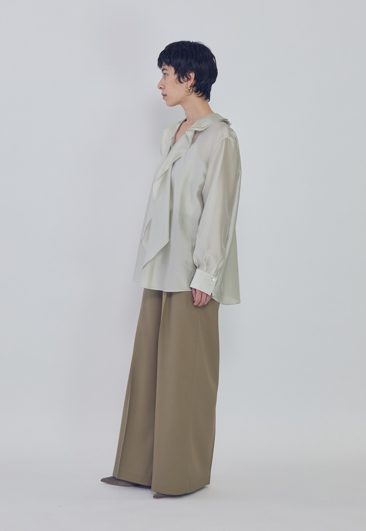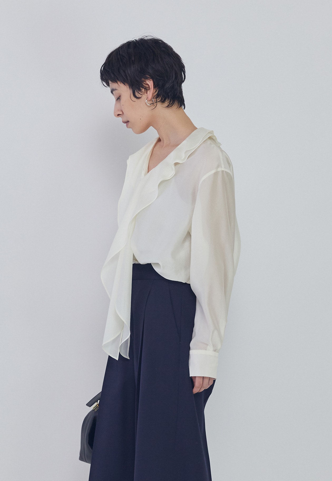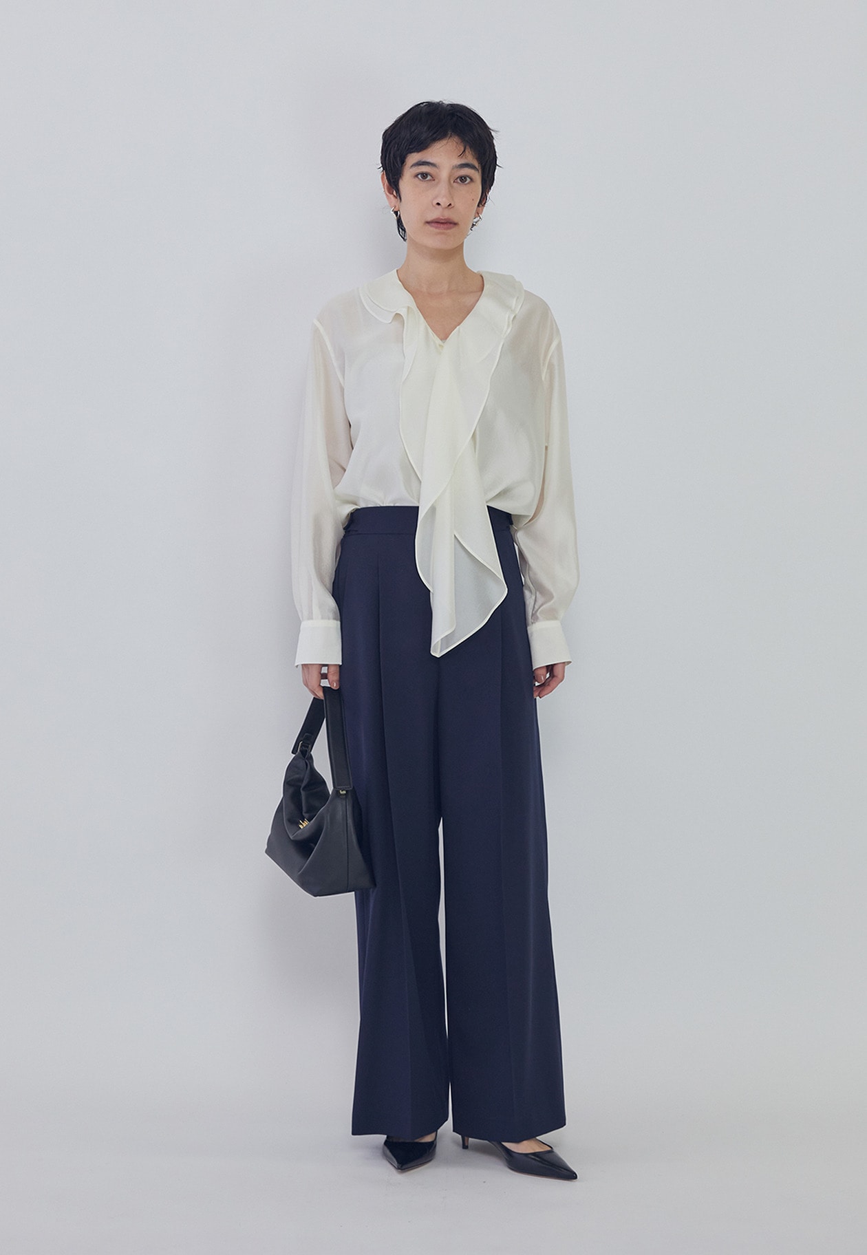 ラッフルボウタイが印象的で、一枚で着映えするブラウス。