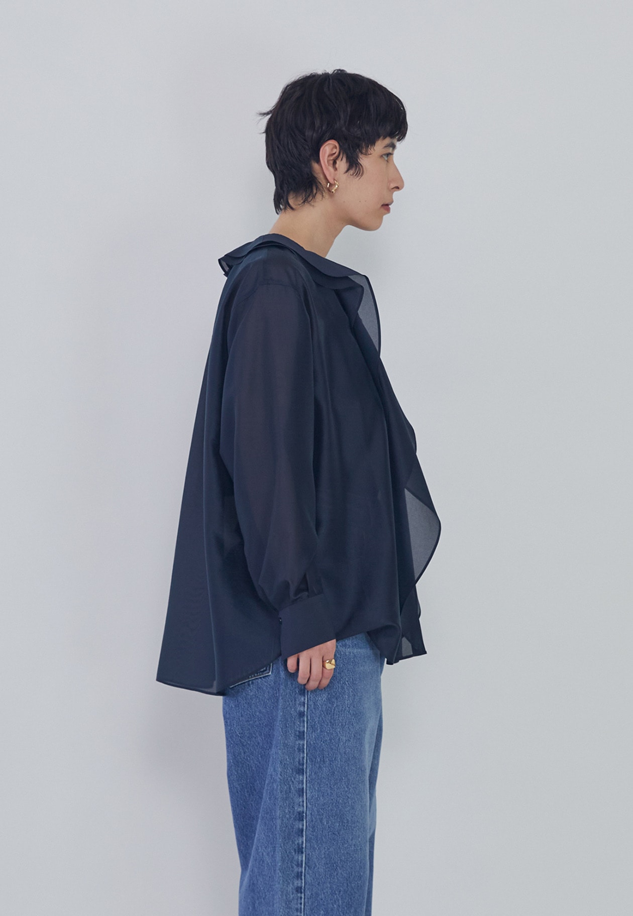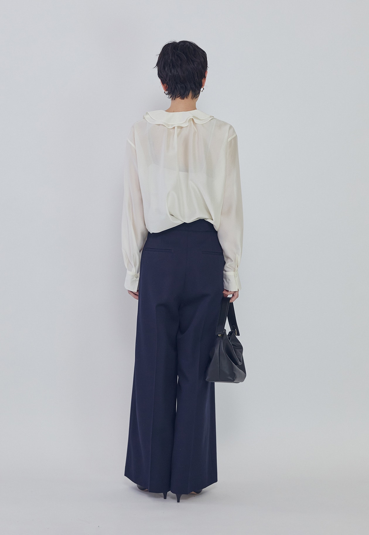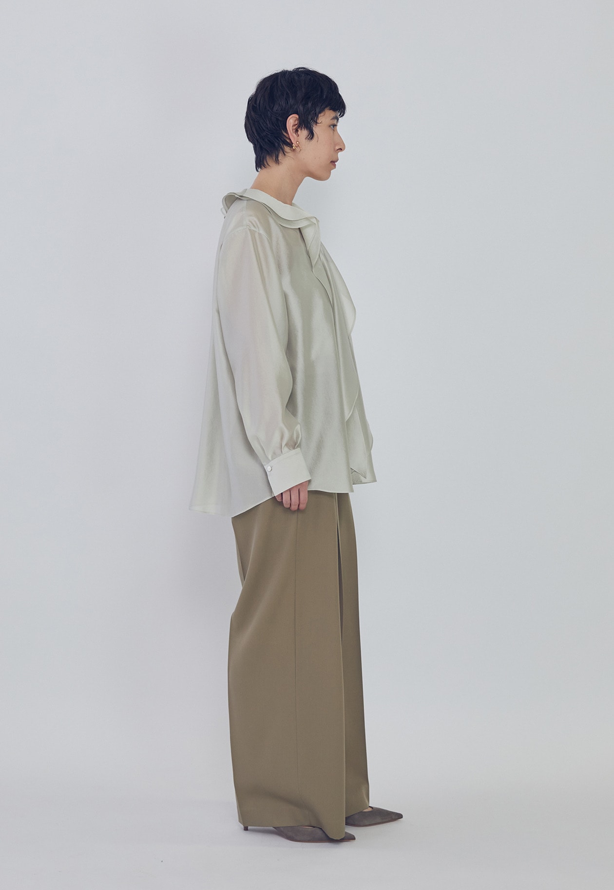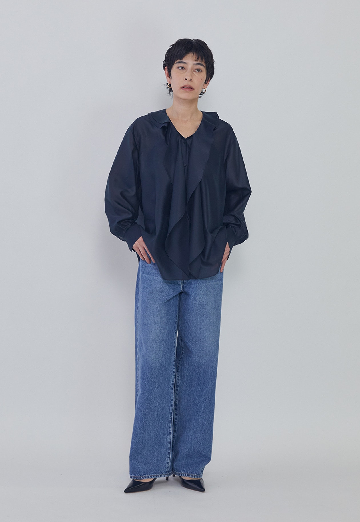 ラッフルボウタイが印象的で、一枚で着映えするブラウス。
