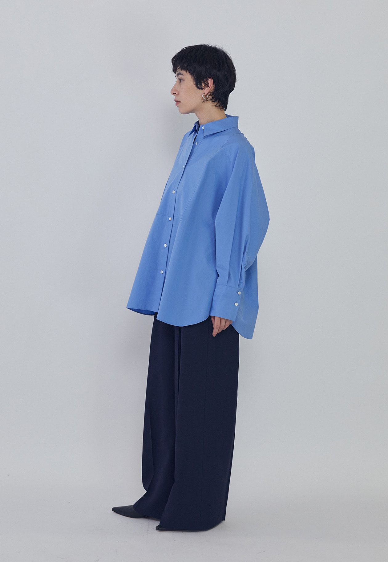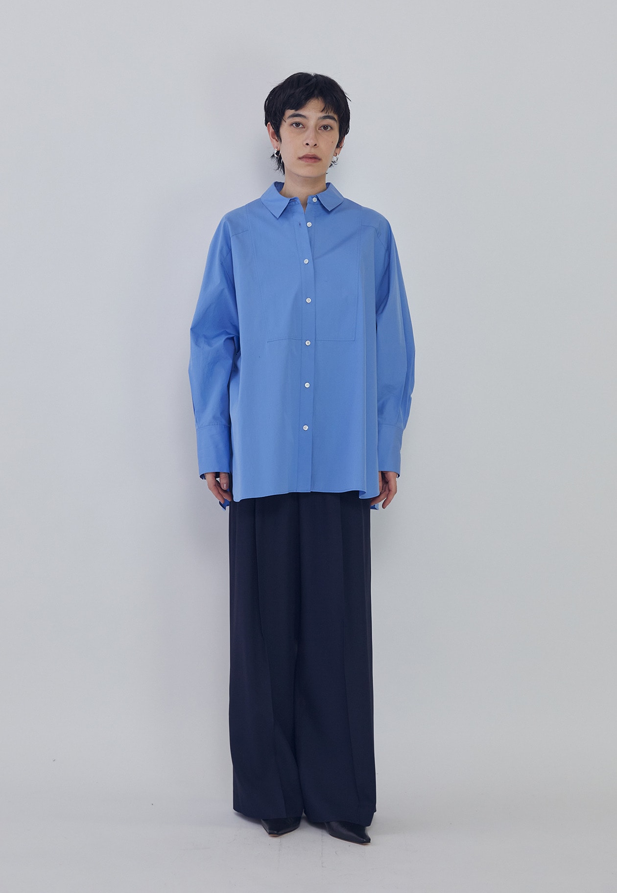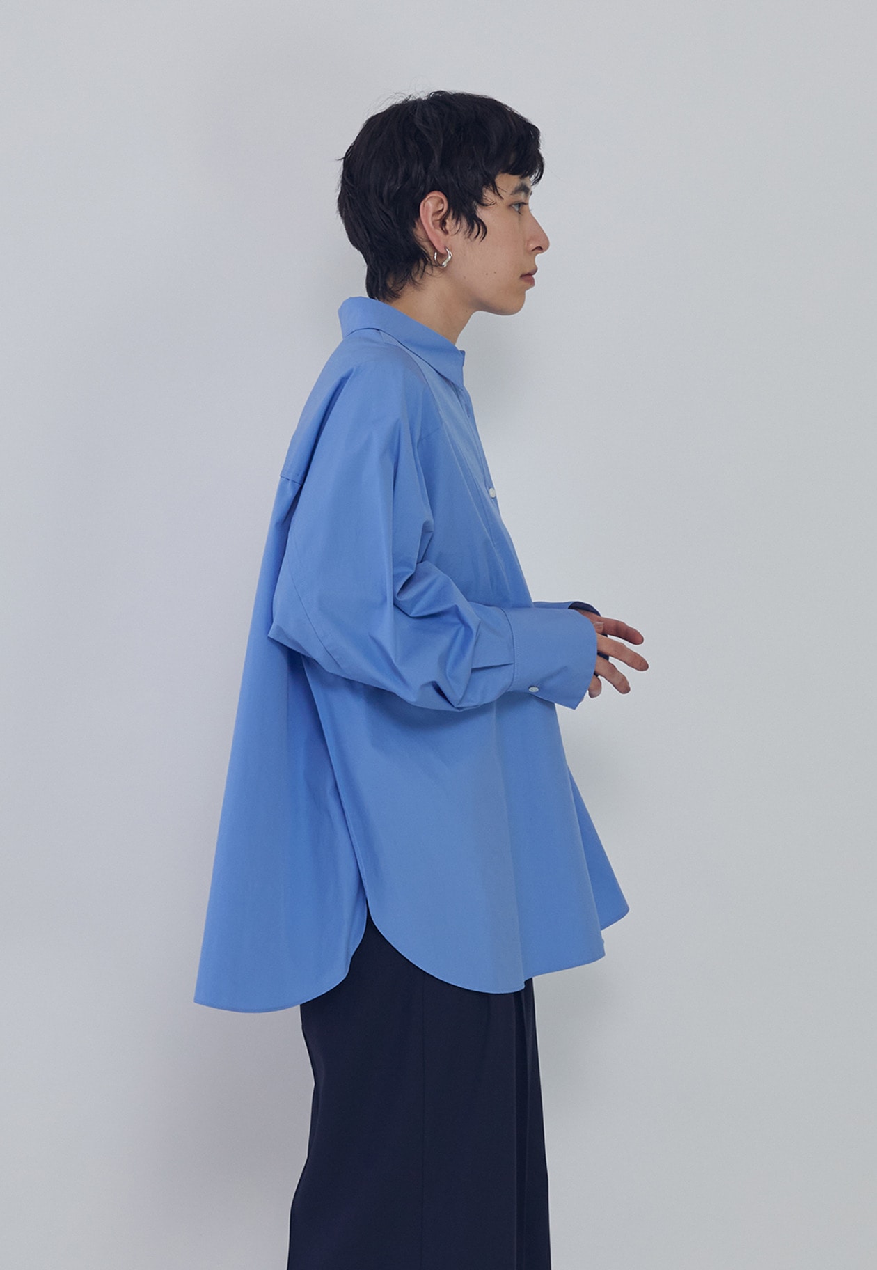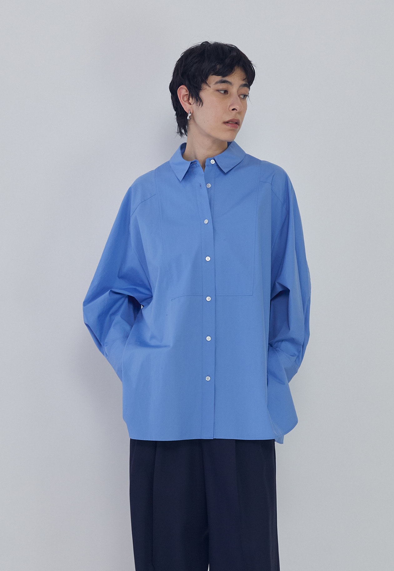 細番手のコットンブロードの質感を活かした、オーバーサイズシルエットのシャツ。