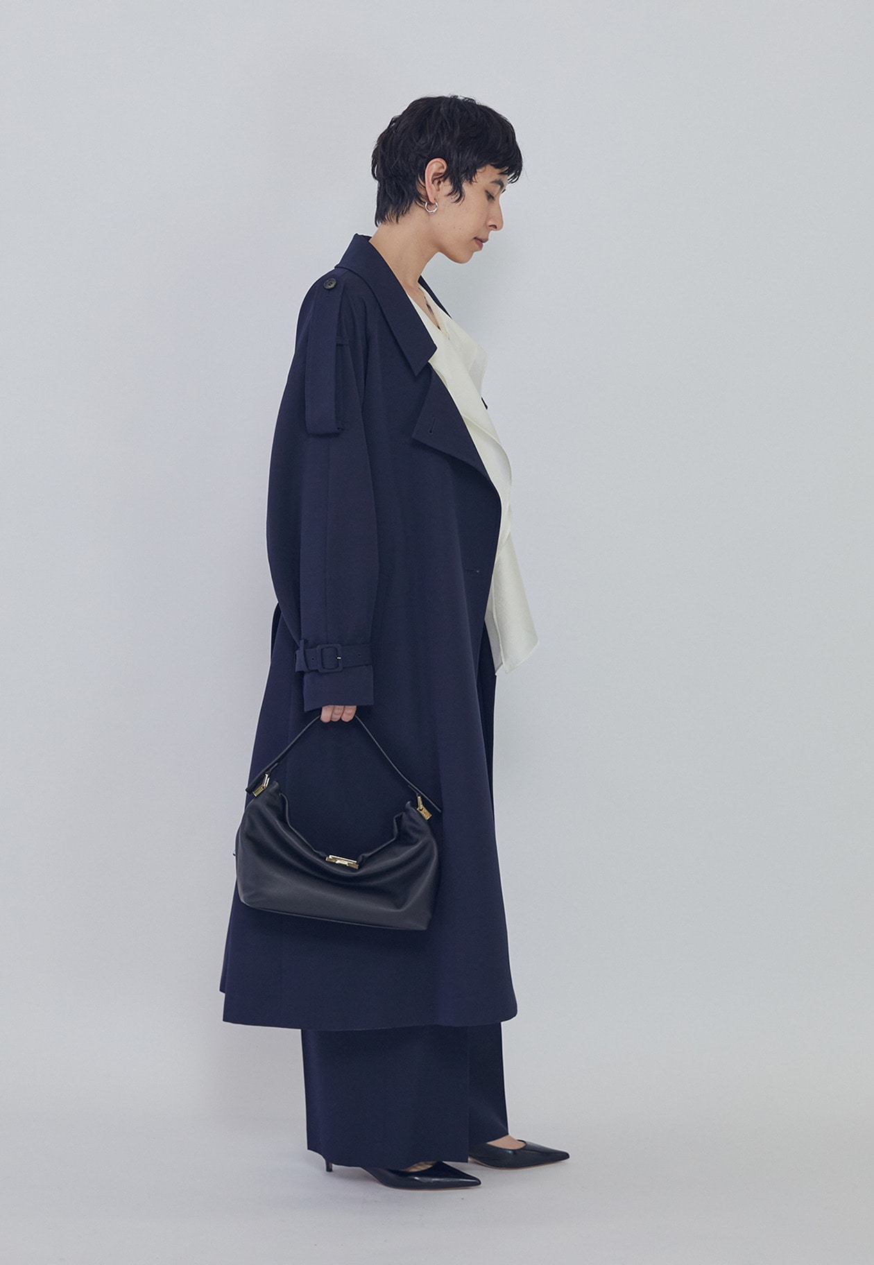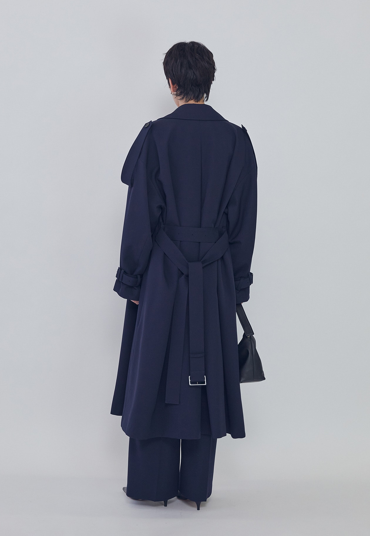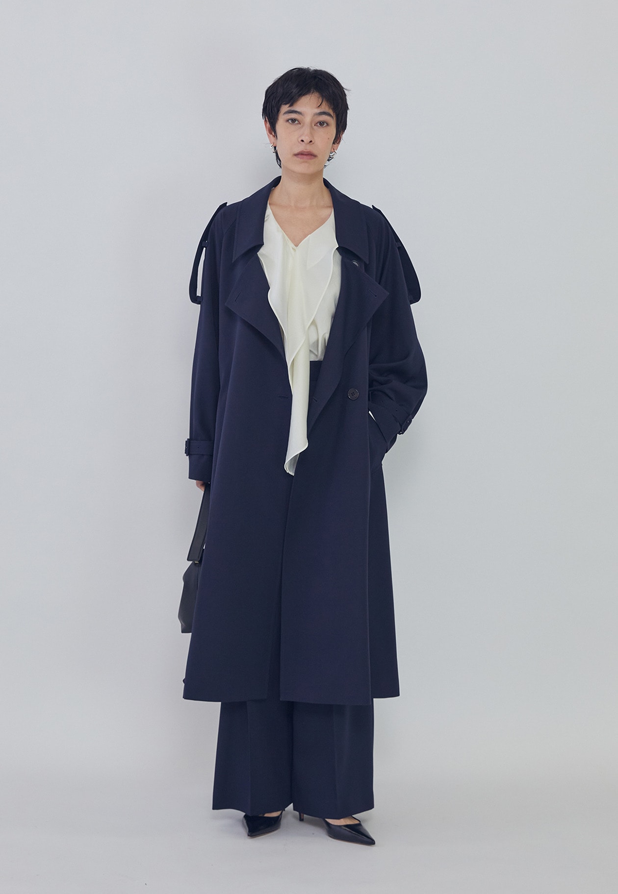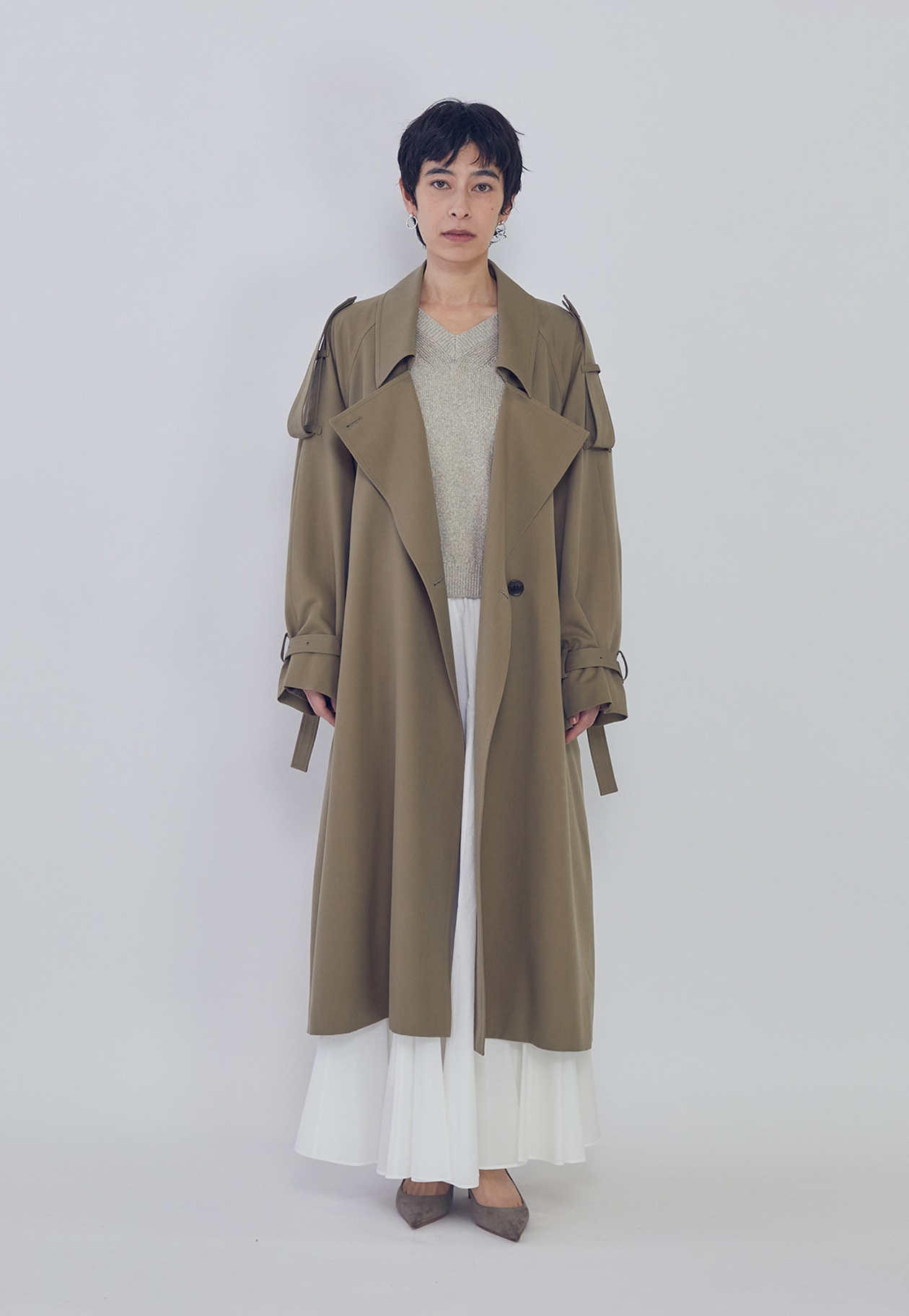 エポレットや前下がりの襟がほどよくモードなアクセントに。