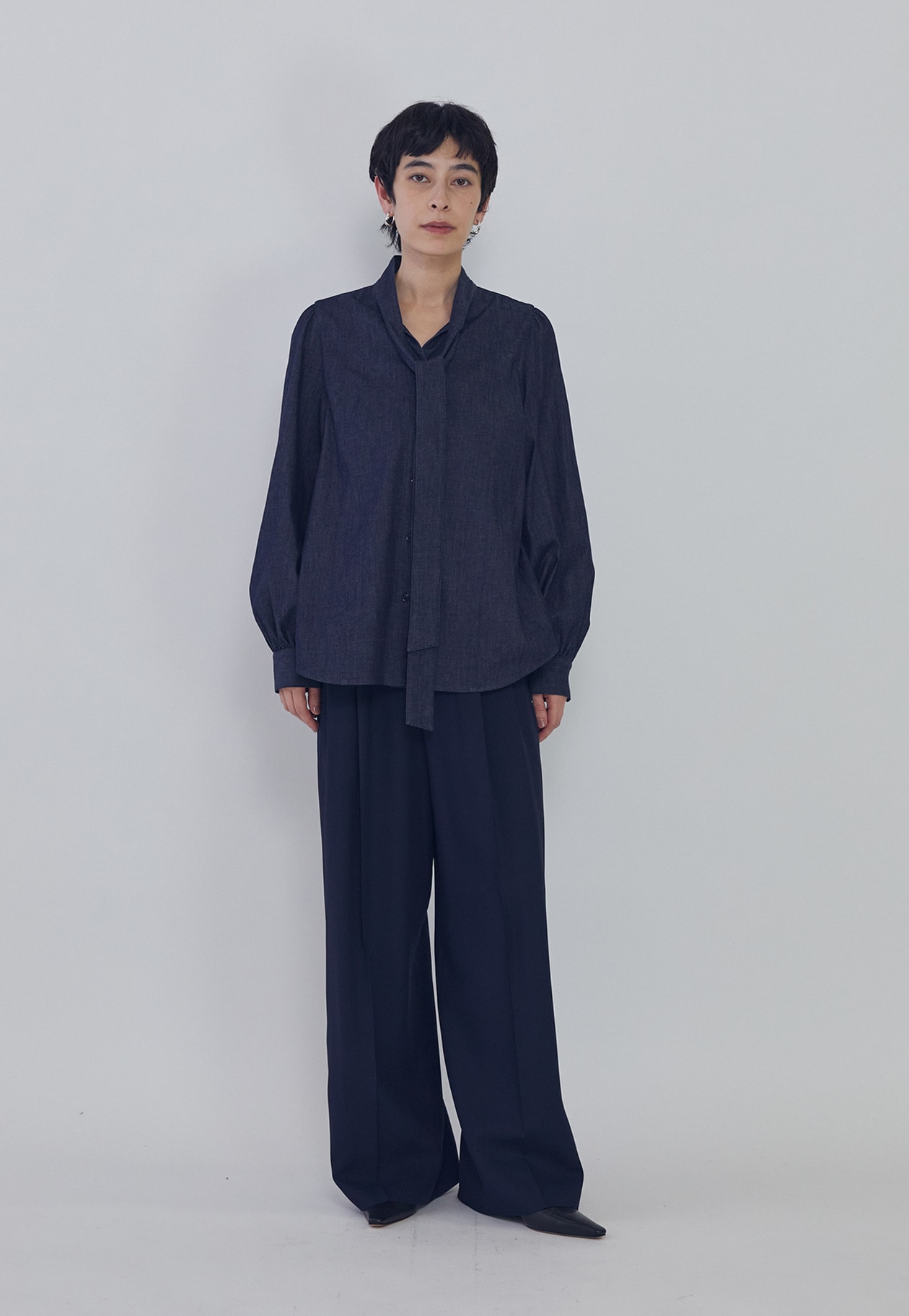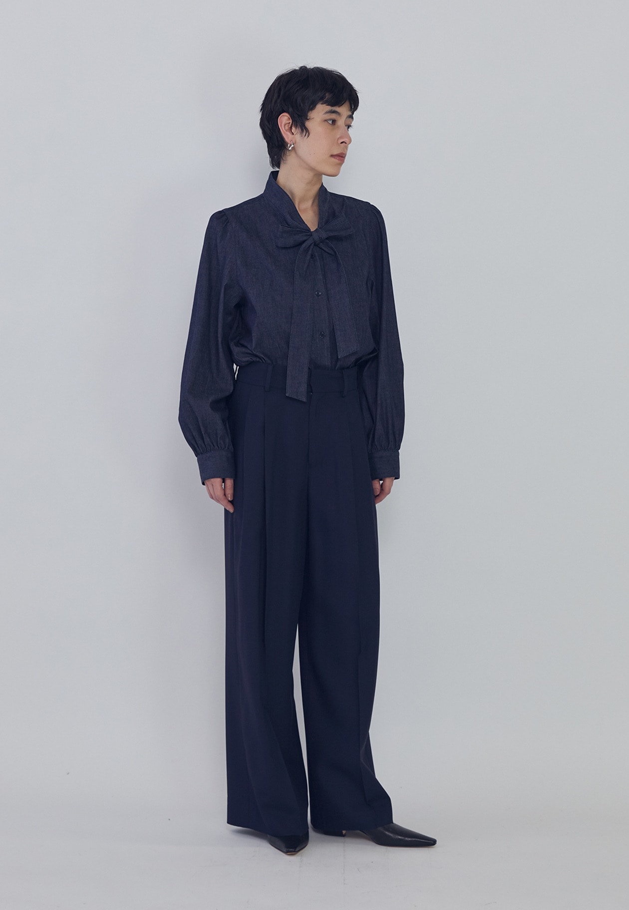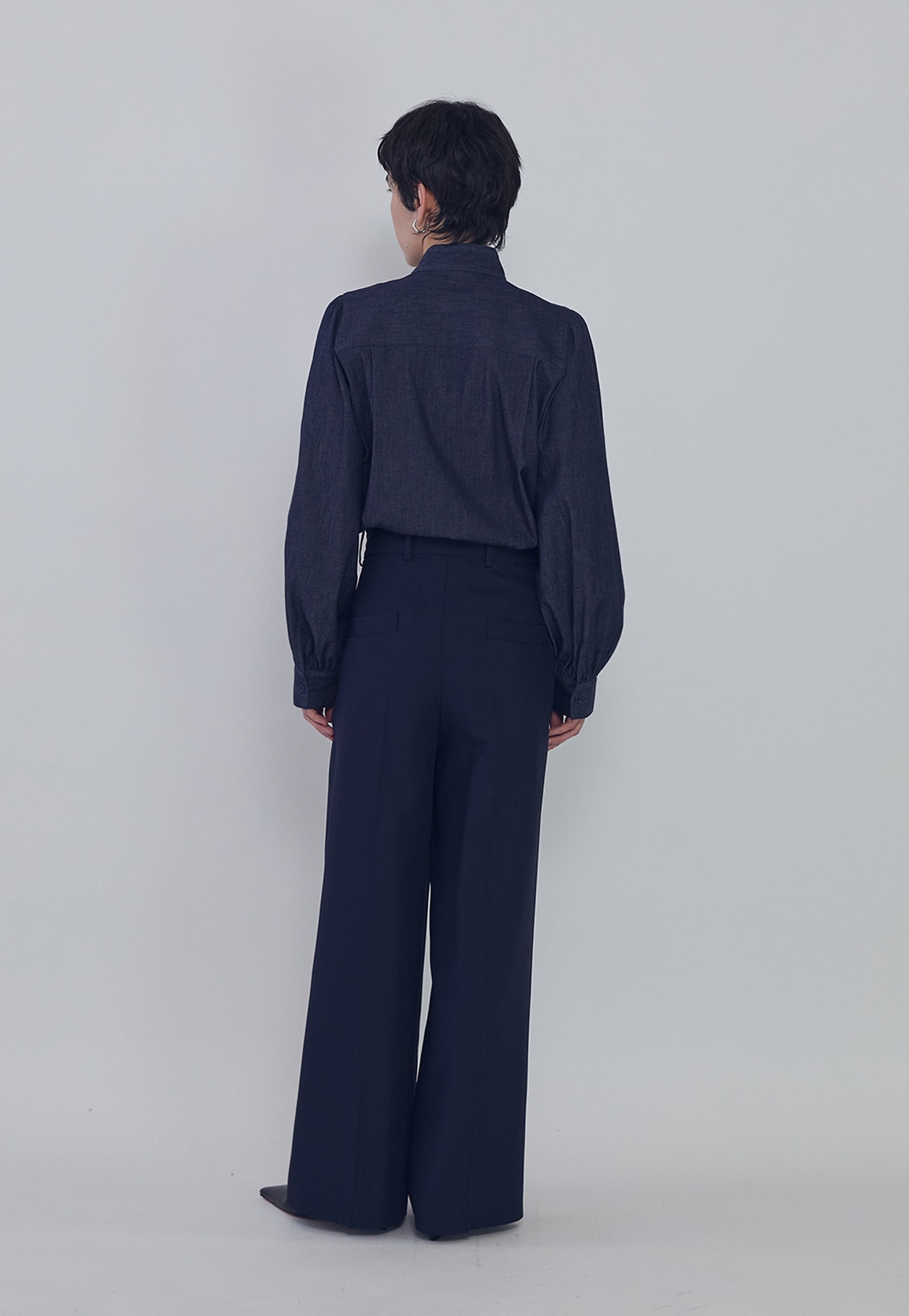 この素材ならではの仕立てで、2タックのボリュームあるシルエットも広がりすぎず、すっきりとした印象に。