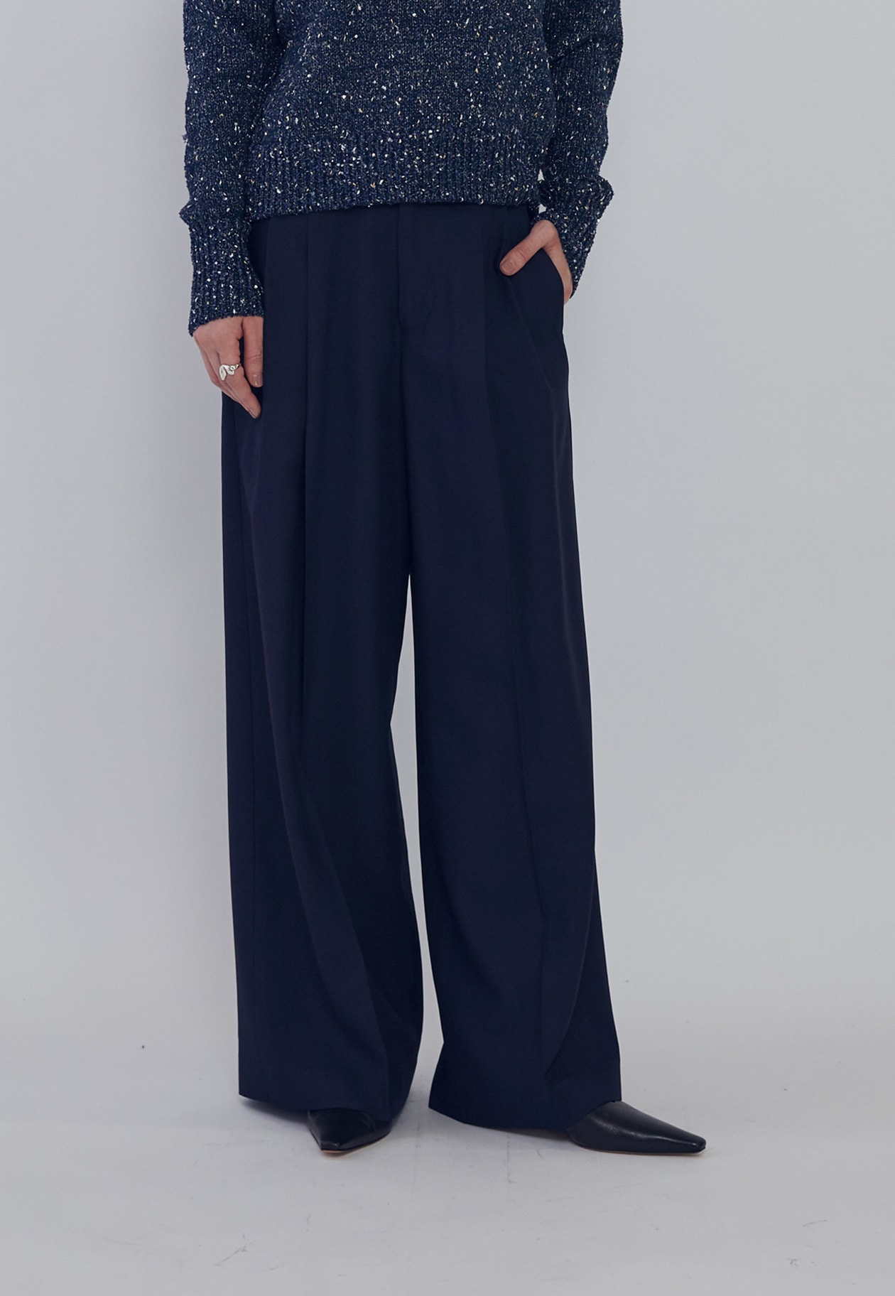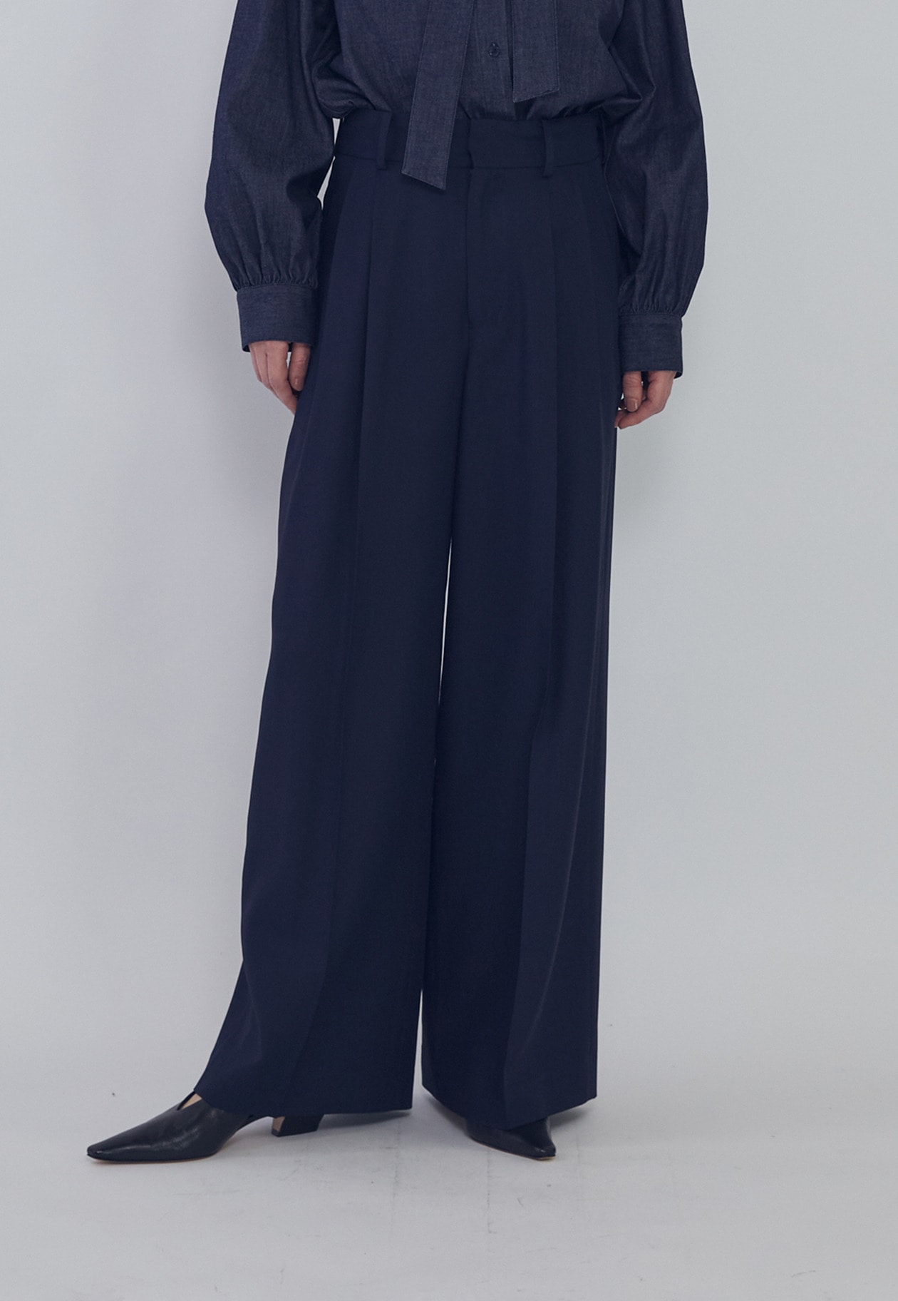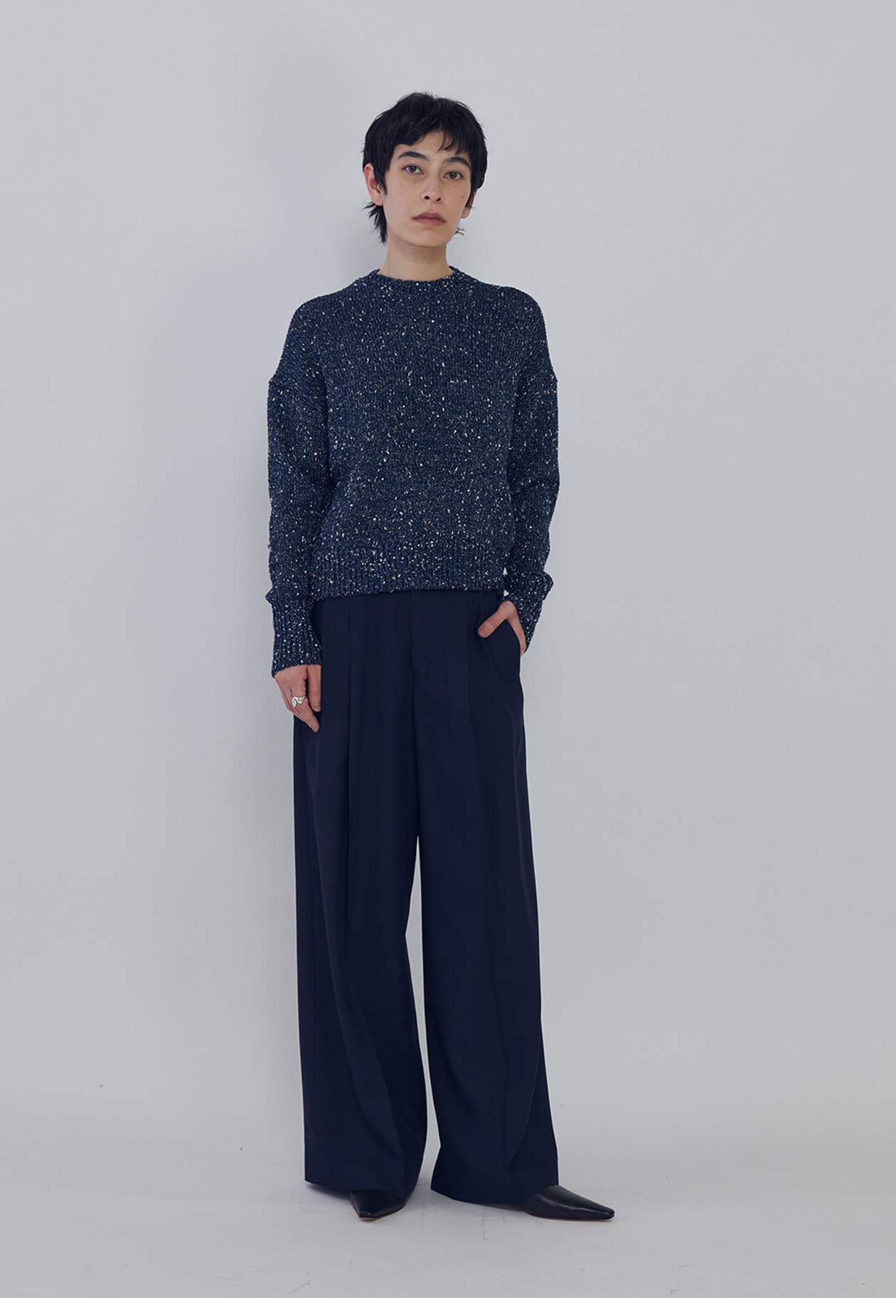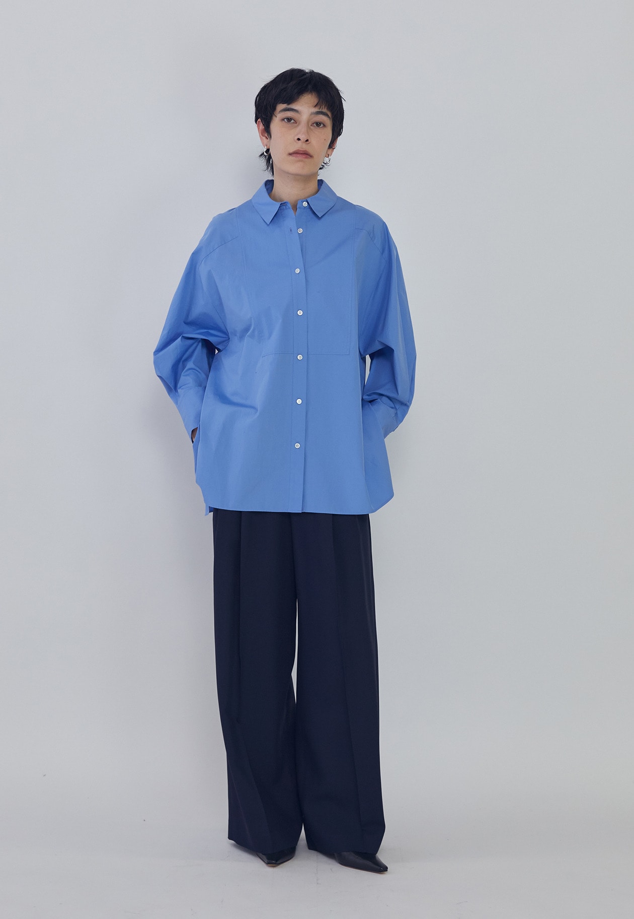 この素材ならではの仕立てで、2タックのボリュームあるシルエットも広がりすぎず、すっきりとした印象に。