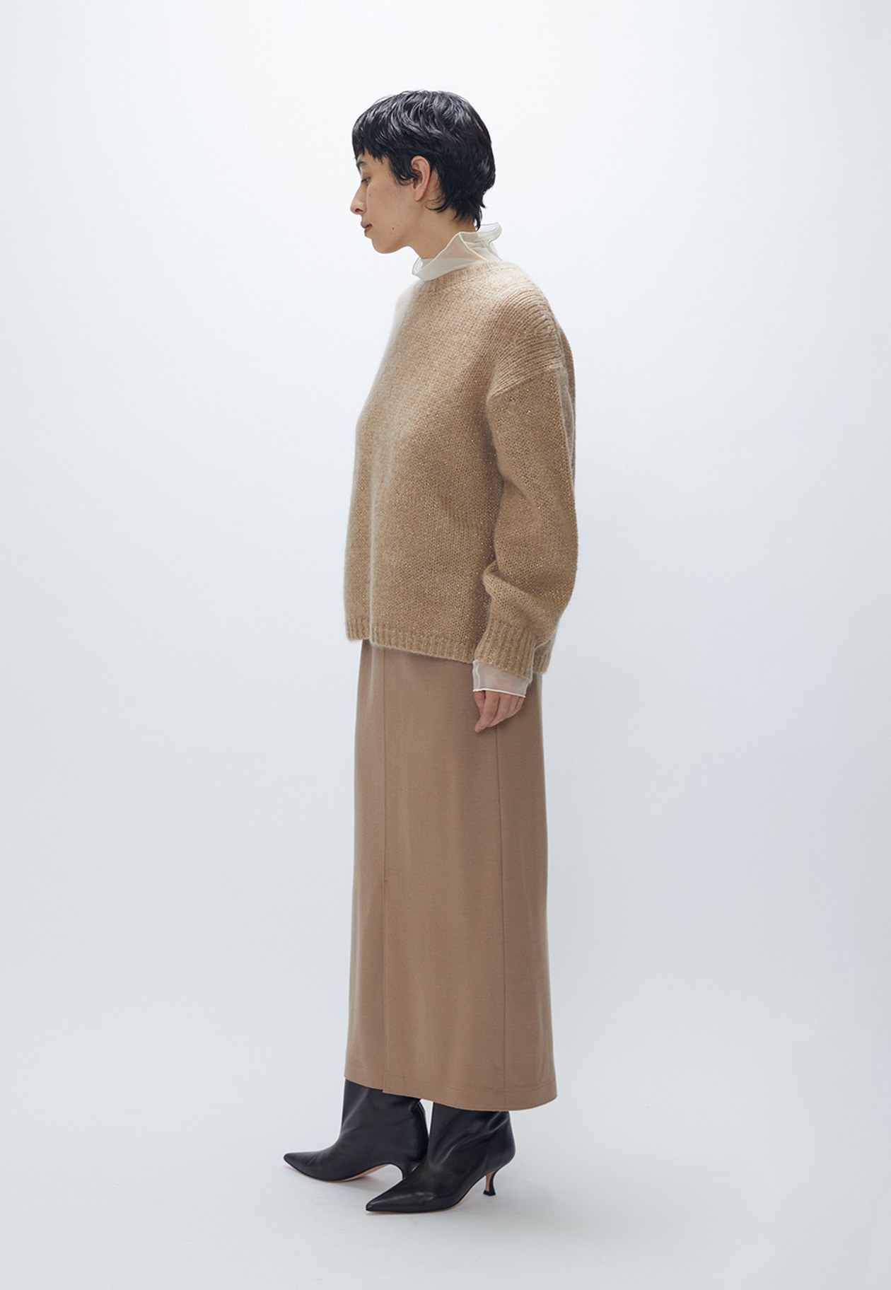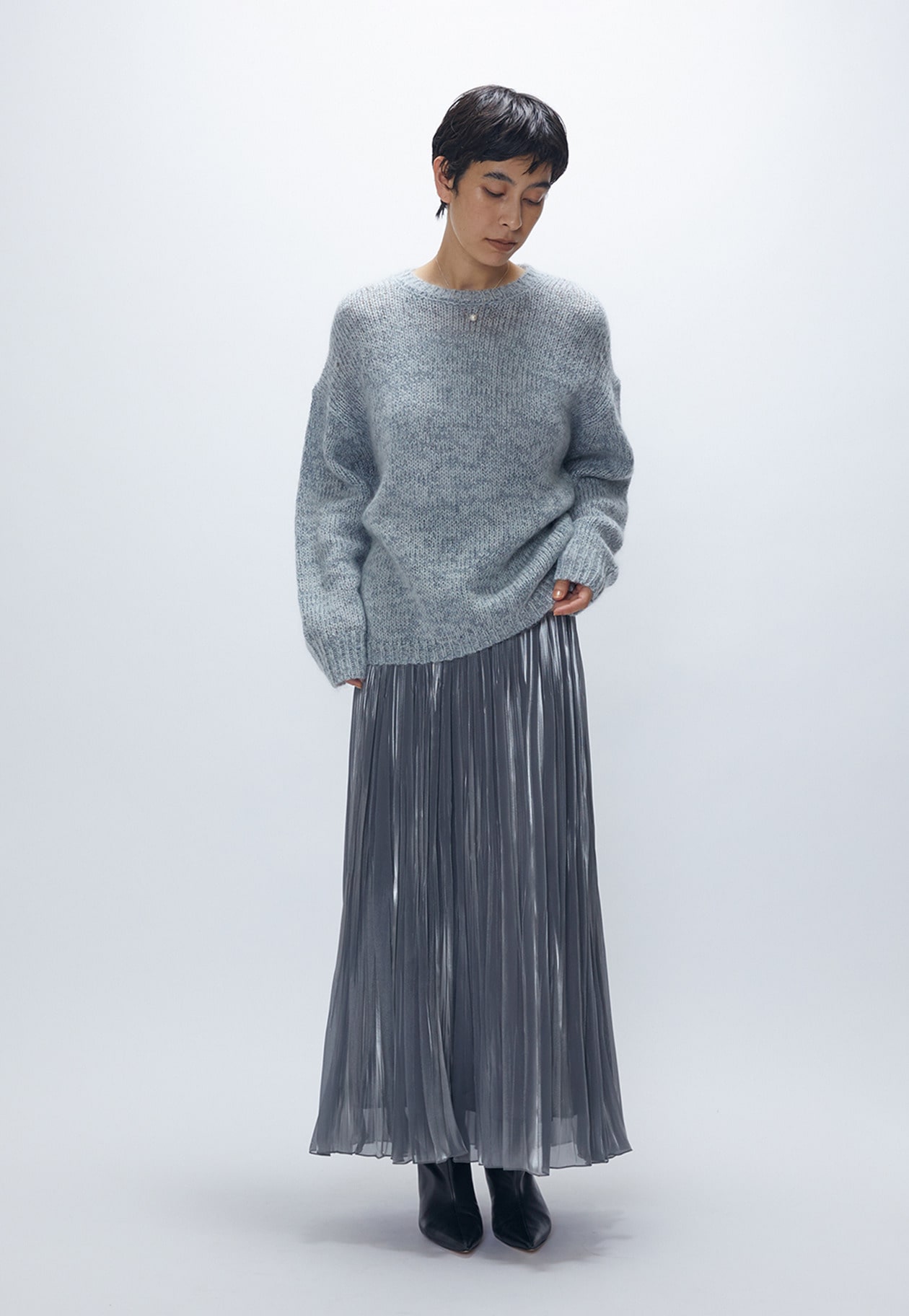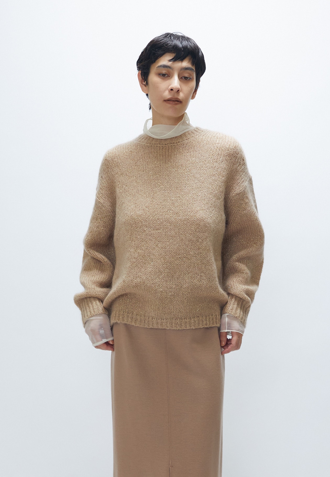 細いキッドモヘアとラメのリリヤーンを軽く撚り合わせた、温かみのある意匠糸を使用。