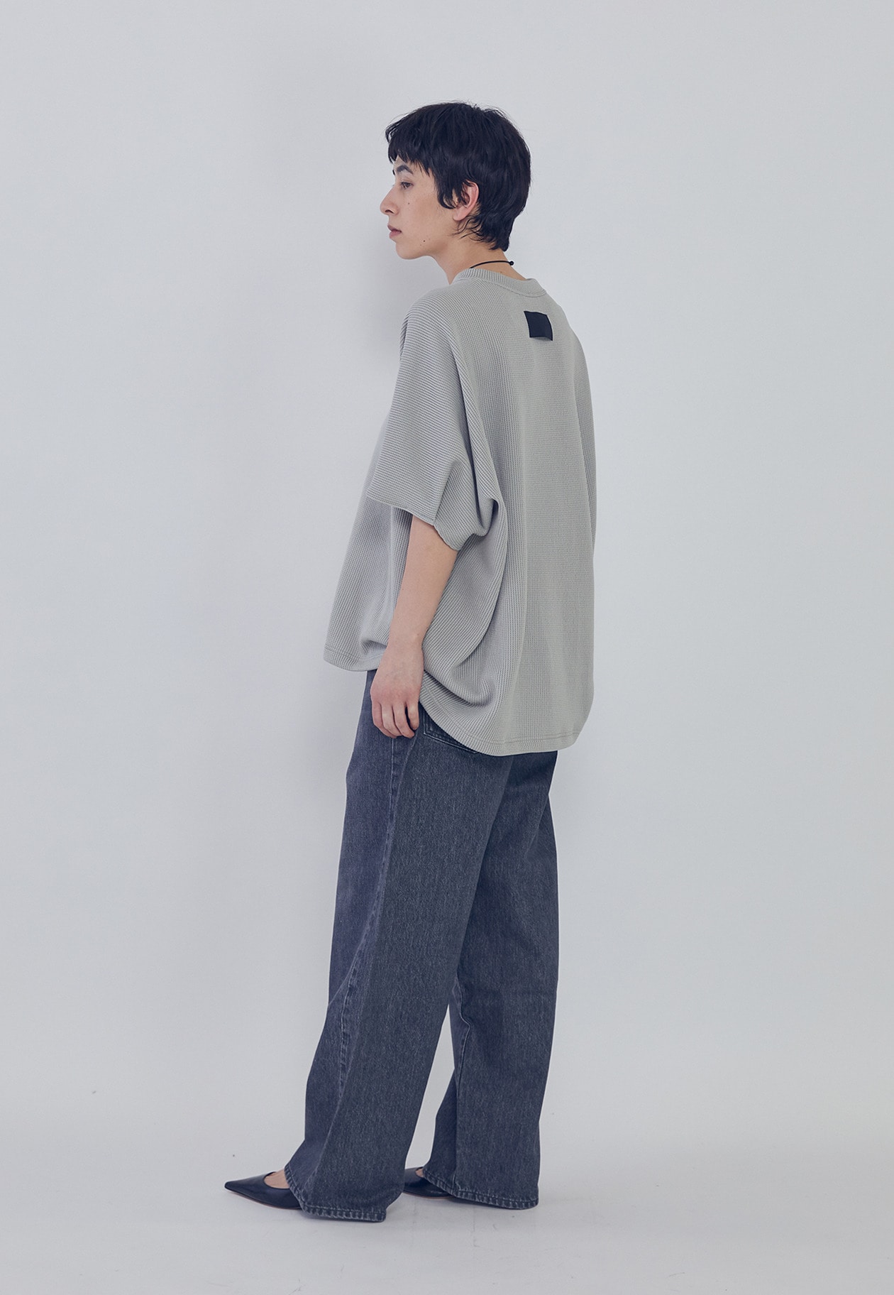 ローゲージのニットのような見た目でありながら、裏面にはハイゲージのさらっとした肌触りを備えており、見た目の存在感と着心地の良さを両立。