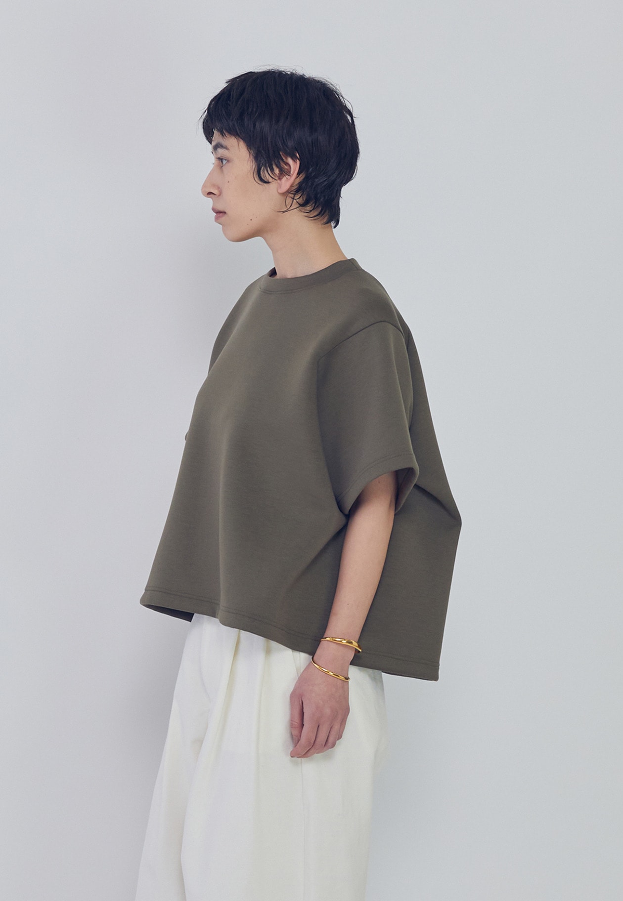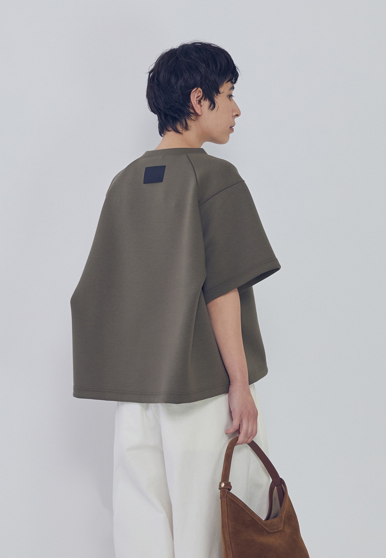 後ろ袖に入れたタックが背中に自然なふくらみを生み、身体から離れる横顔をつくります。