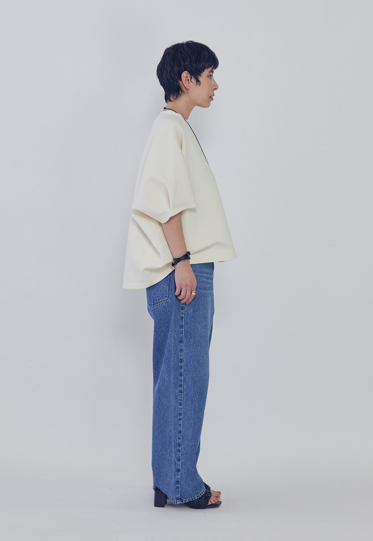 前身頃に対して大胆に分量を取った後ろ身頃が、袖口と裾に入れたタックによってふくらみを生み、独特のシルエットを描きます。