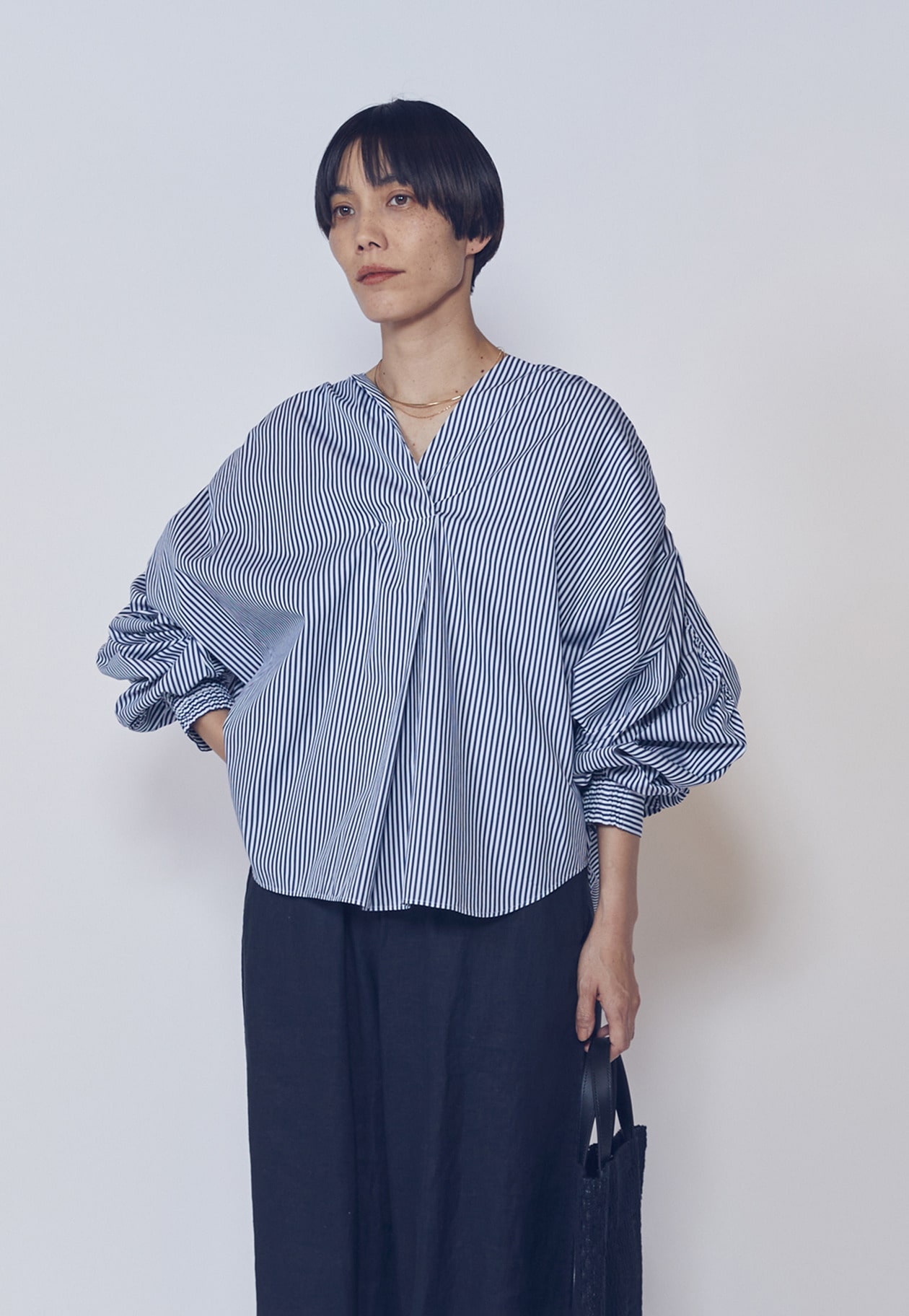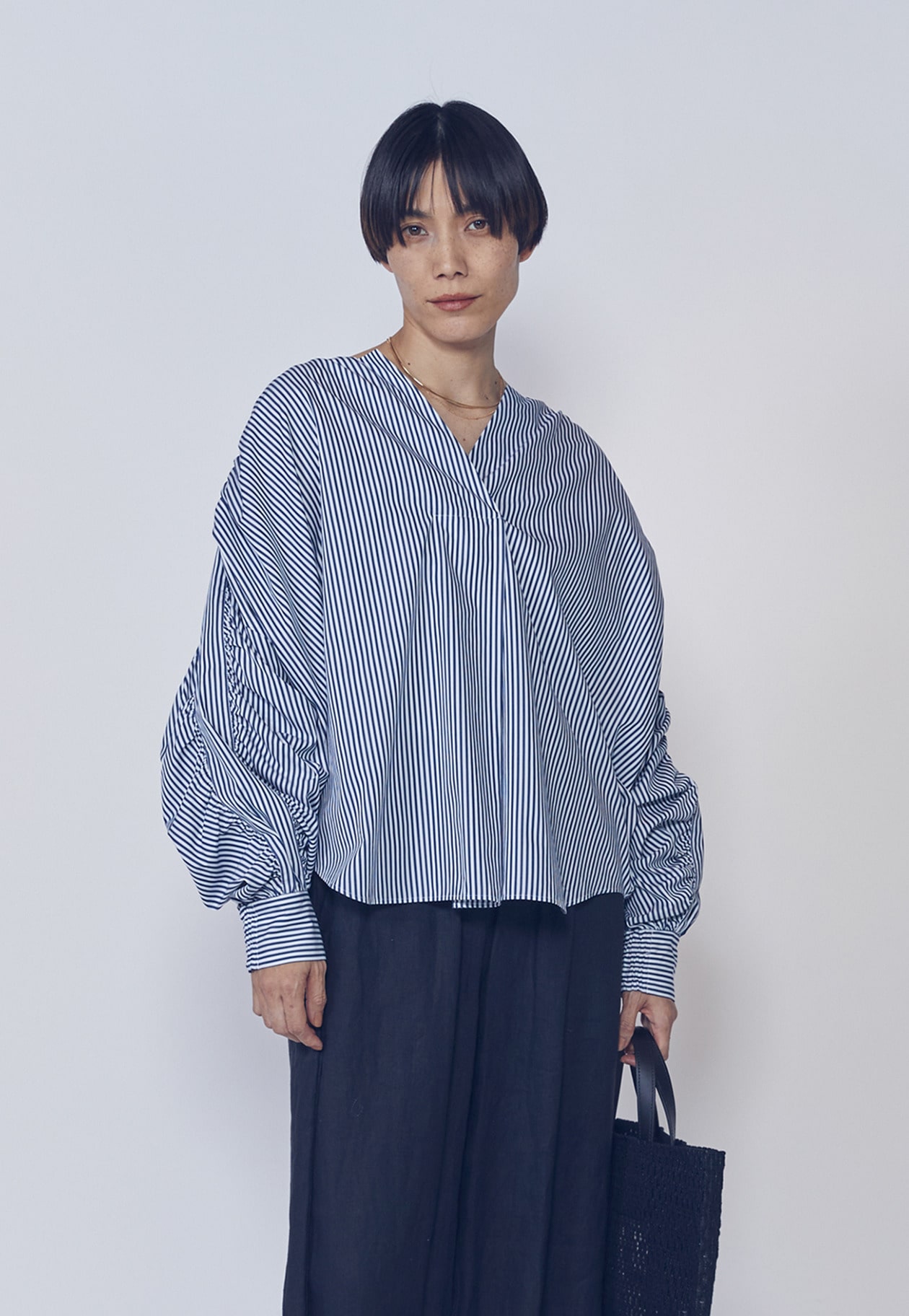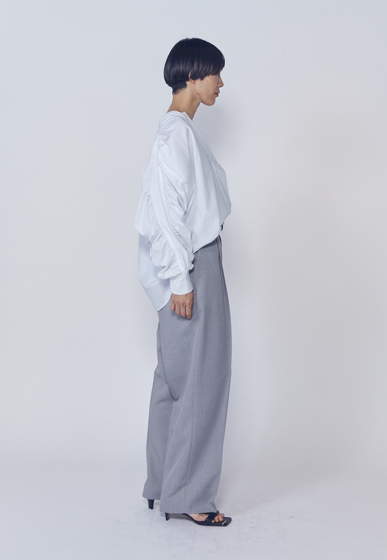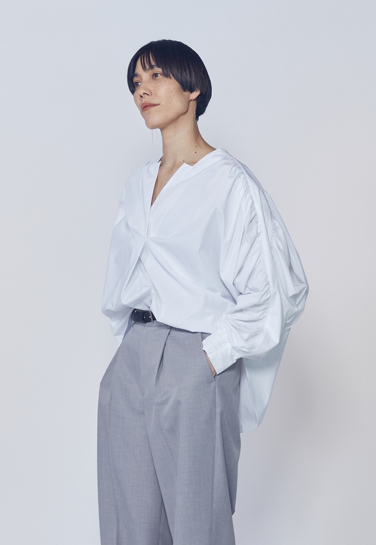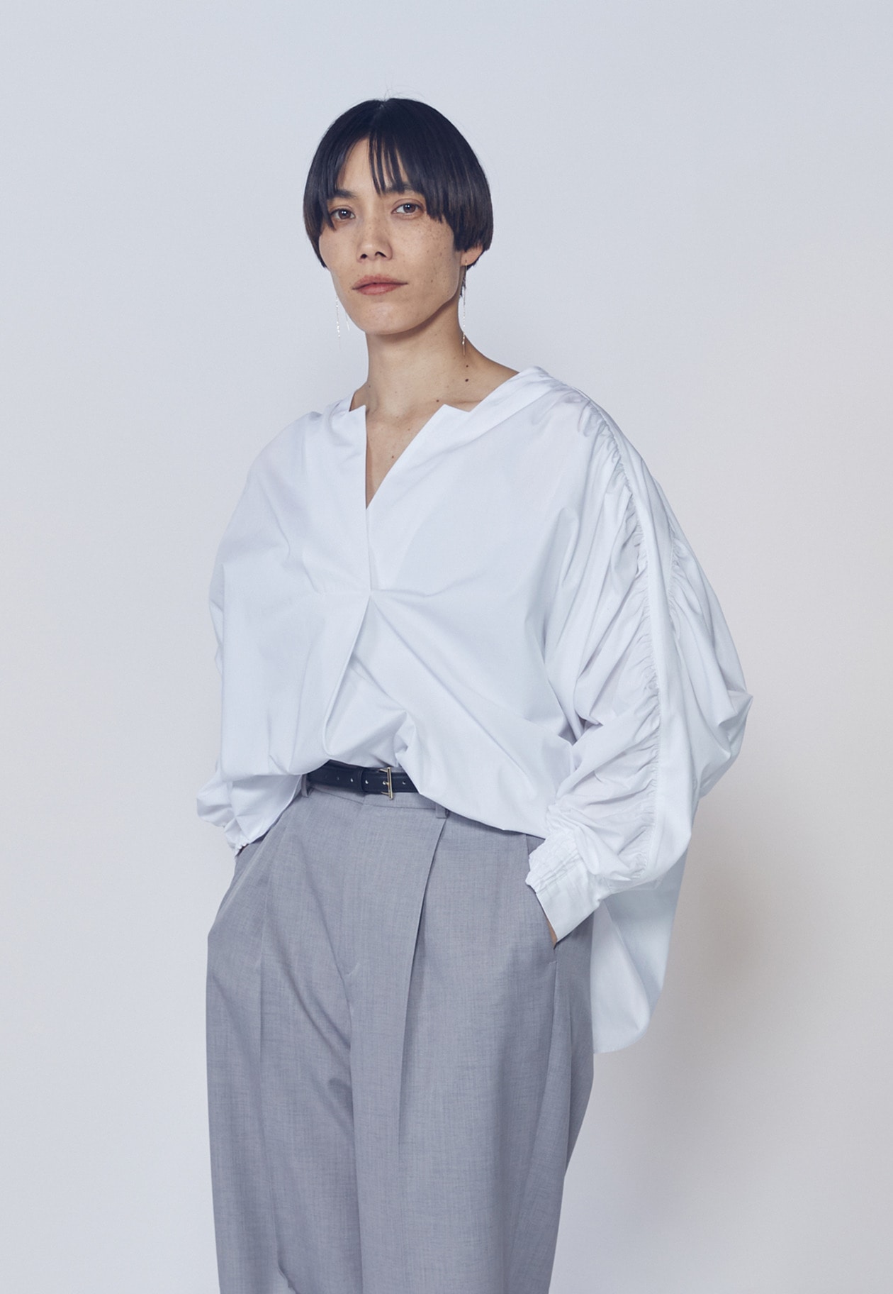 シャツ地に贅沢にタックとギャザーを施し、柔らかな女性らしさを表現したブラウス。