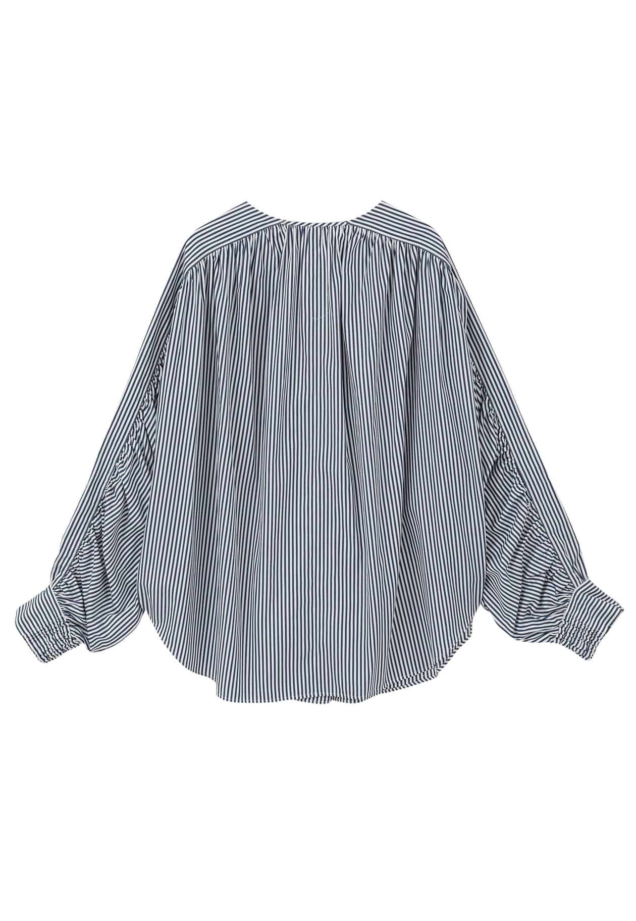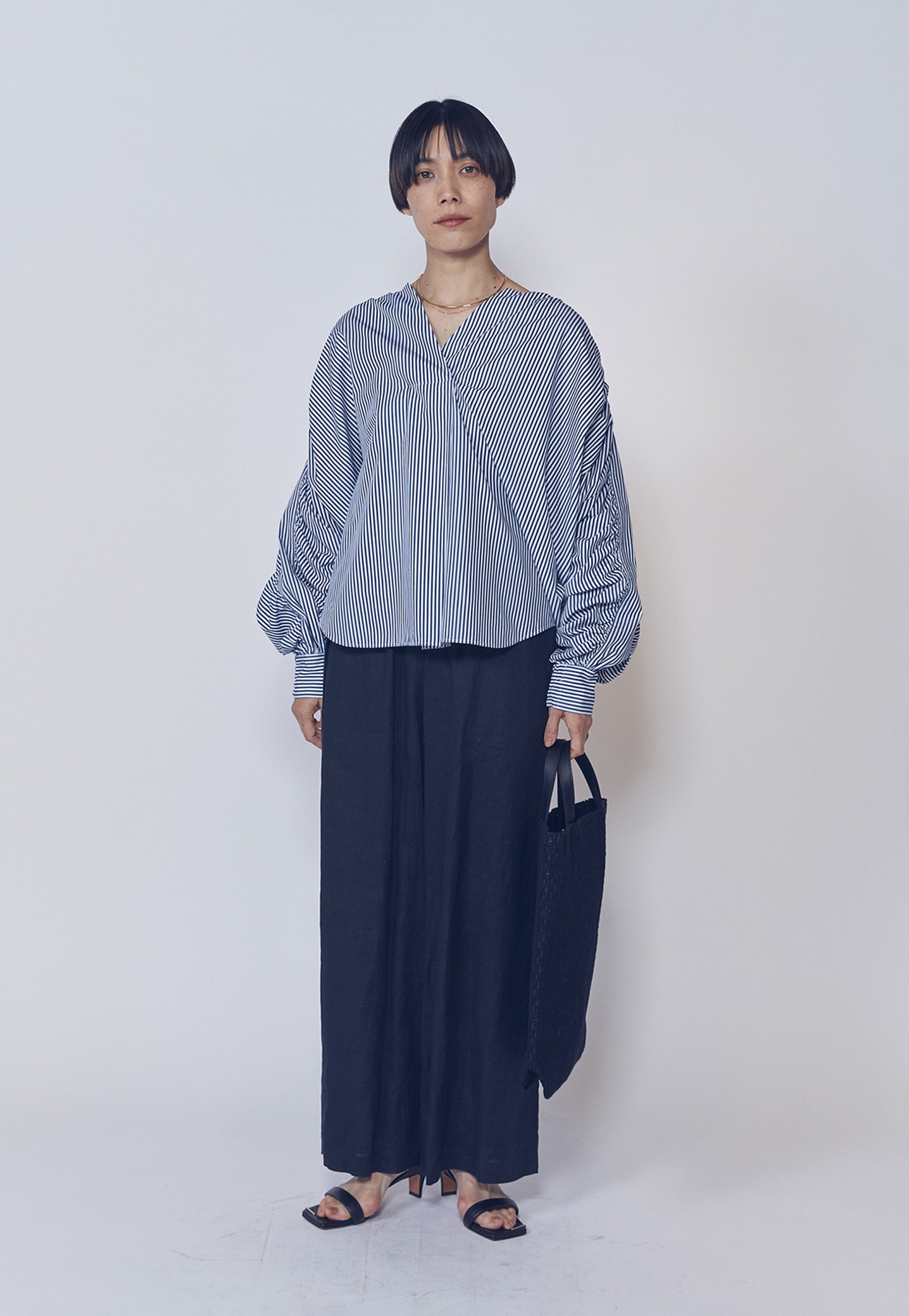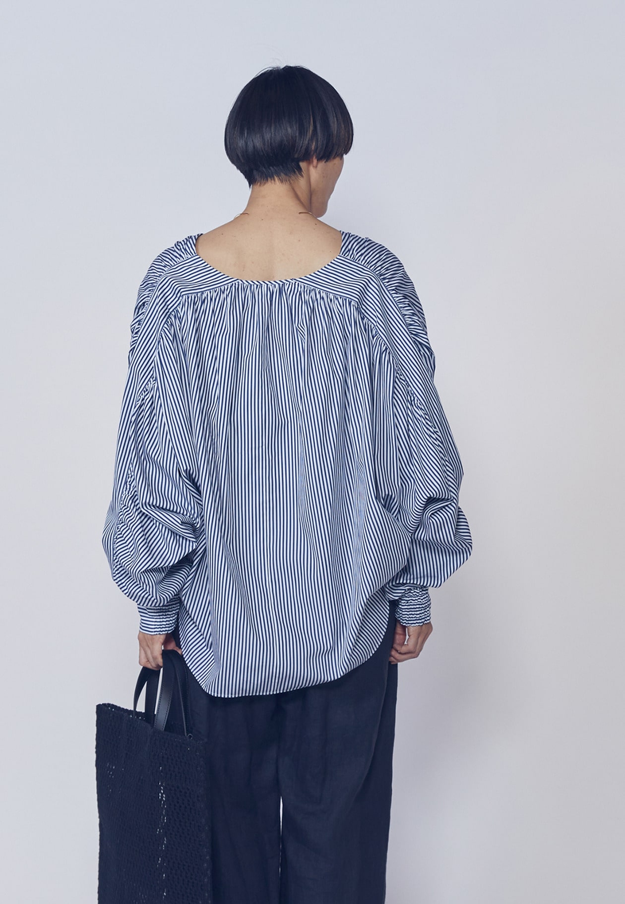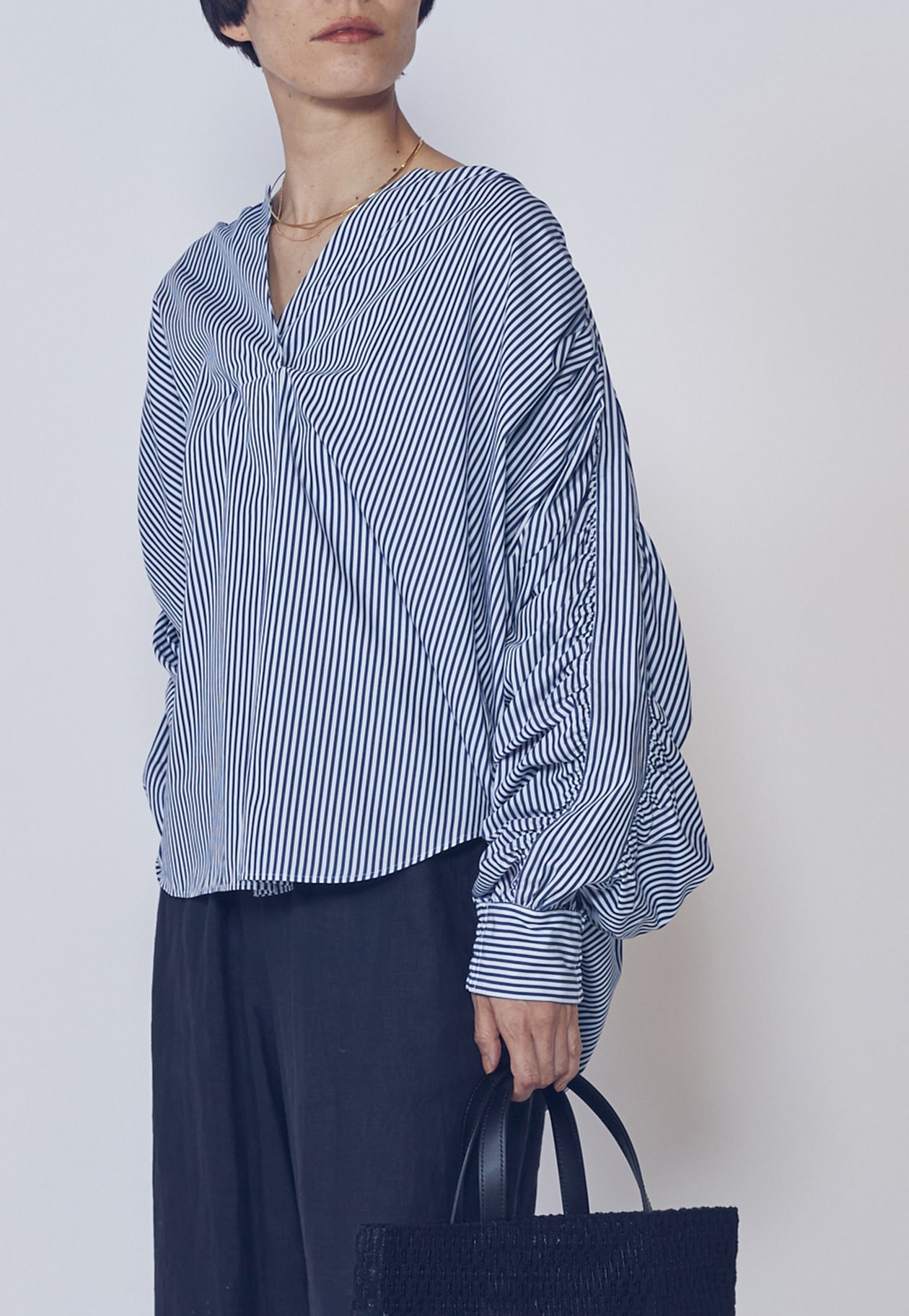 シャツ地に贅沢にタックとギャザーを施し、柔らかな女性らしさを表現したブラウス。