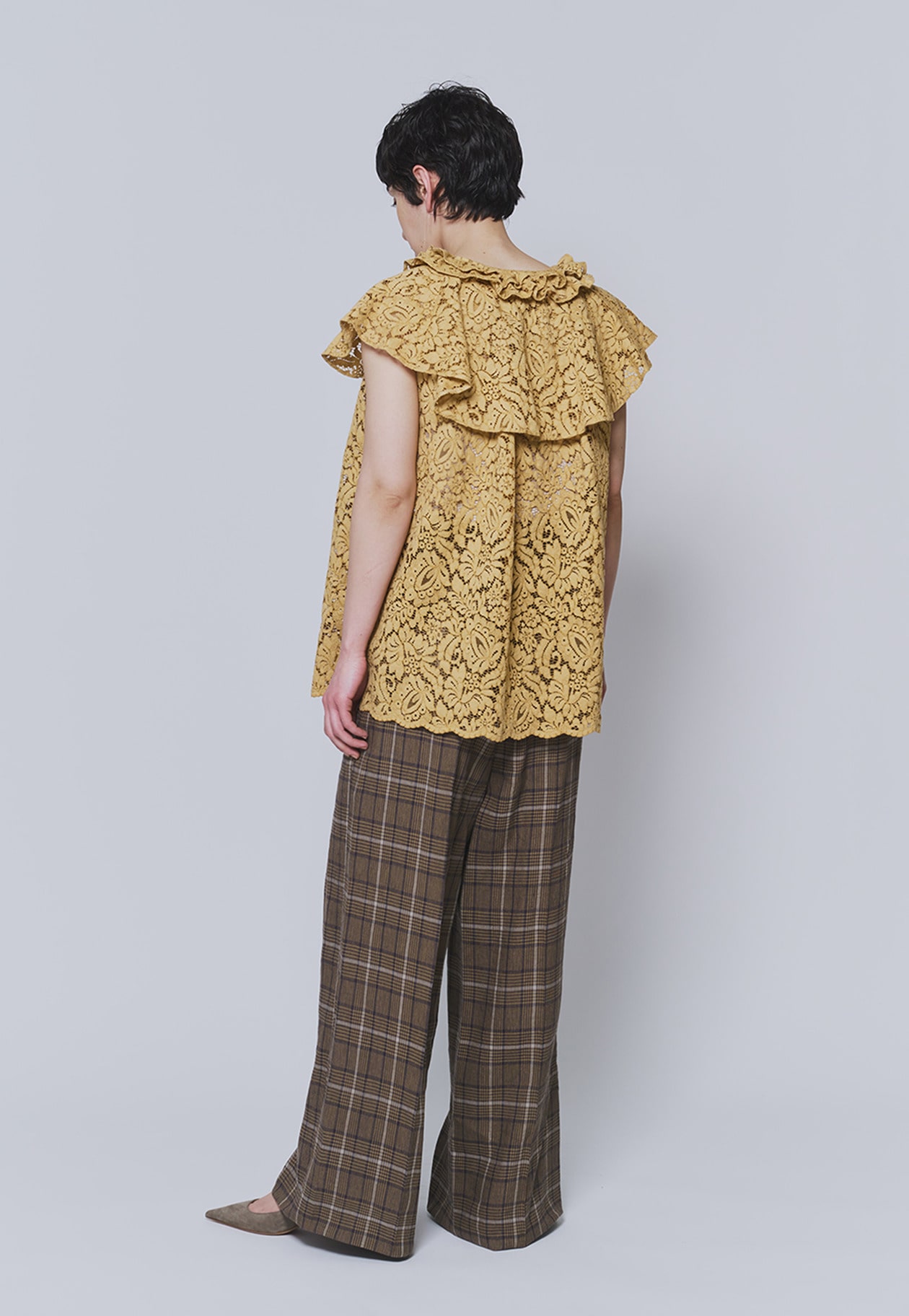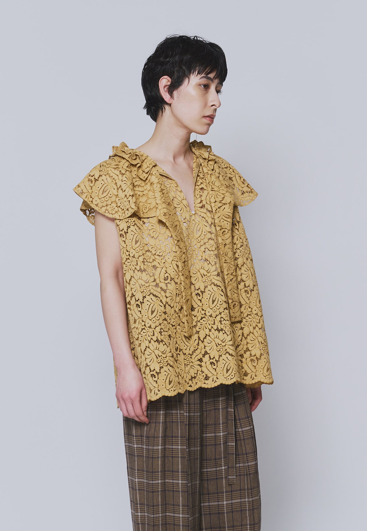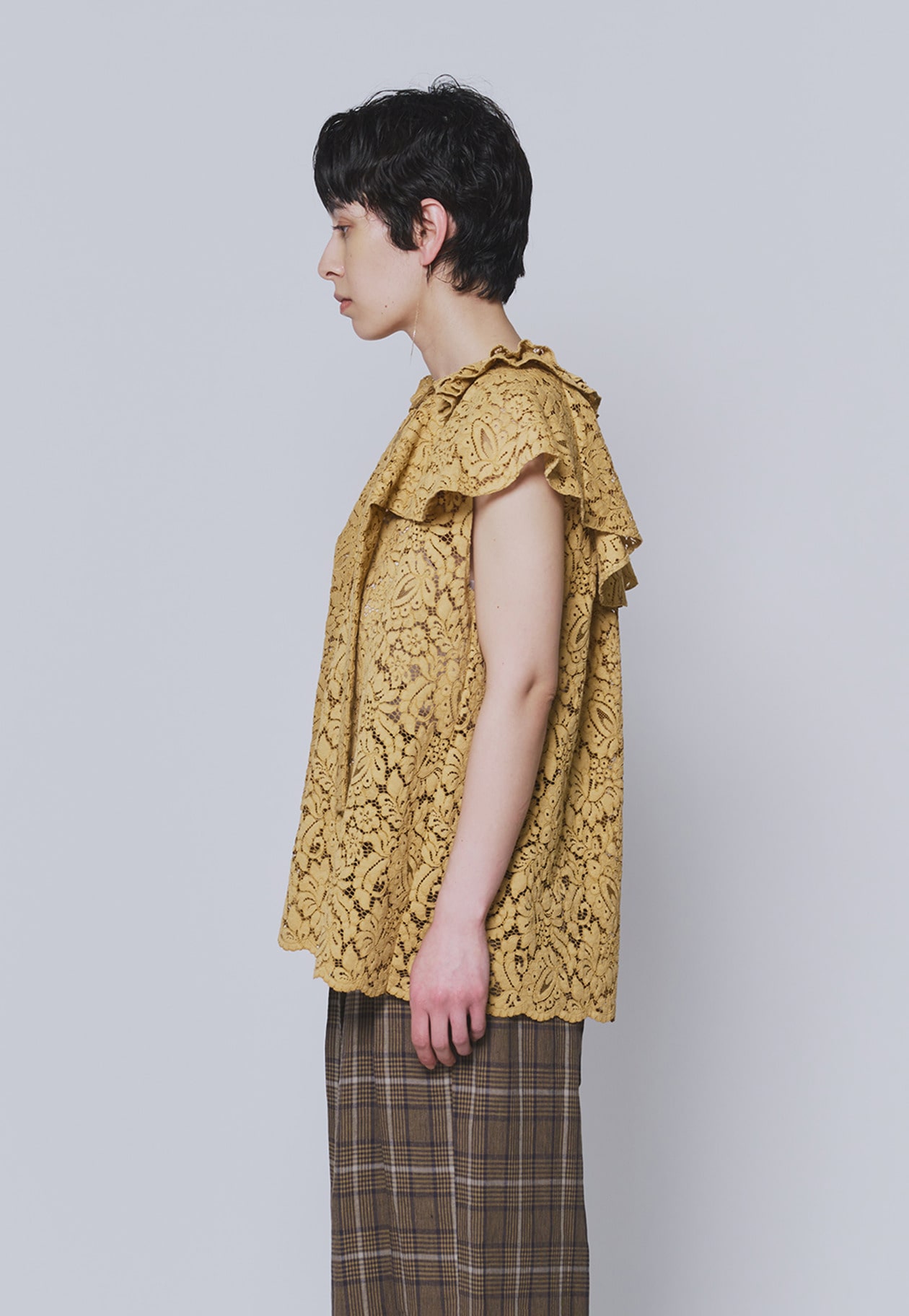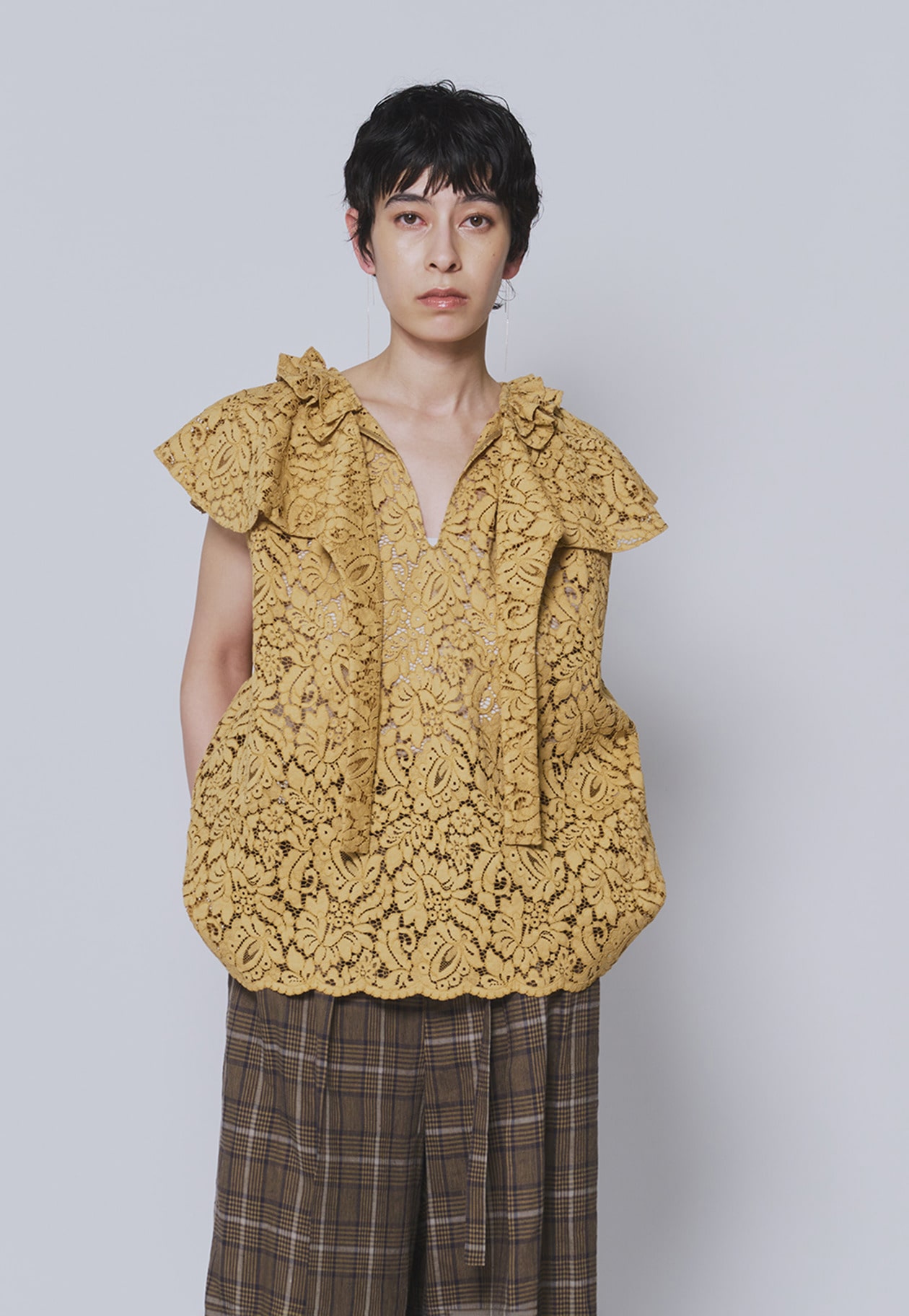 ケープを羽織ったようなモードなデザインに、襟ぐりには共布フリルをあしらい、表情豊かに仕上げています。
