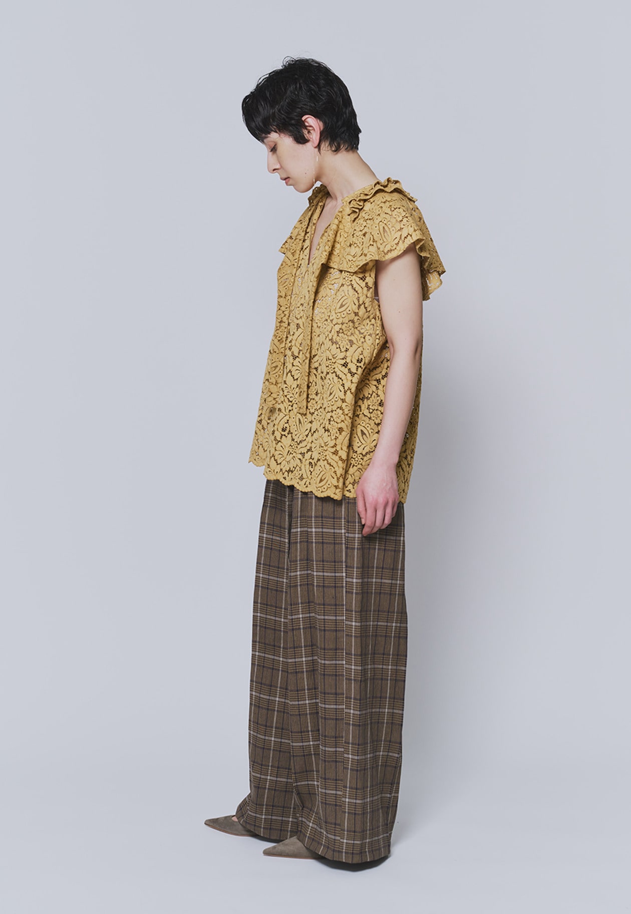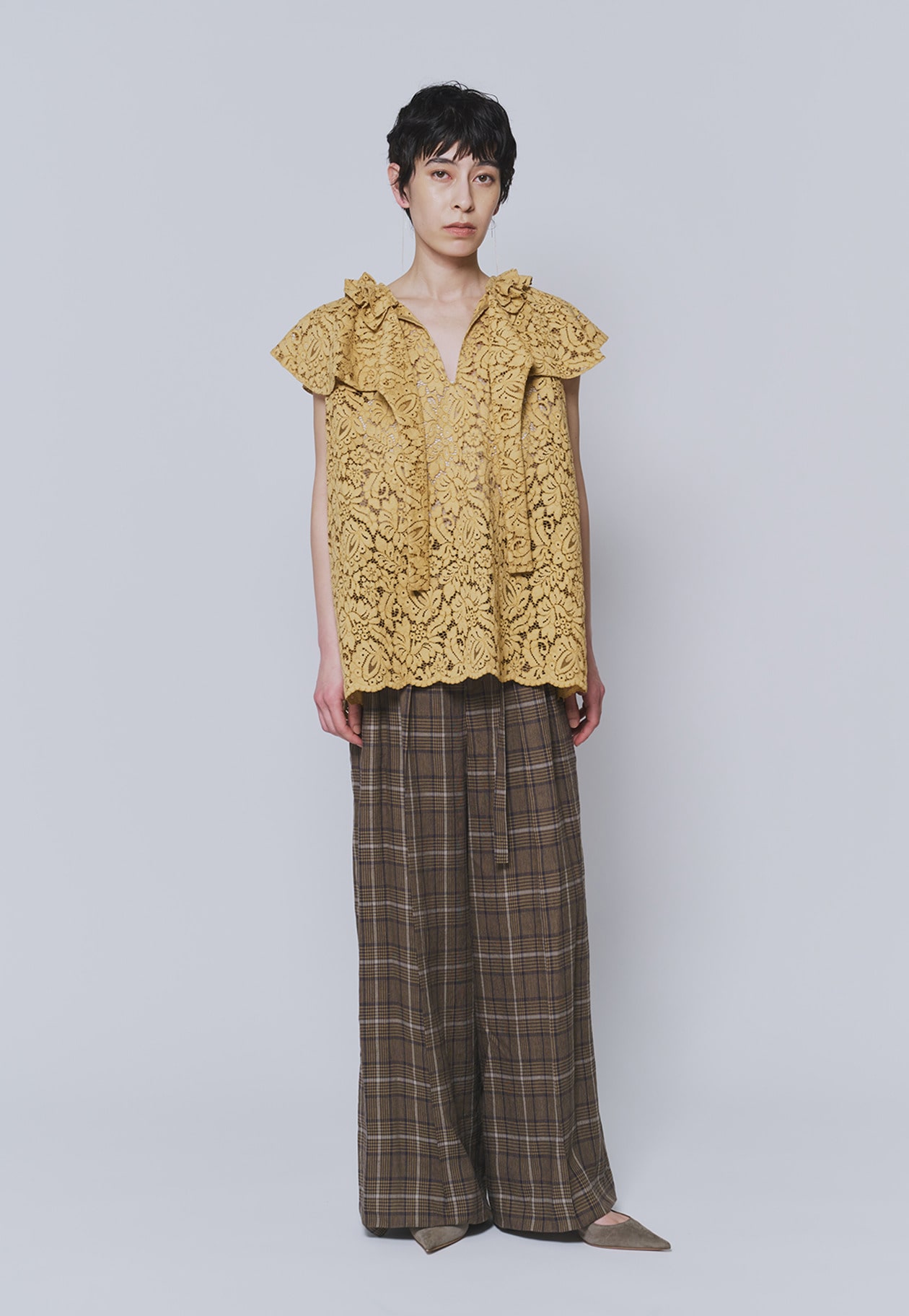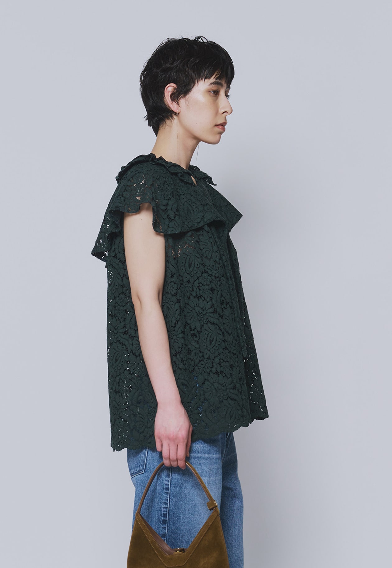 ケープを羽織ったようなモードなデザインに、襟ぐりには共布フリルをあしらい、表情豊かに仕上げています。