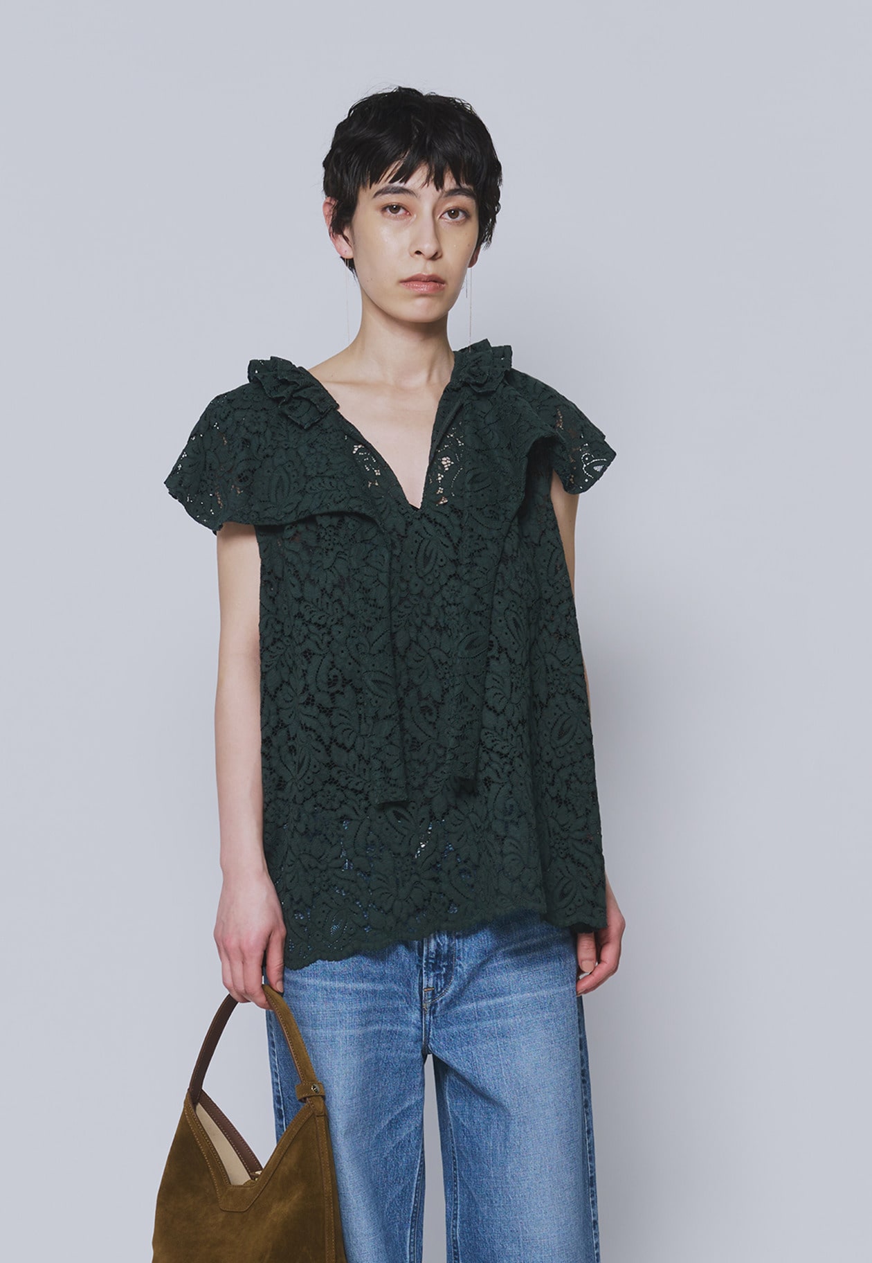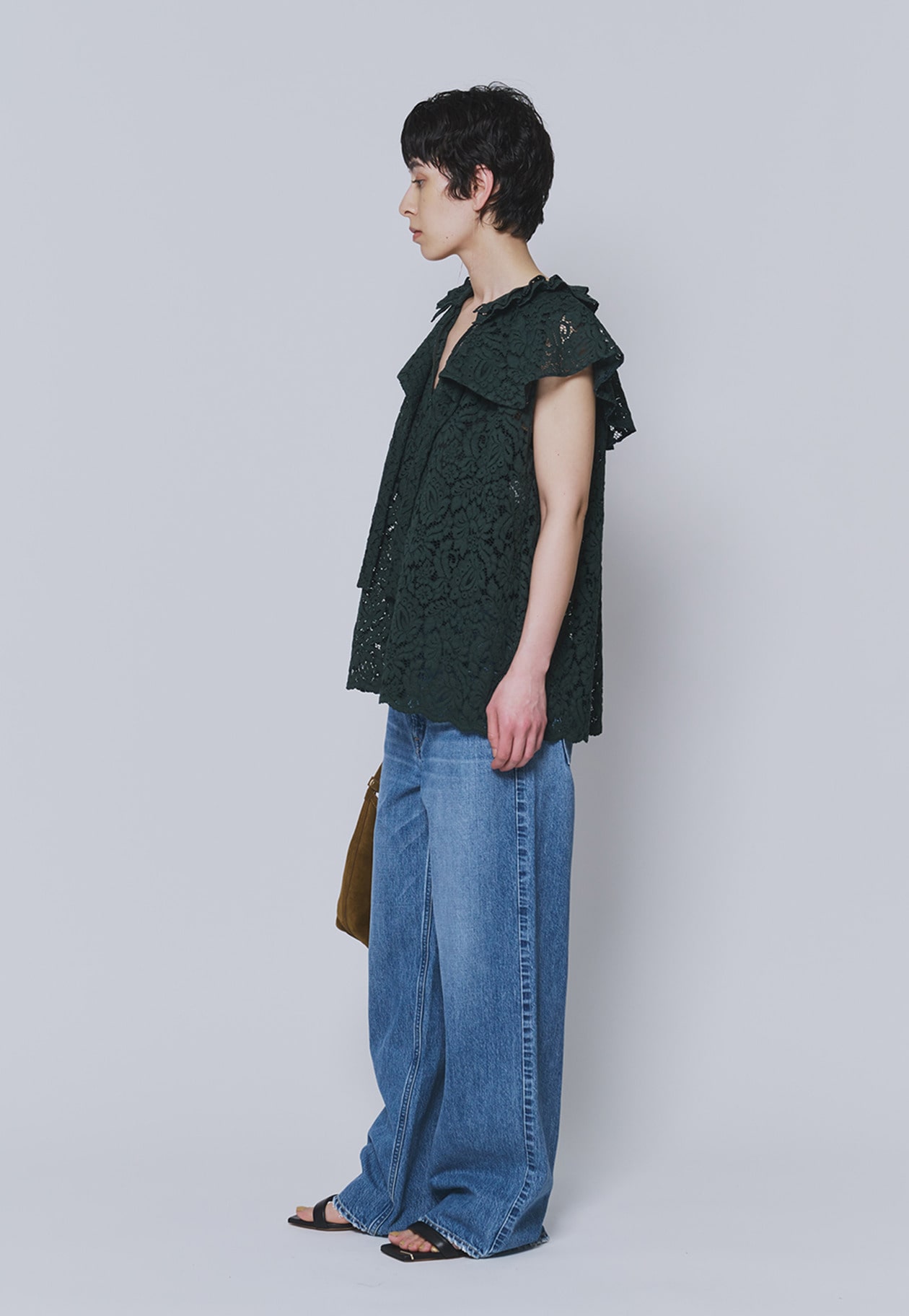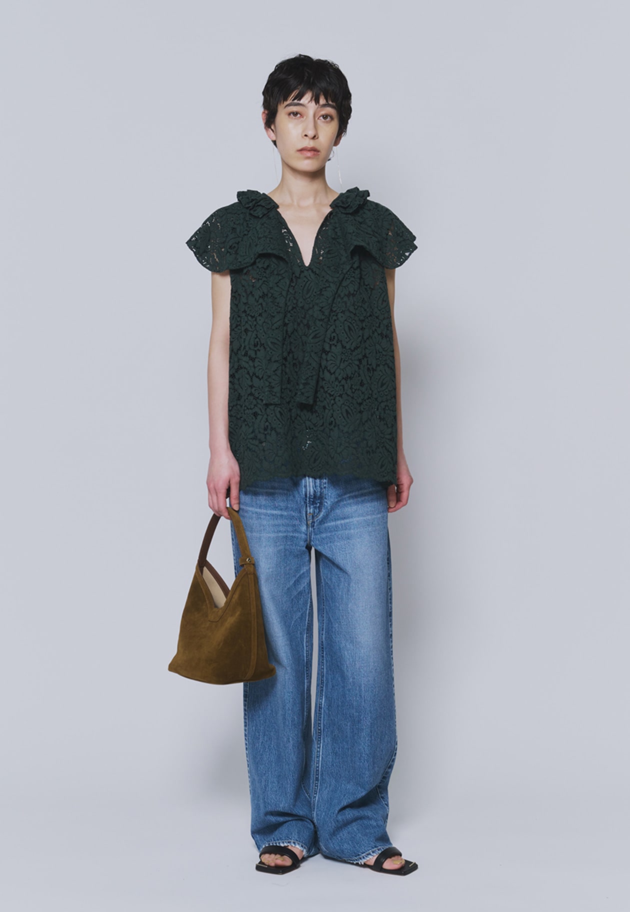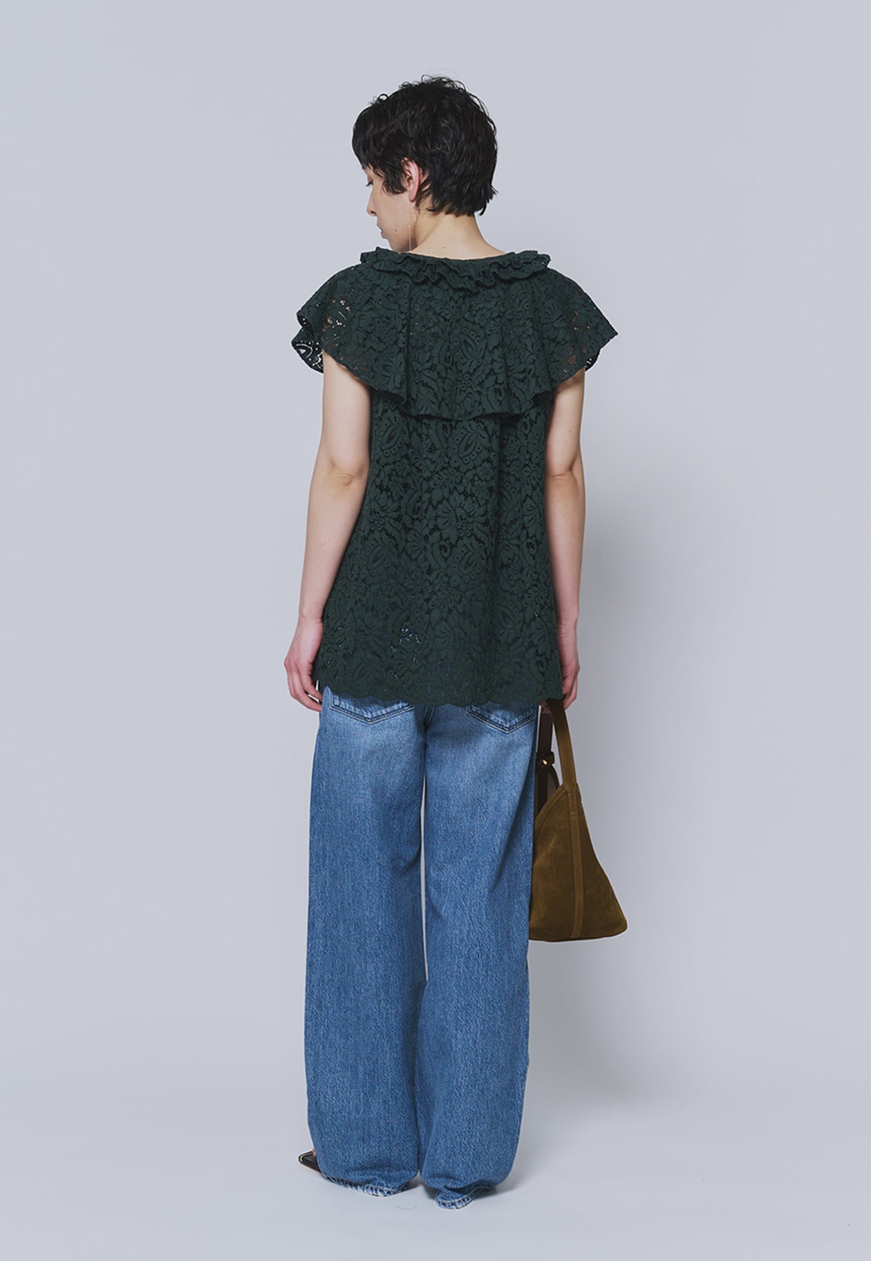 ケープを羽織ったようなモードなデザインに、襟ぐりには共布フリルをあしらい、表情豊かに仕上げています。