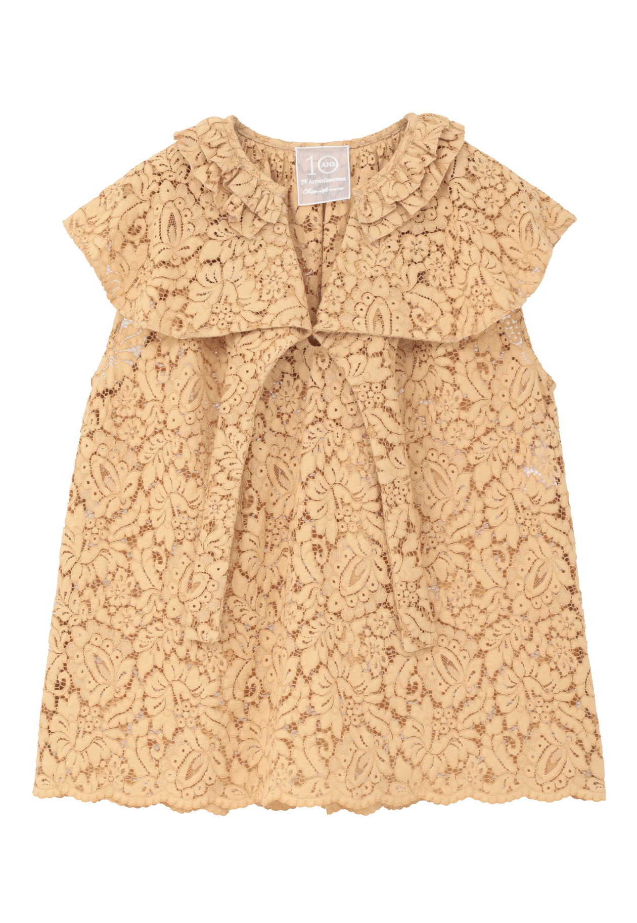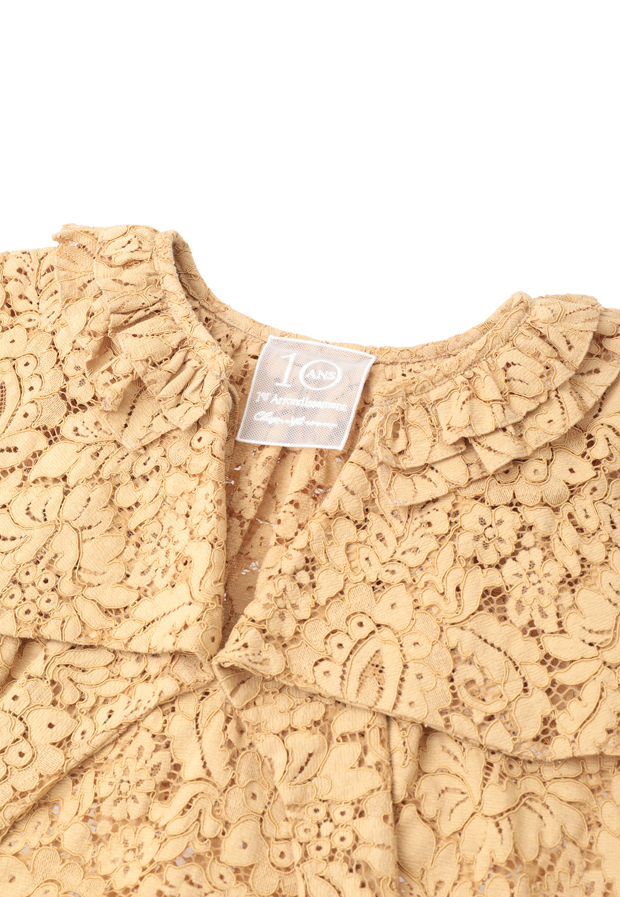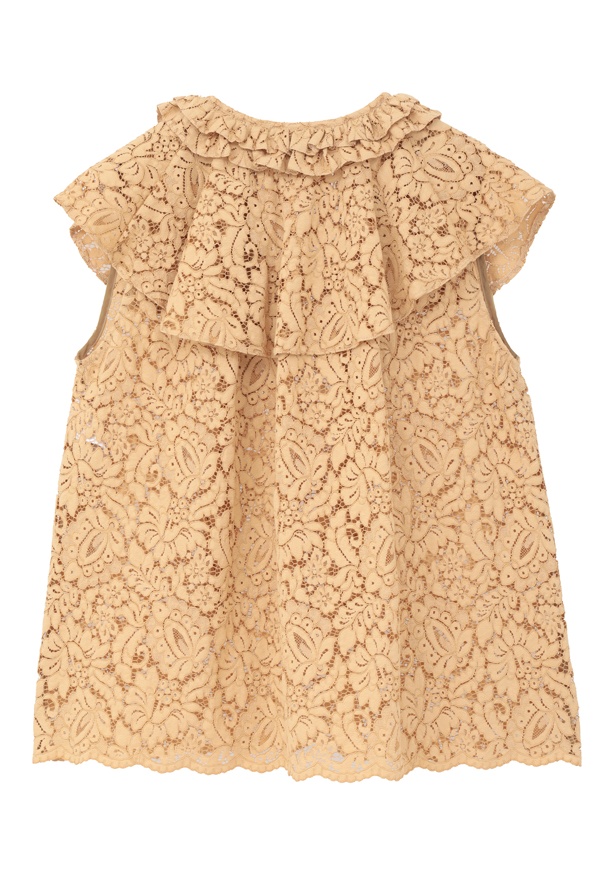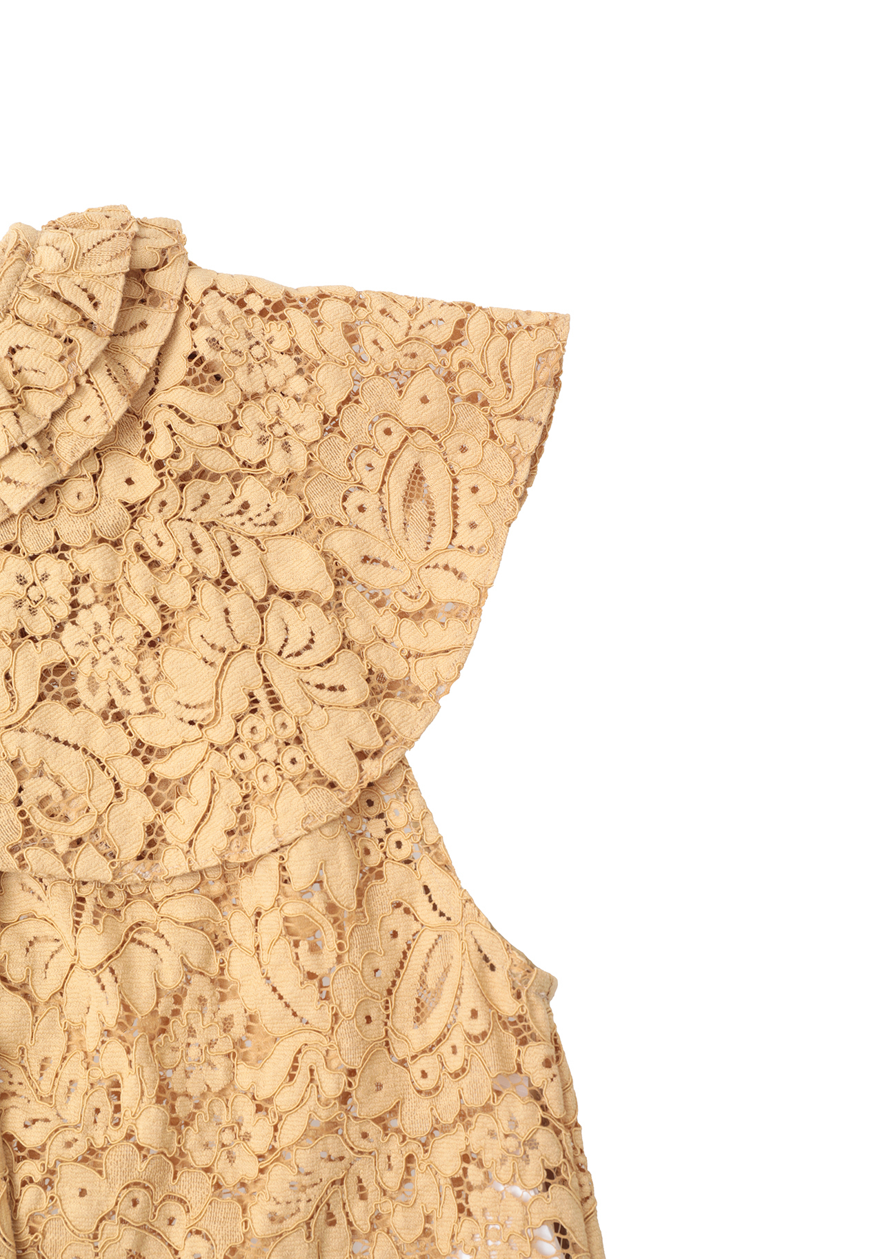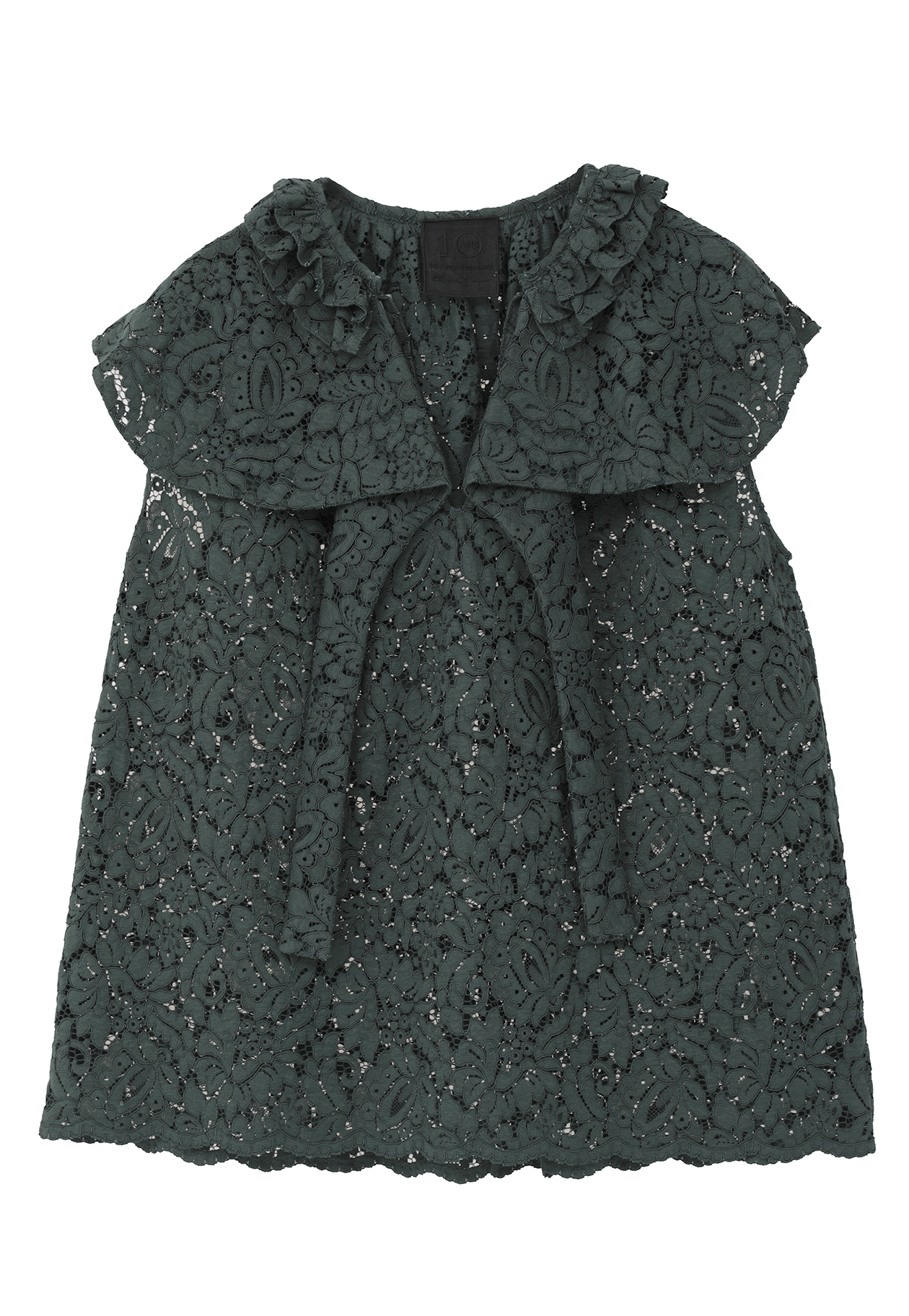 ケープを羽織ったようなモードなデザインに、襟ぐりには共布フリルをあしらい、表情豊かに仕上げています。