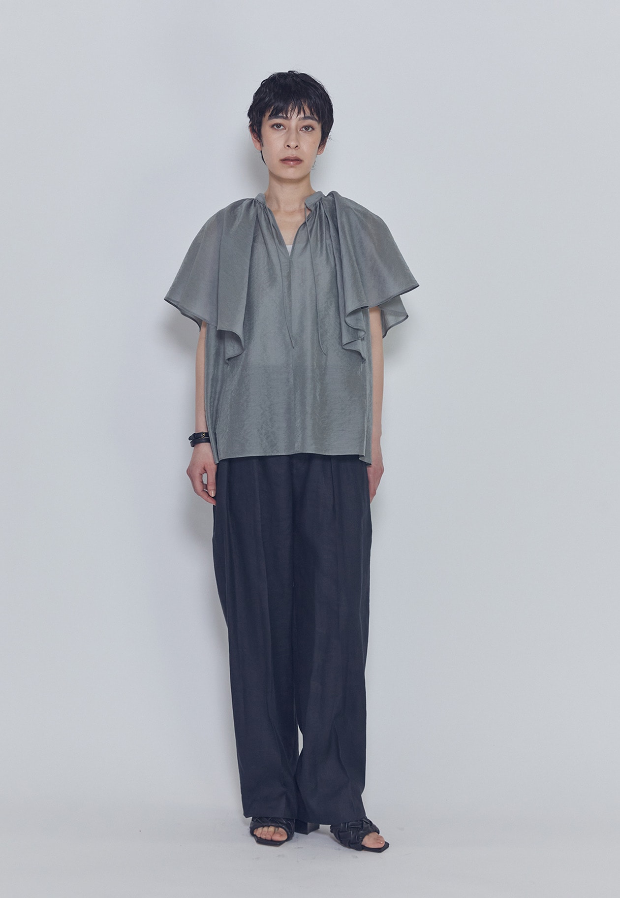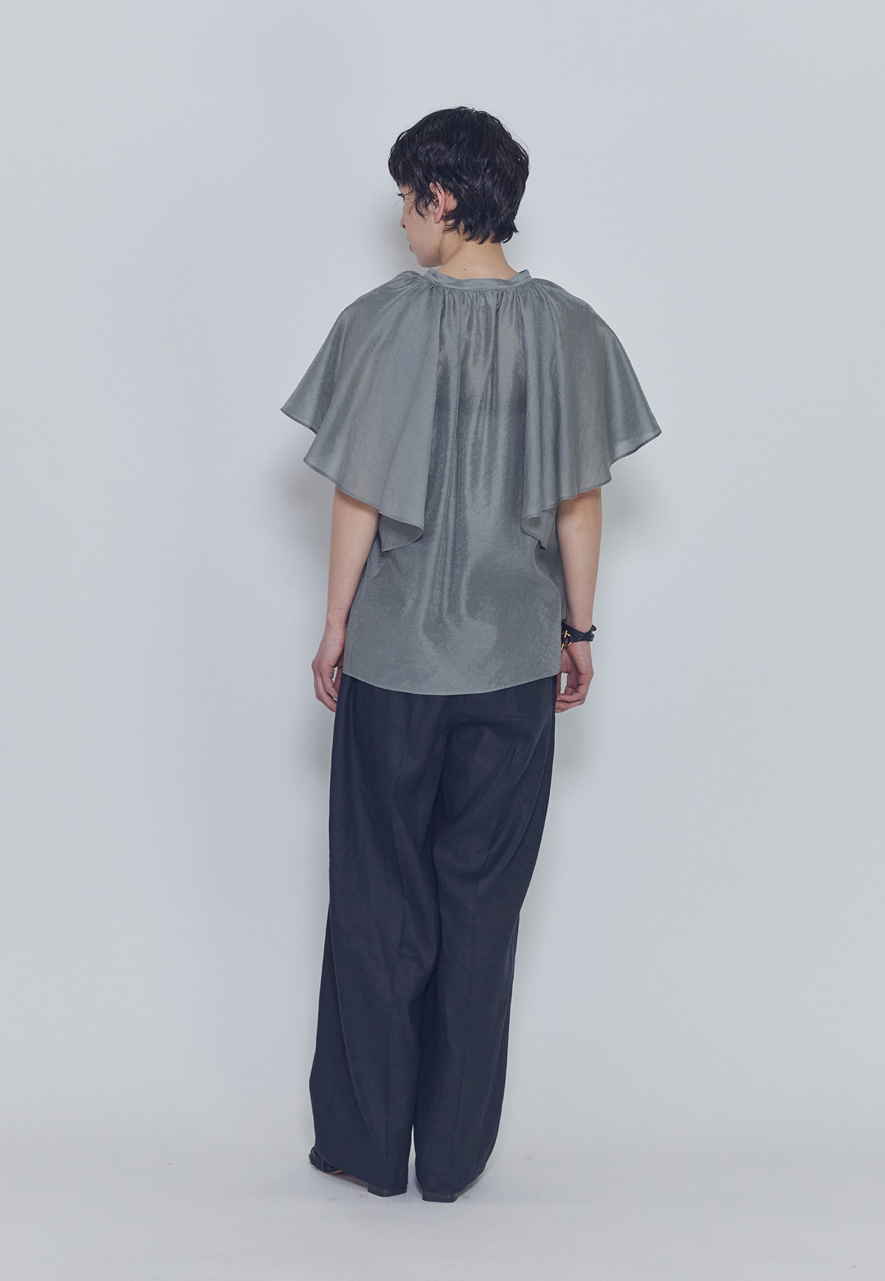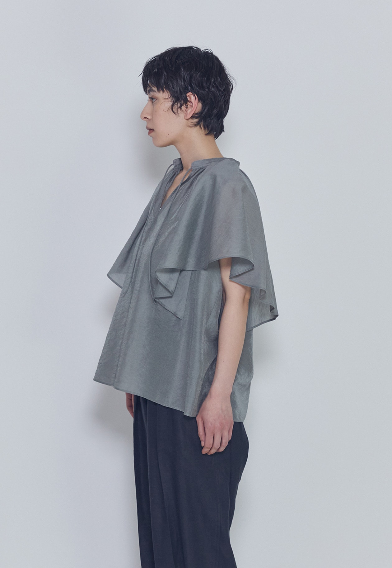 首元のギャザーと袖にたっぷりとフレアを施し、動きのある華やかなデザインに。