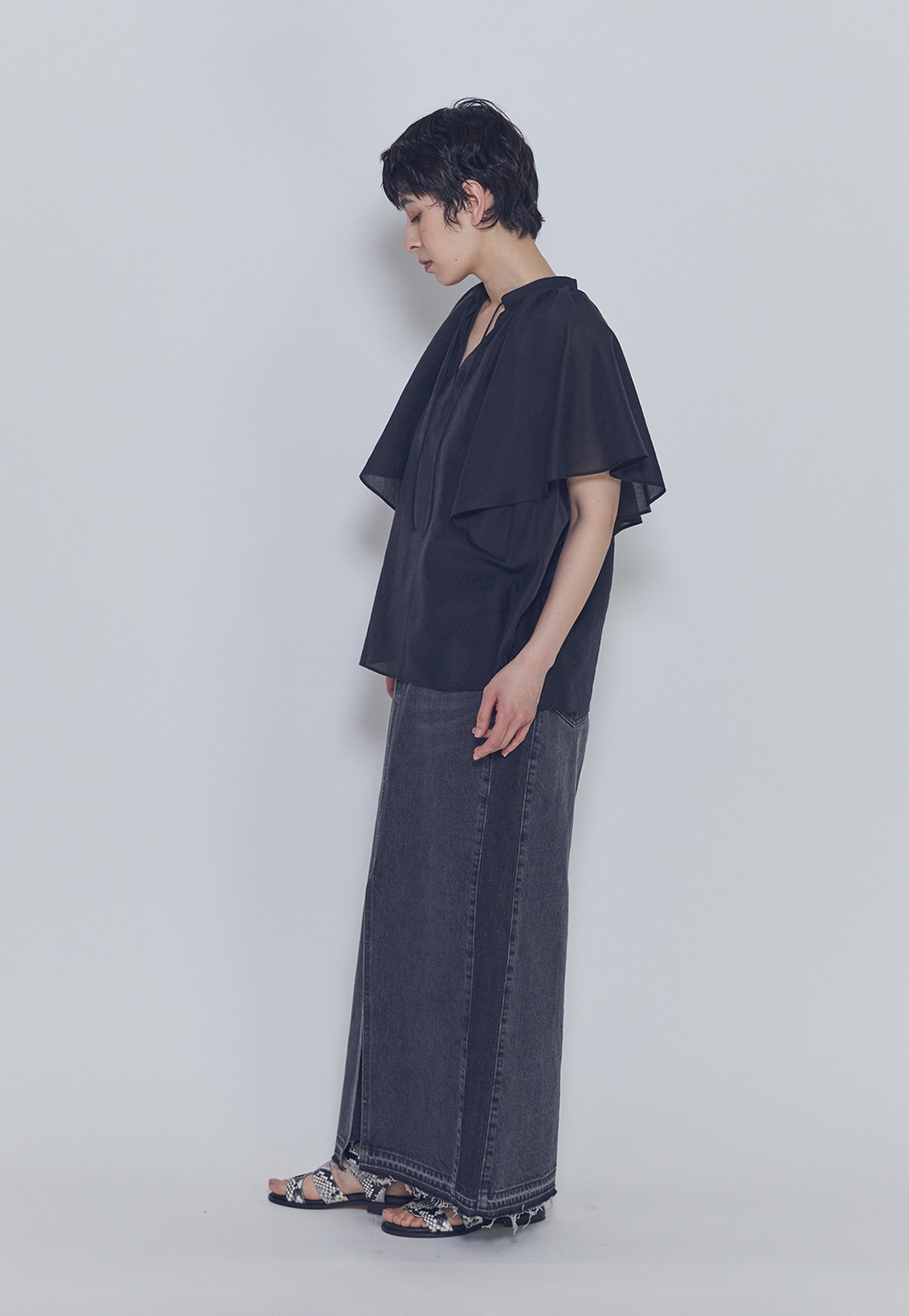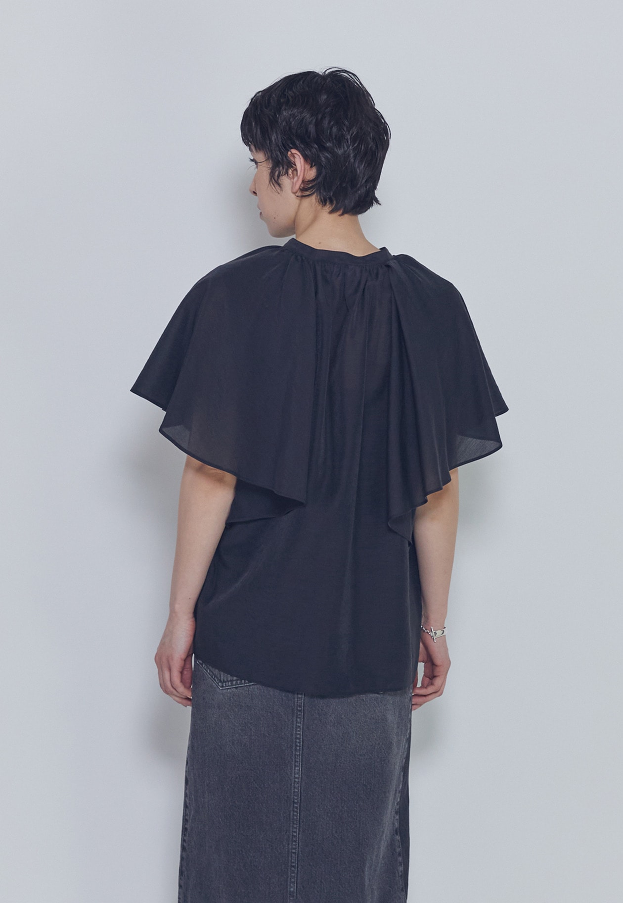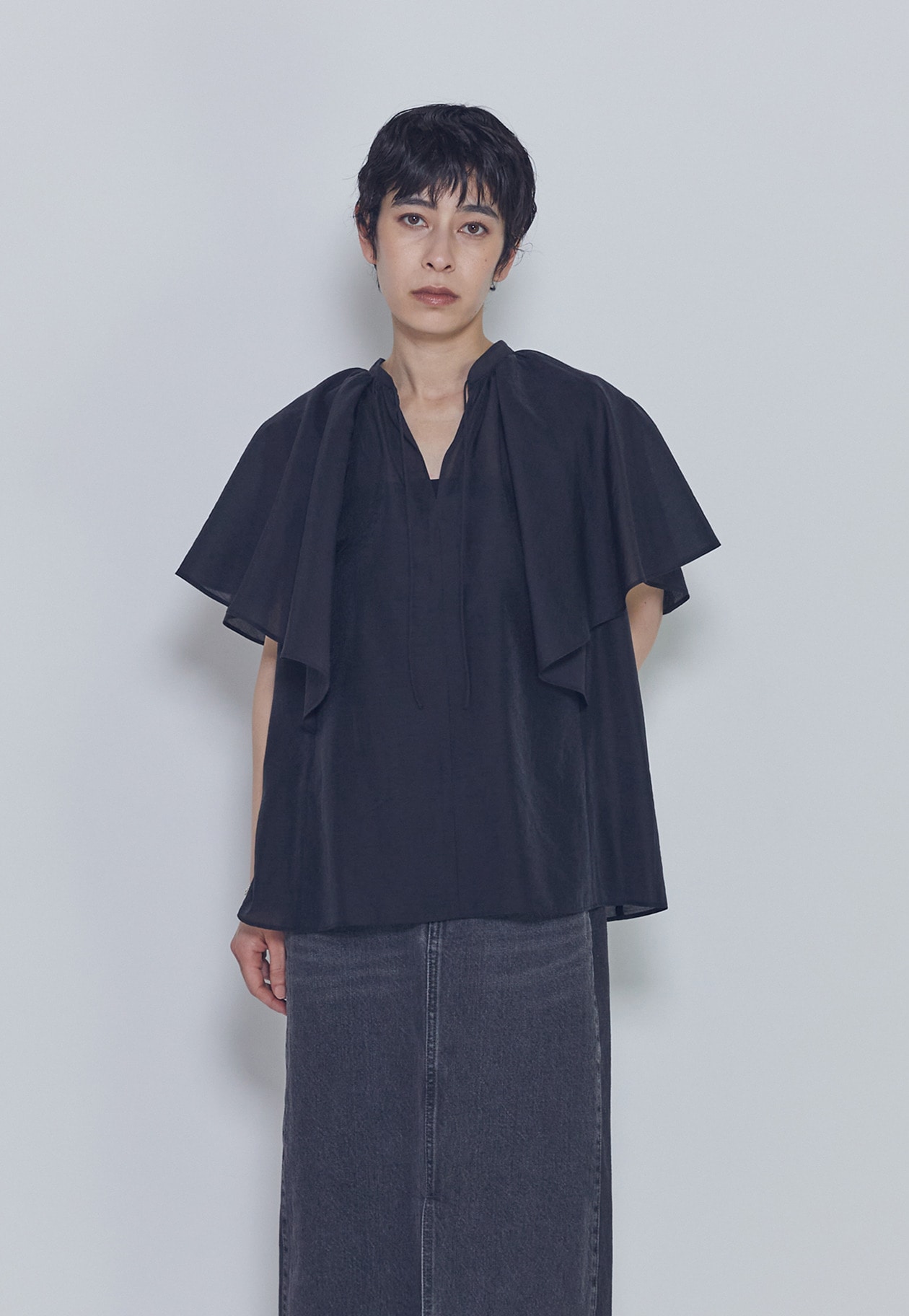 首元のギャザーと袖にたっぷりとフレアを施し、動きのある華やかなデザインに。