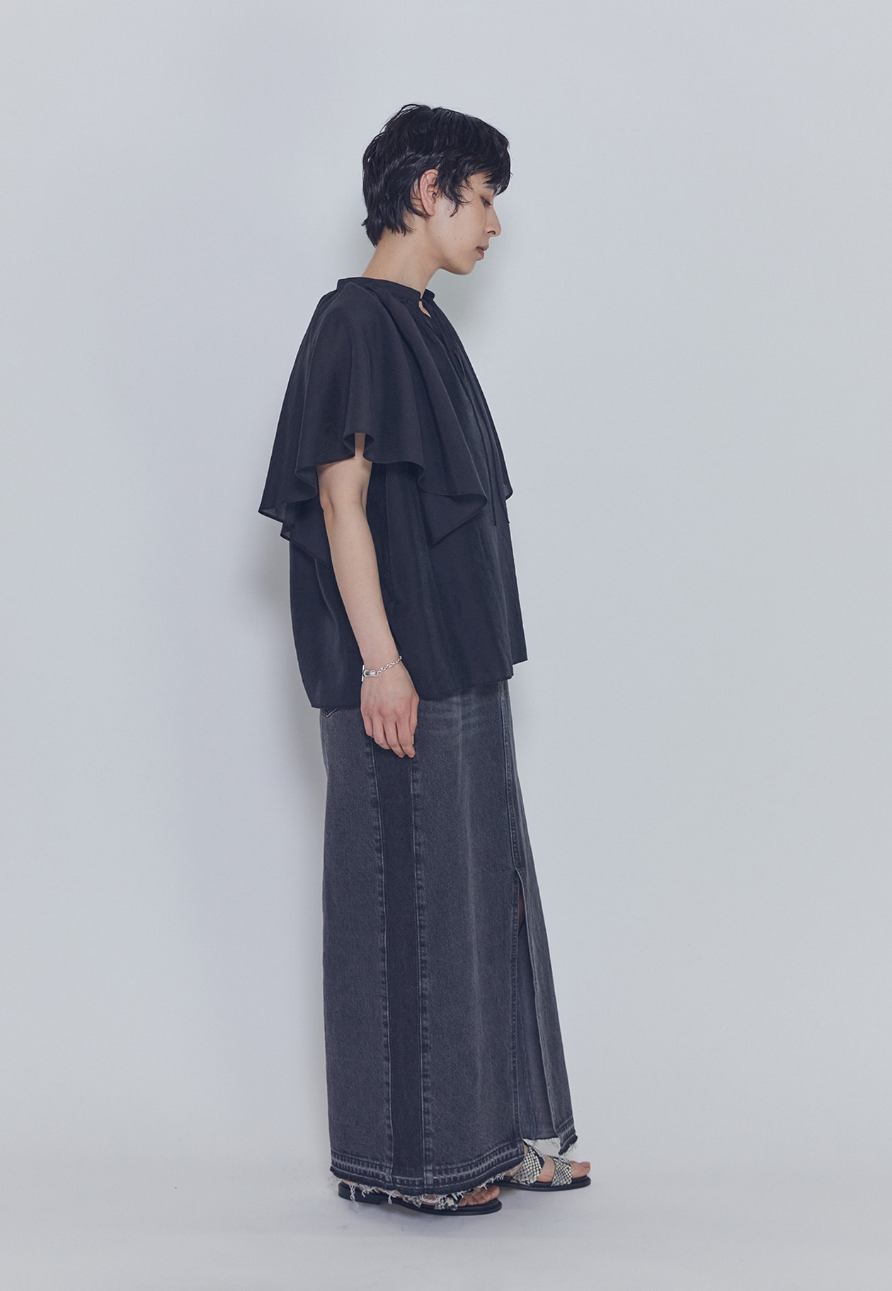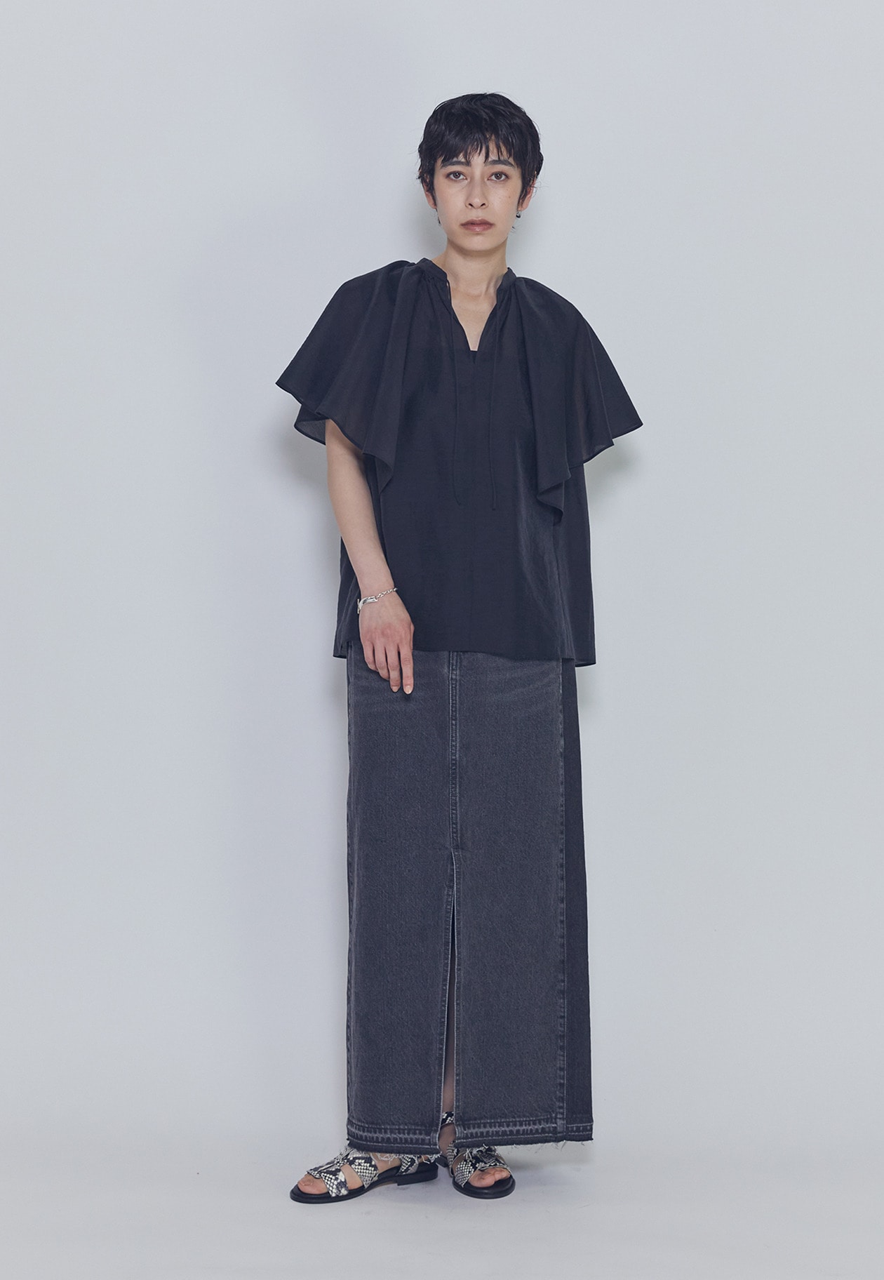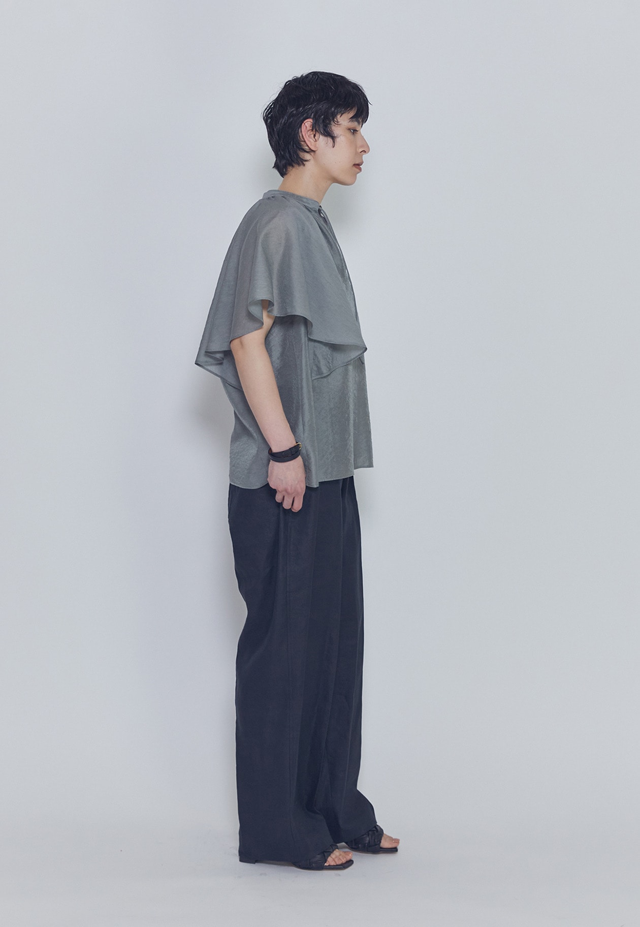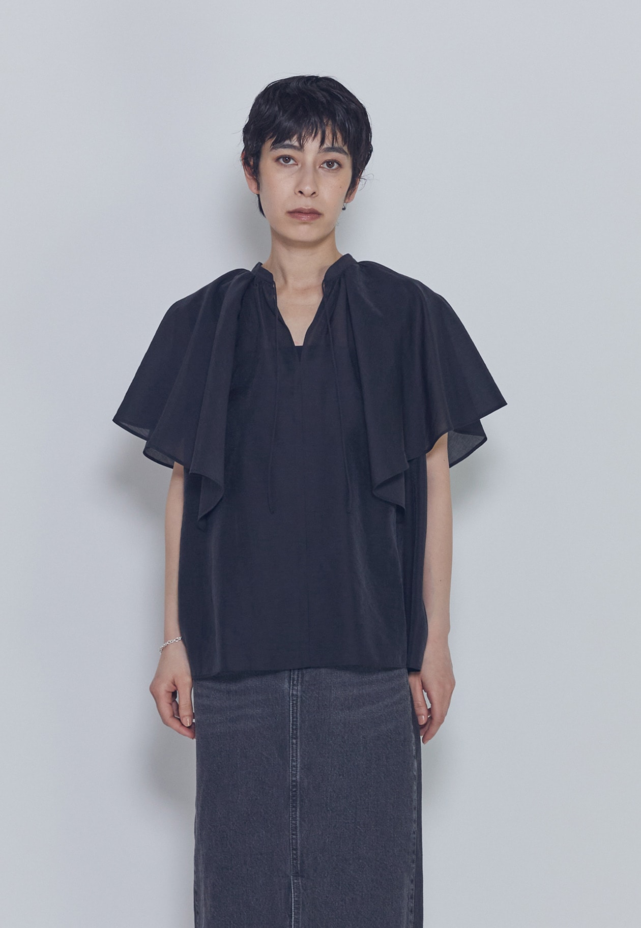 スタンドカラーのスキッパー仕様にすることで、甘くなりすぎず大人にちょうどよいバランスに仕上げています。