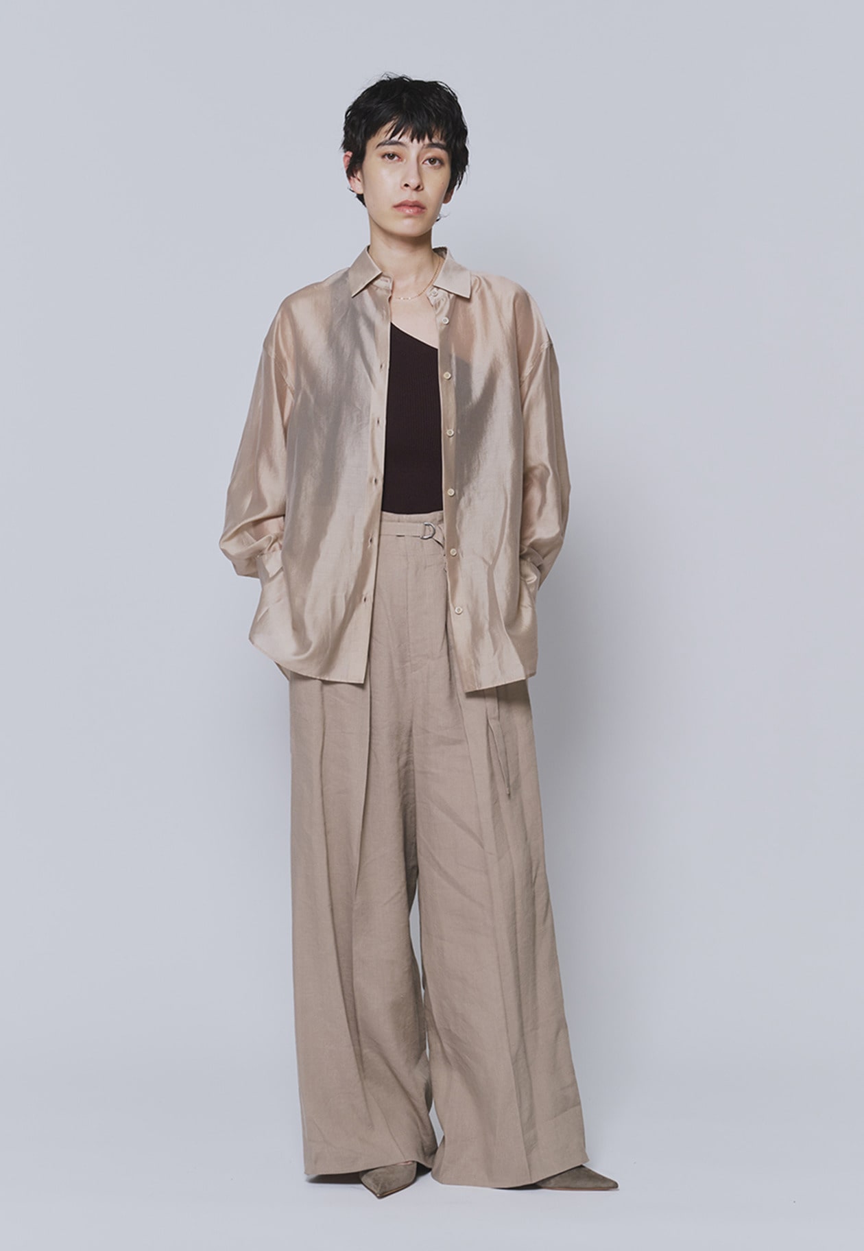 後ろタックから自然に広がるシルエットが、女性らしい印象を引き立てます。