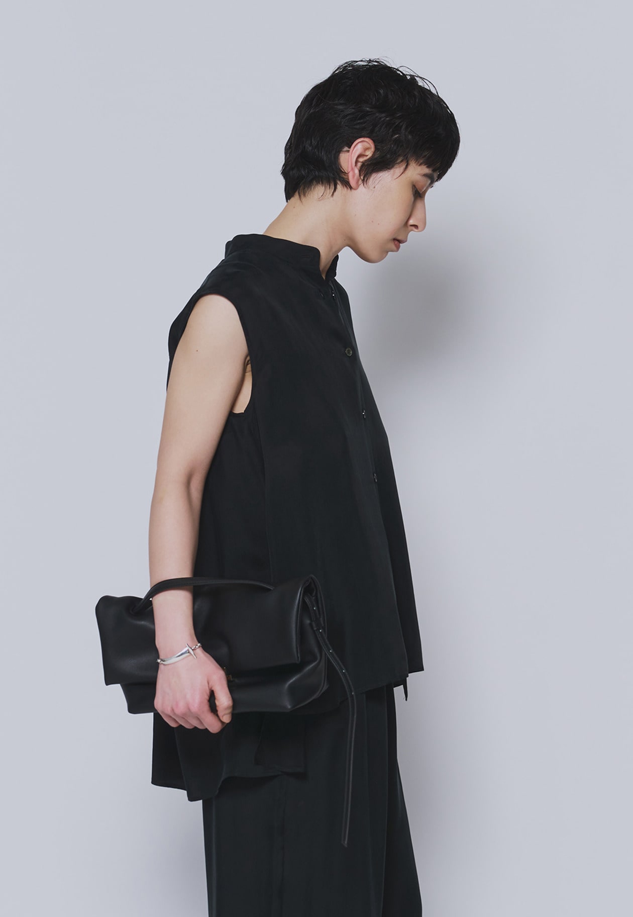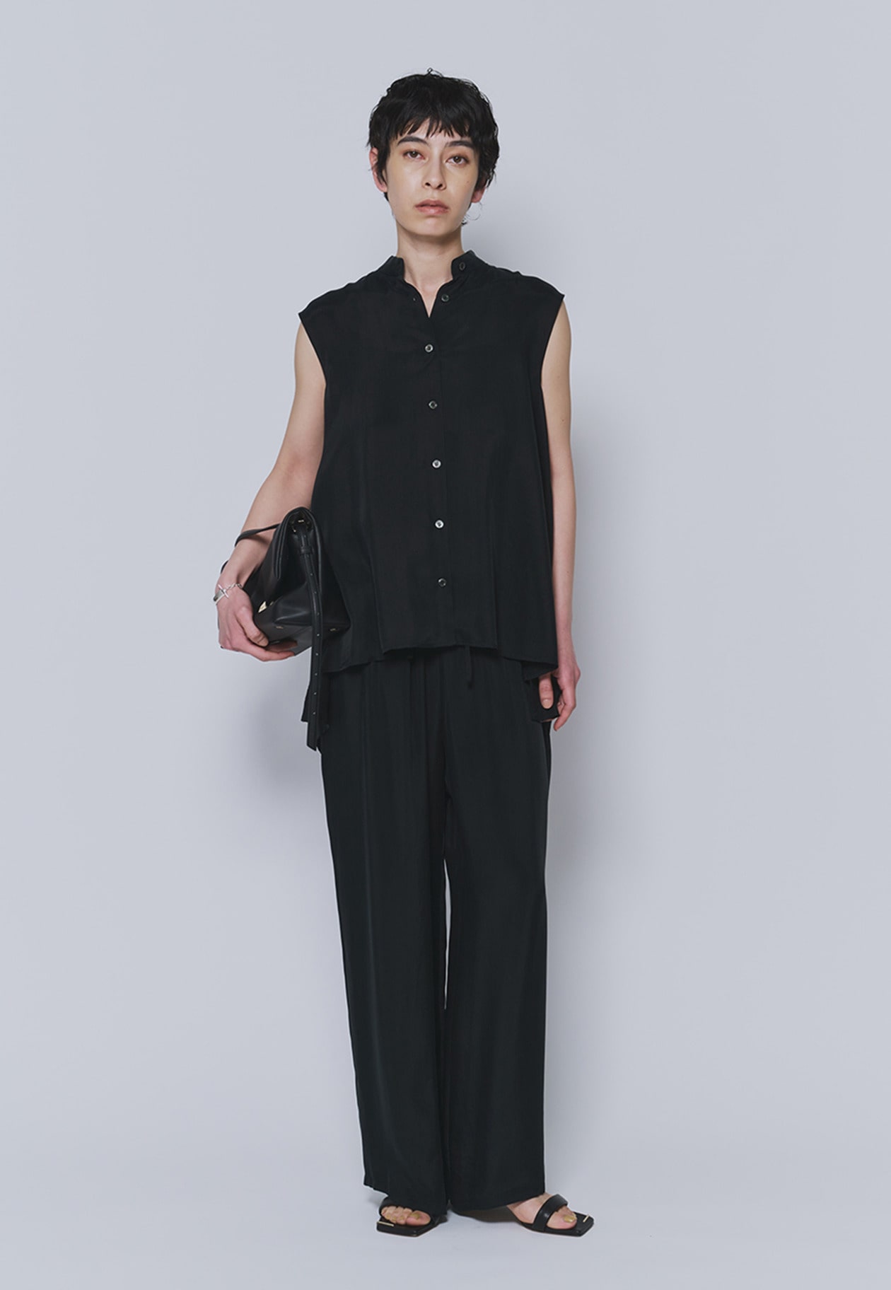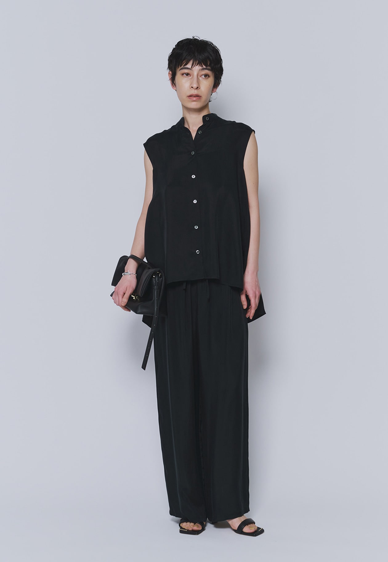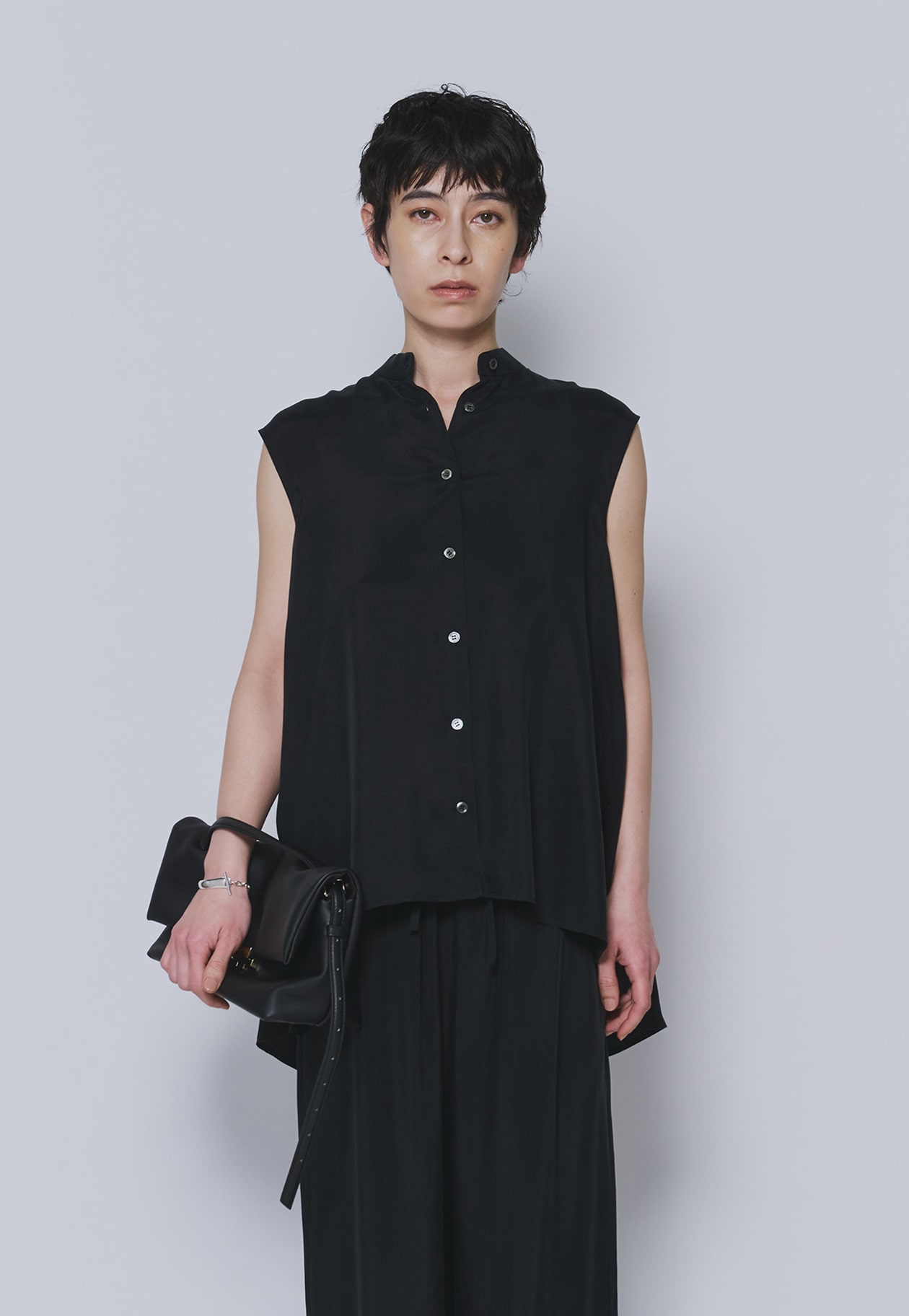マットな光沢ととろみのあるキュプラ素材を使用した、フレンチスリーブのスタンドカラーブラウス。