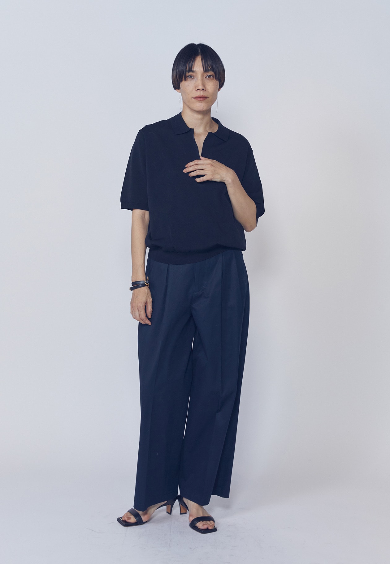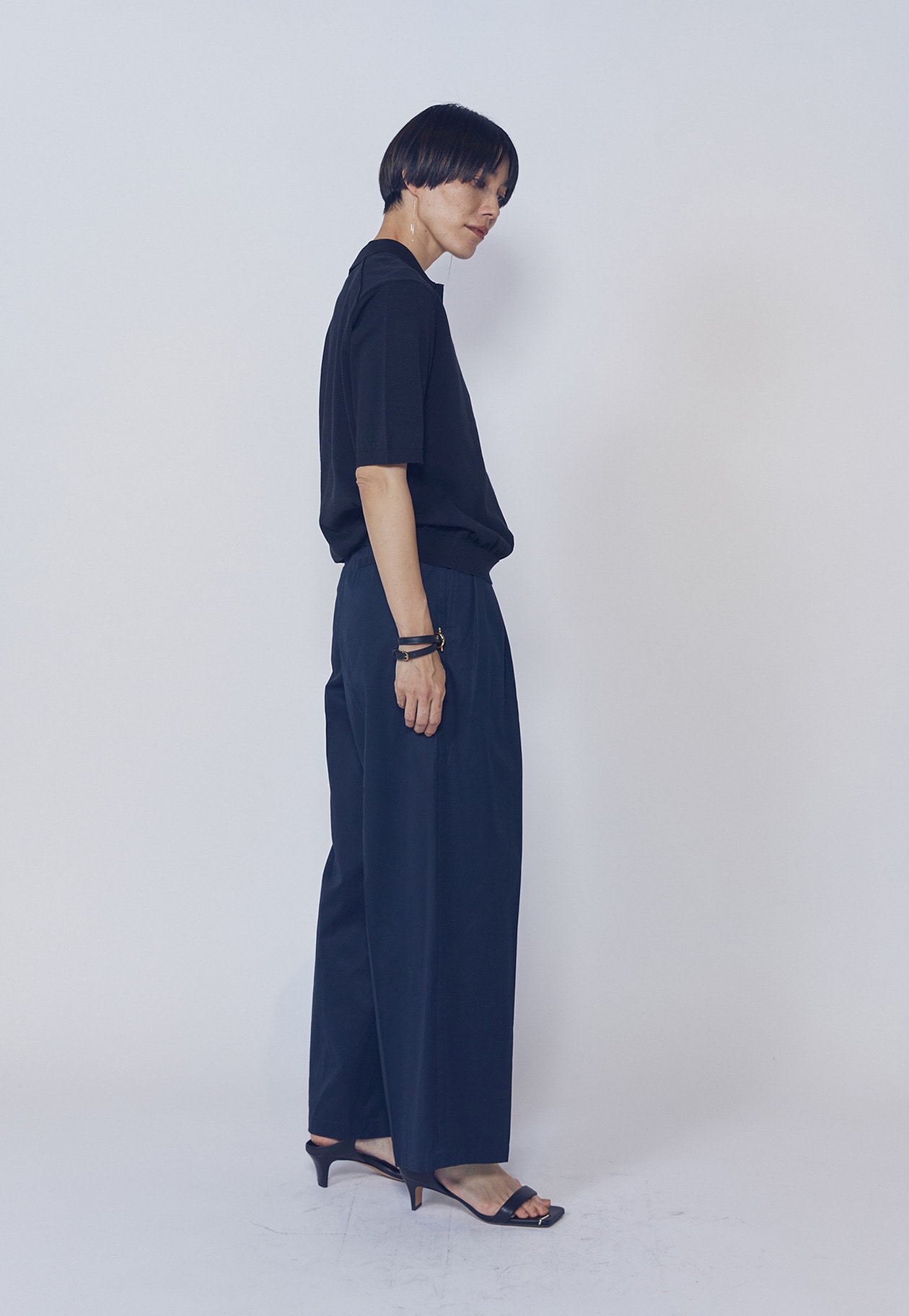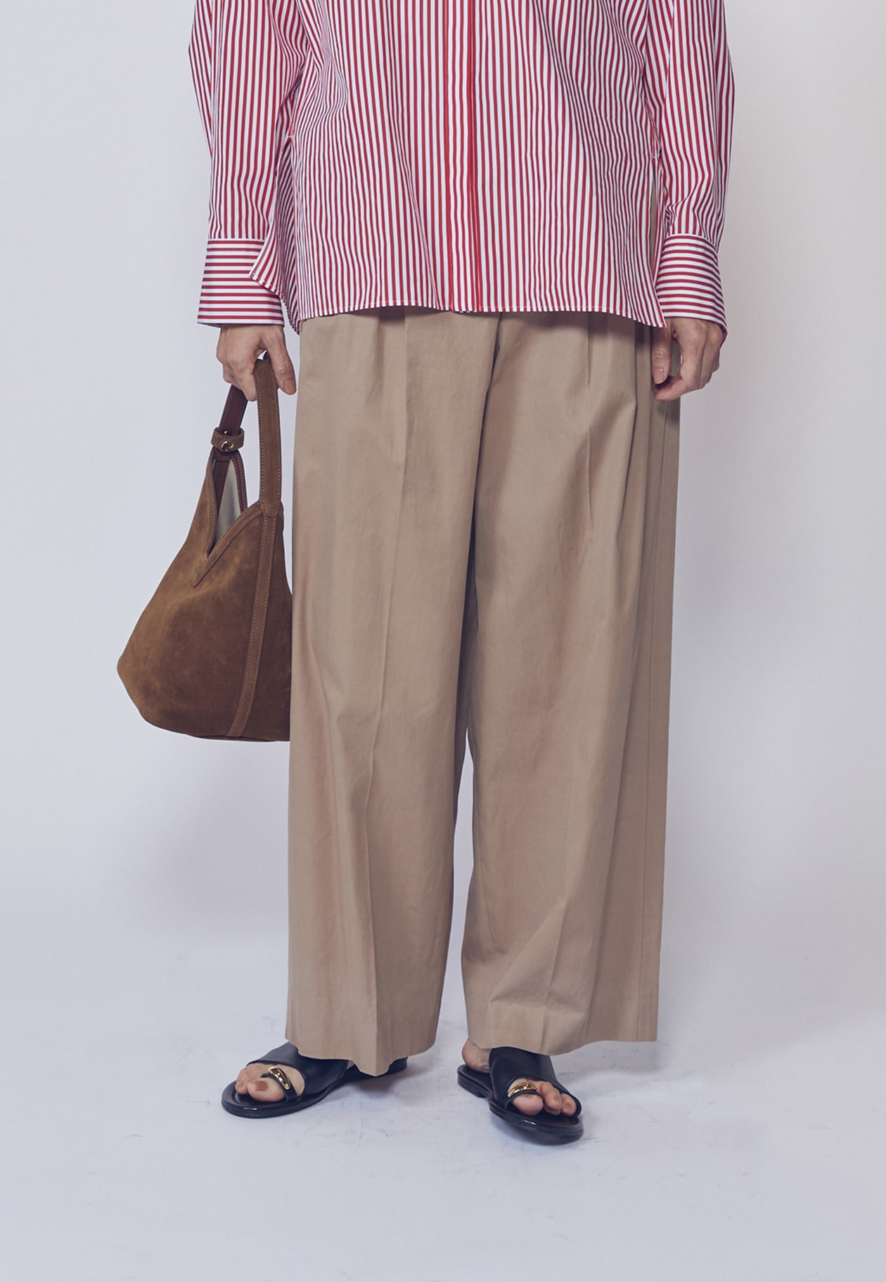 すっきりとしたワイドシルエットながら、特徴的なタックデザインがさりげないアクセントに。