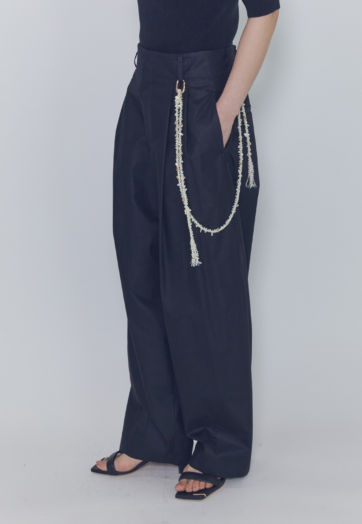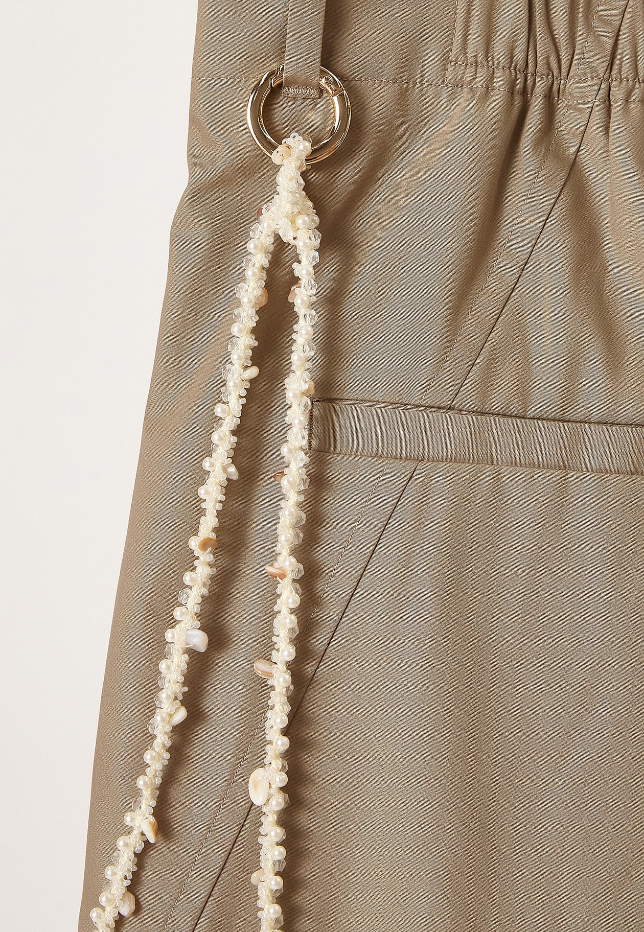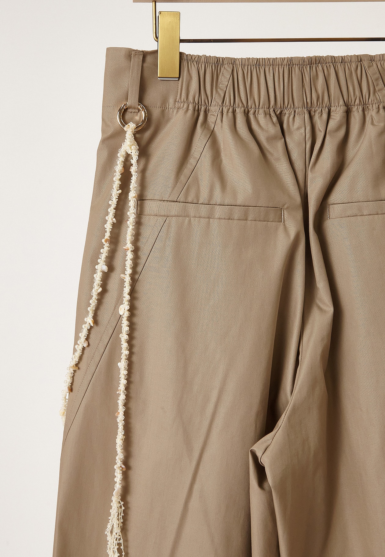 シェルパーツが散りばめられたチェーン付きパンツ。