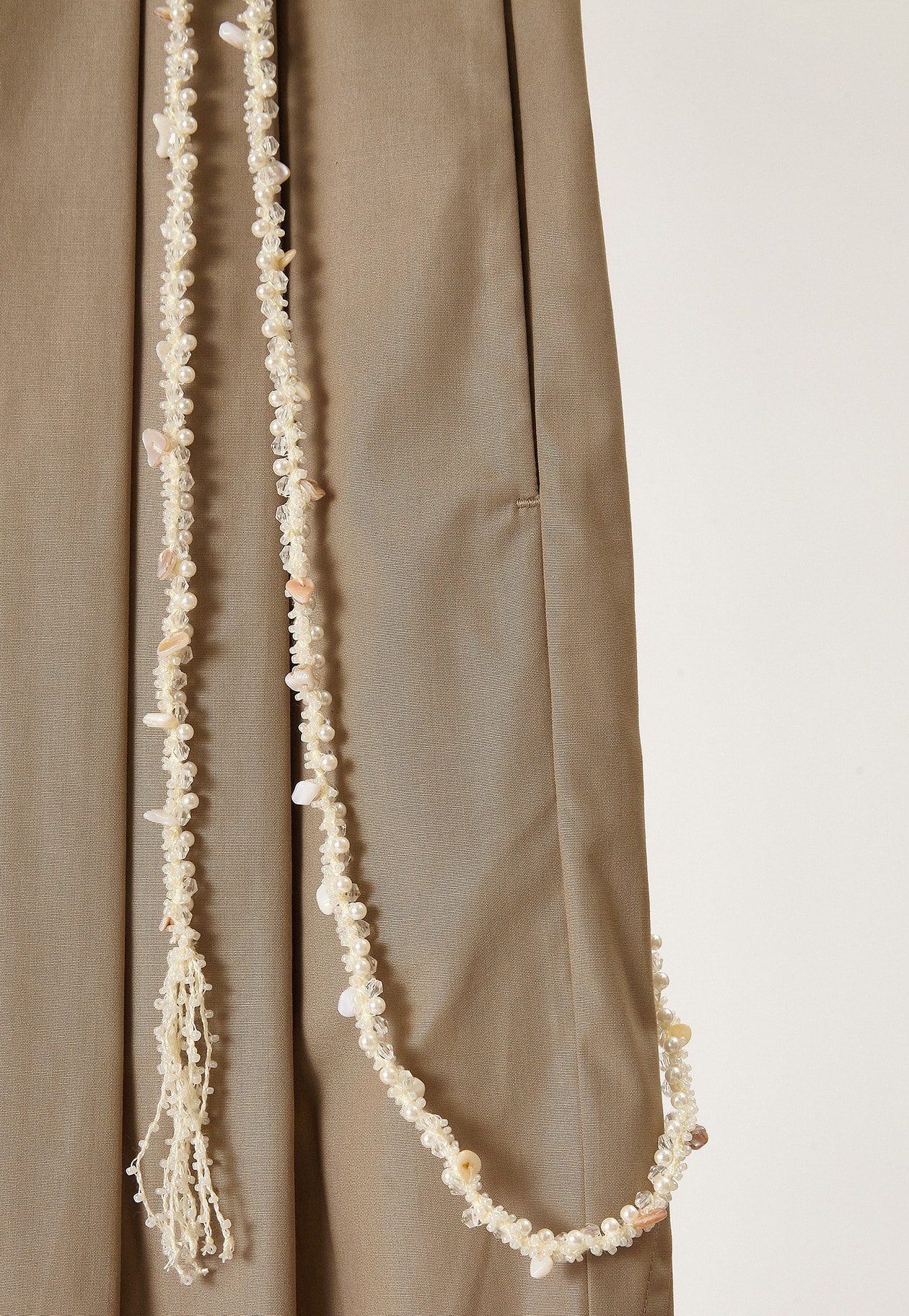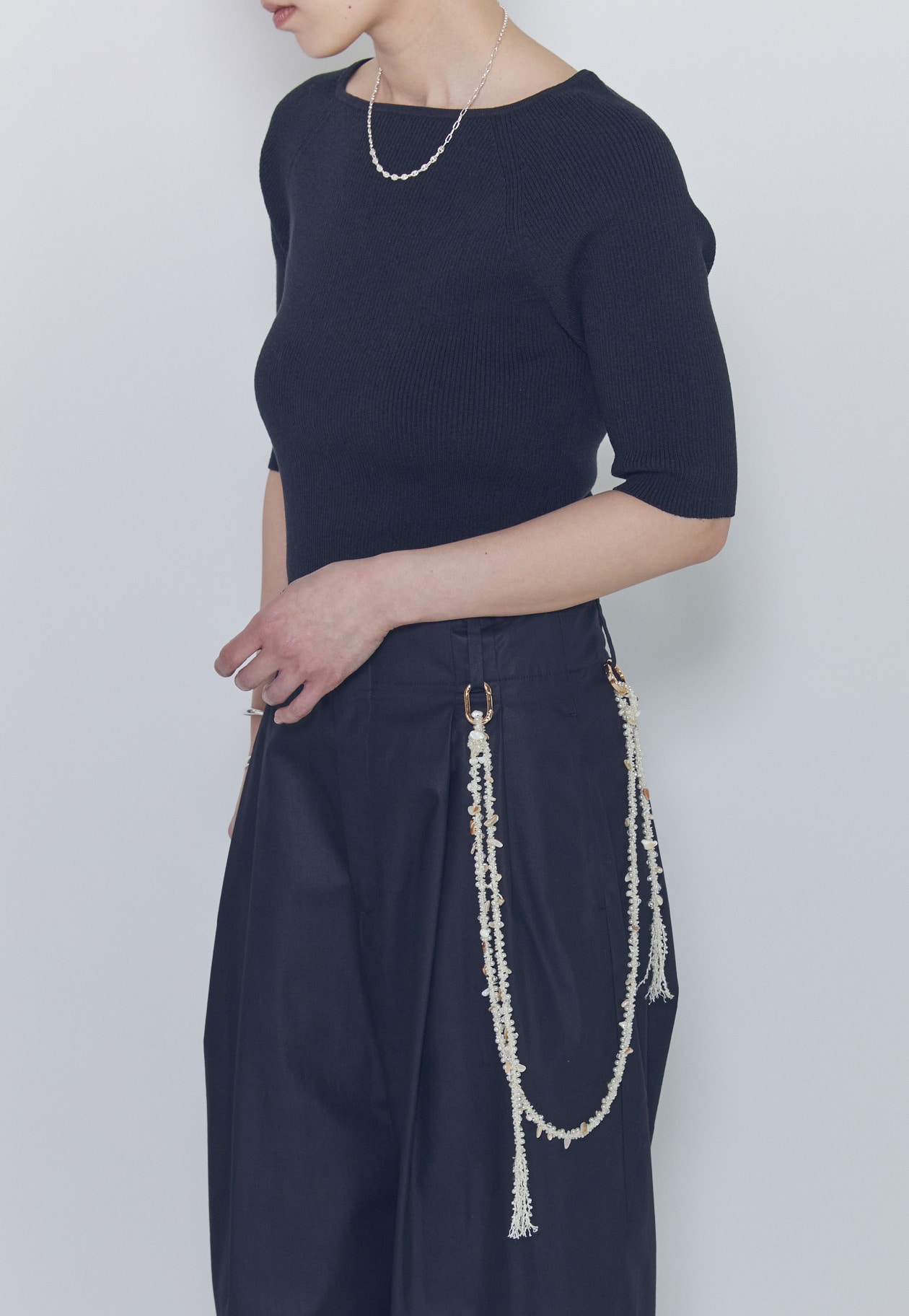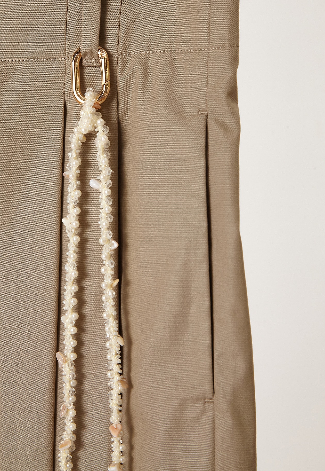 シェルパーツが散りばめられたチェーン付きパンツ。