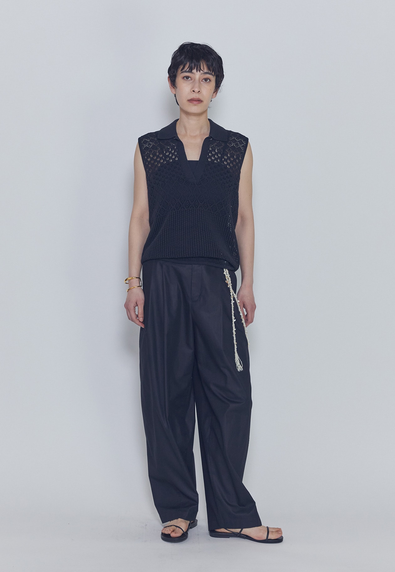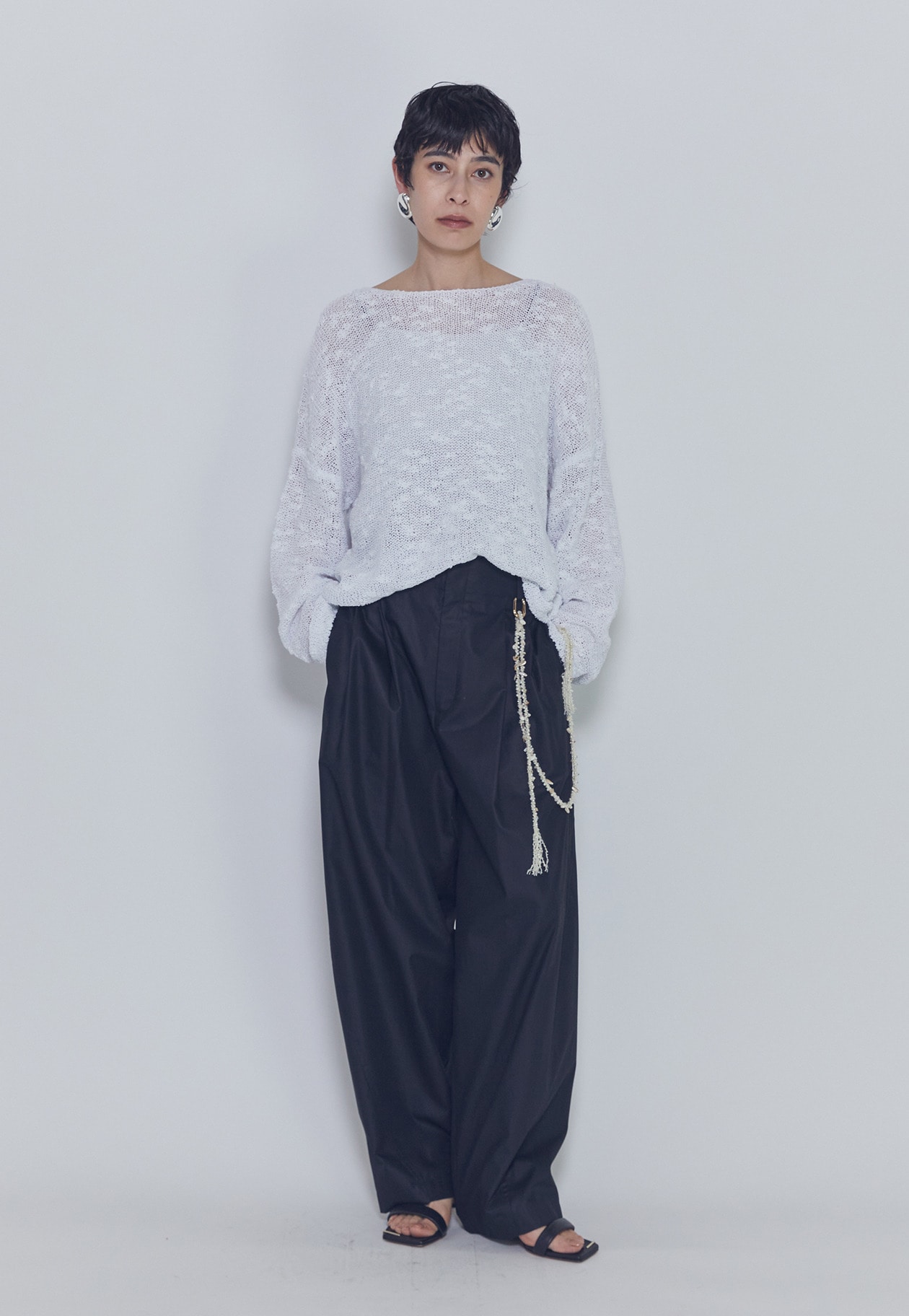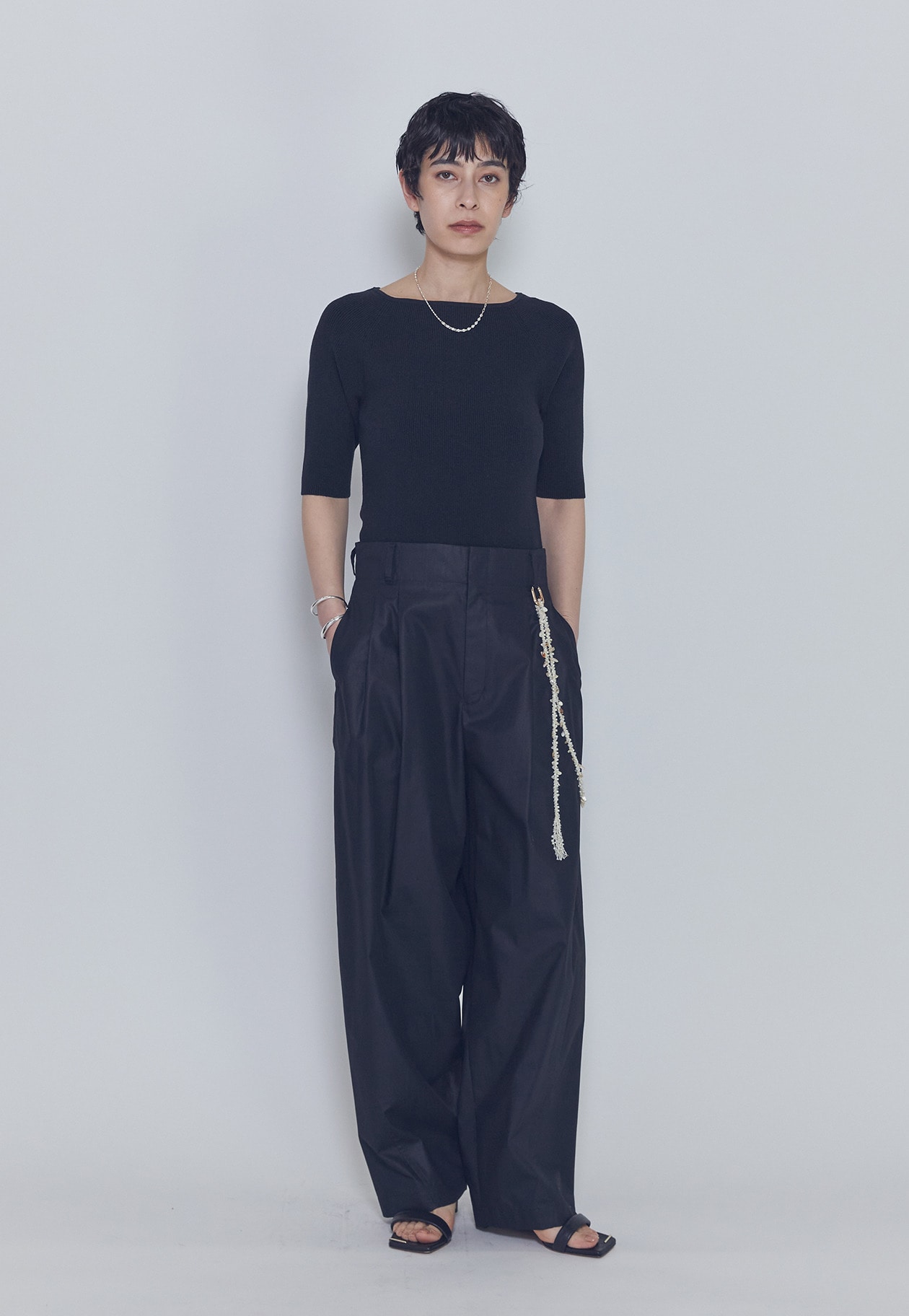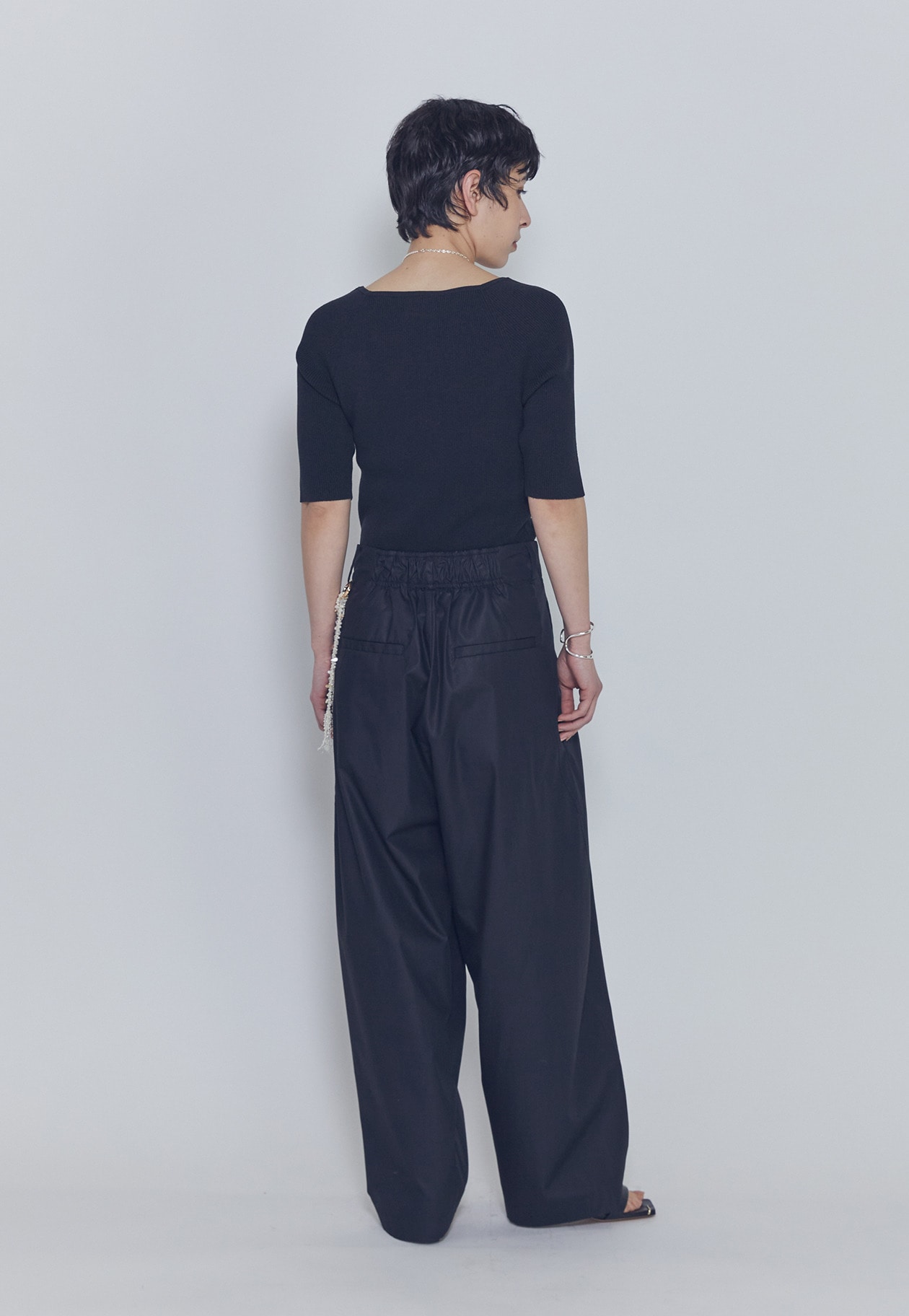 パンツは後ろゴムでリラックス感もありつつ、カッティングは美しく、太めテーパードでモードなシルエットが絶妙なパンツです。