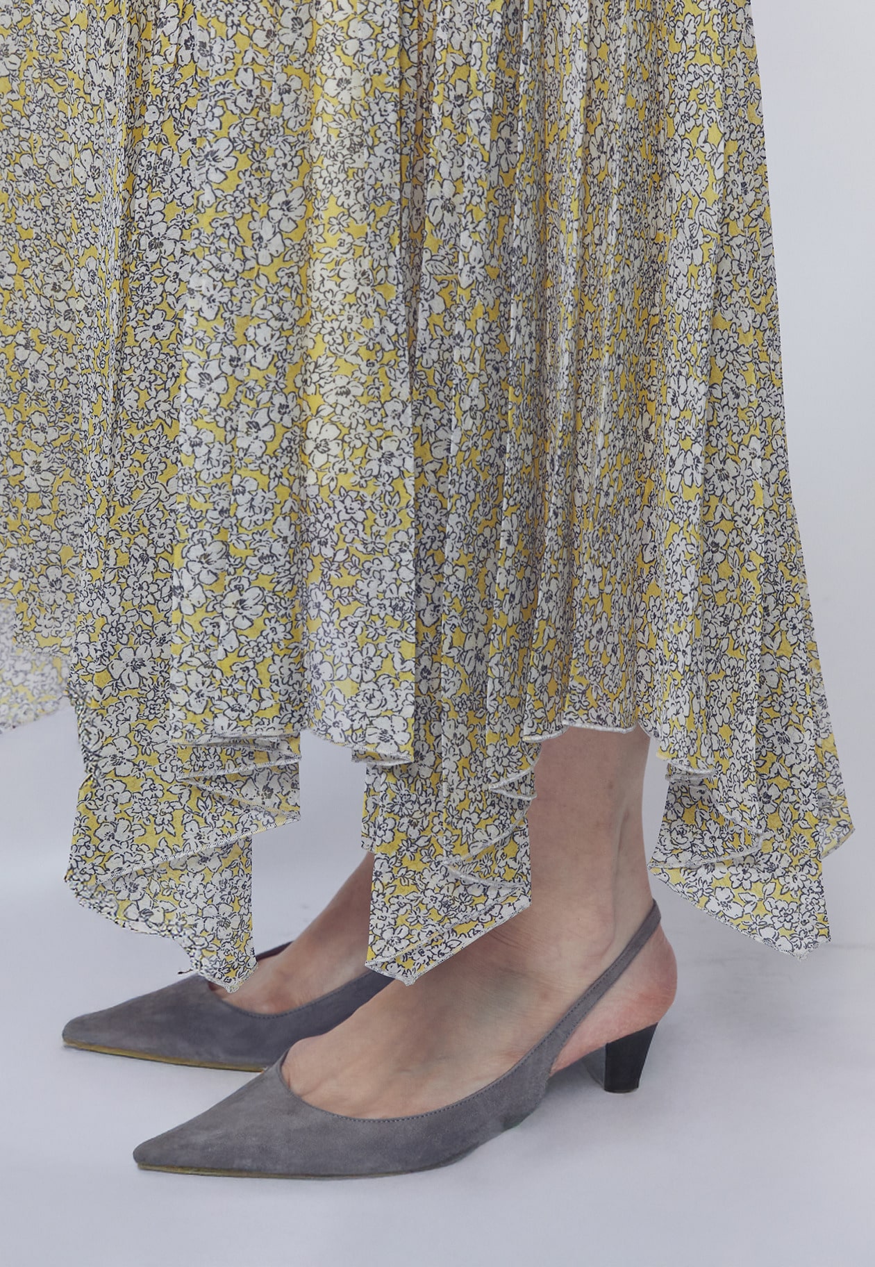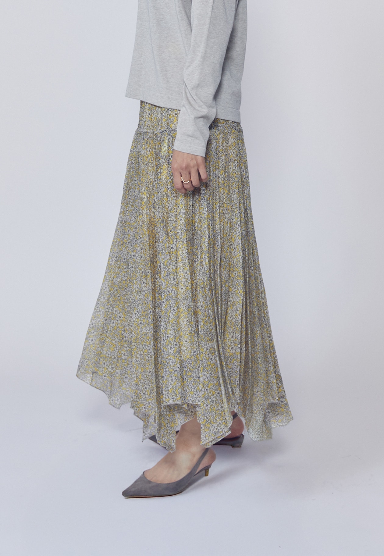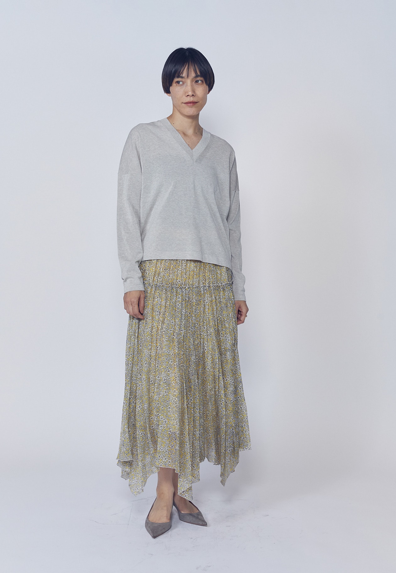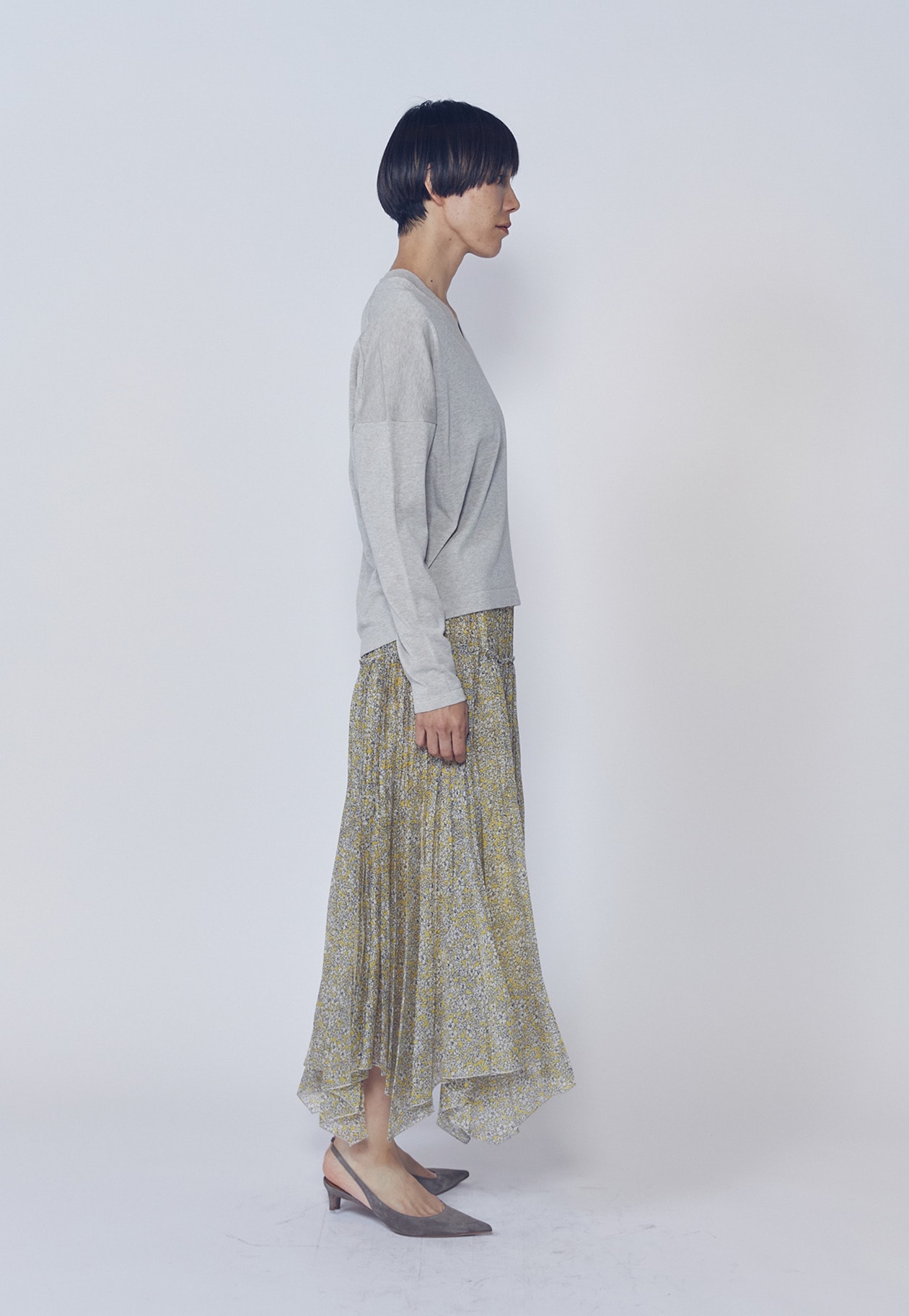 イレギュラーヘムによる揺れ感と、奥行きのある美しい色彩がスタイリングに華やぎをプラス。