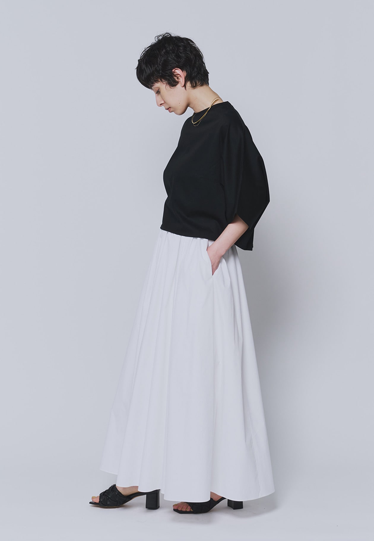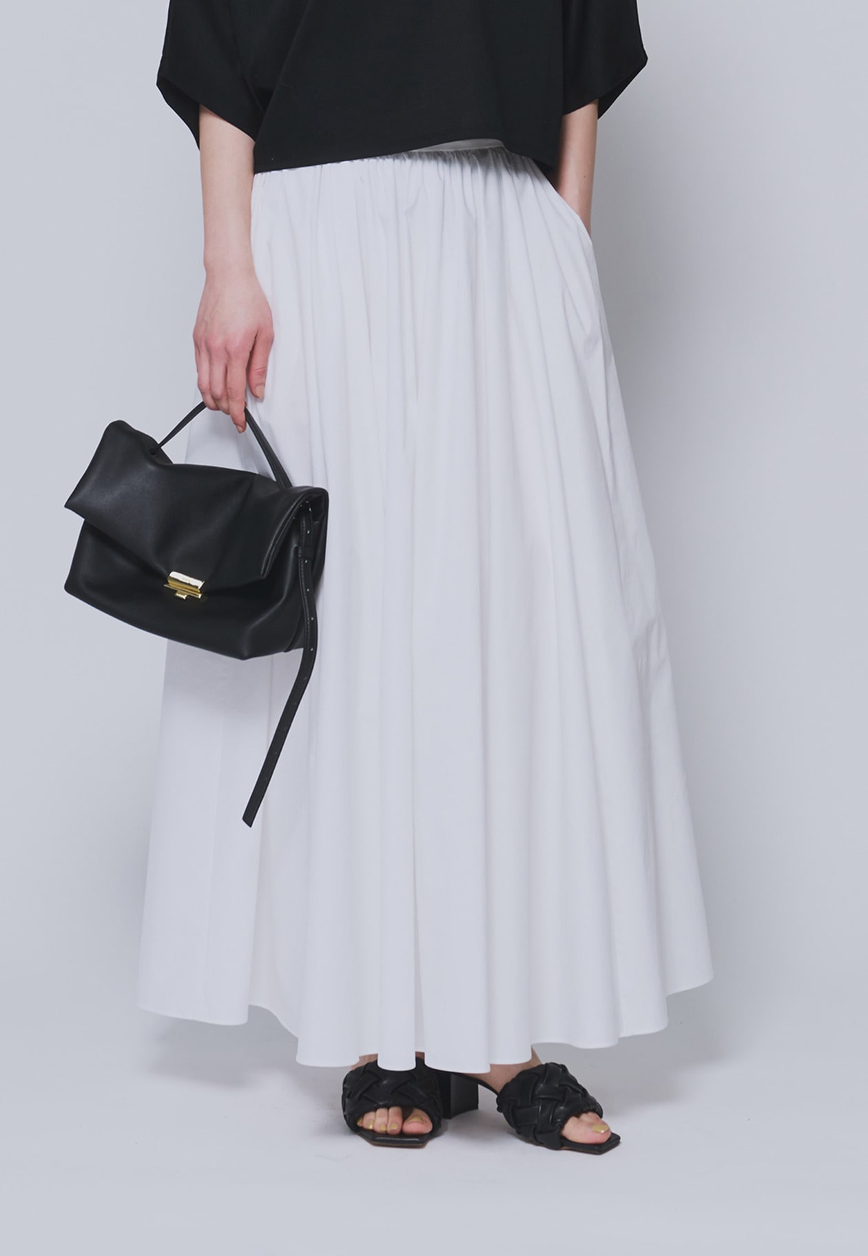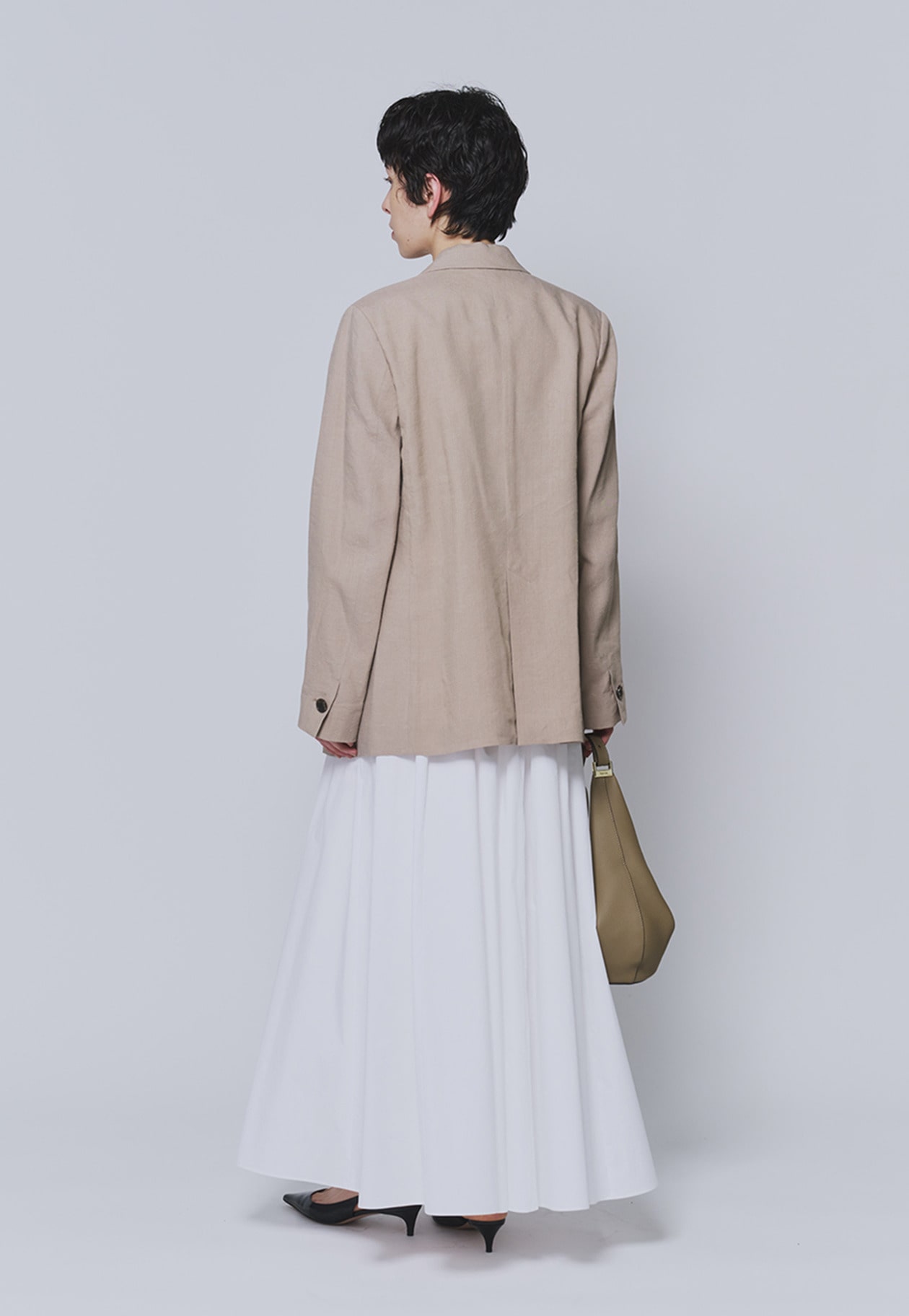 腰回りのボリュームはギャザーとタックでバランスよく調整し、すっきりとした印象に。