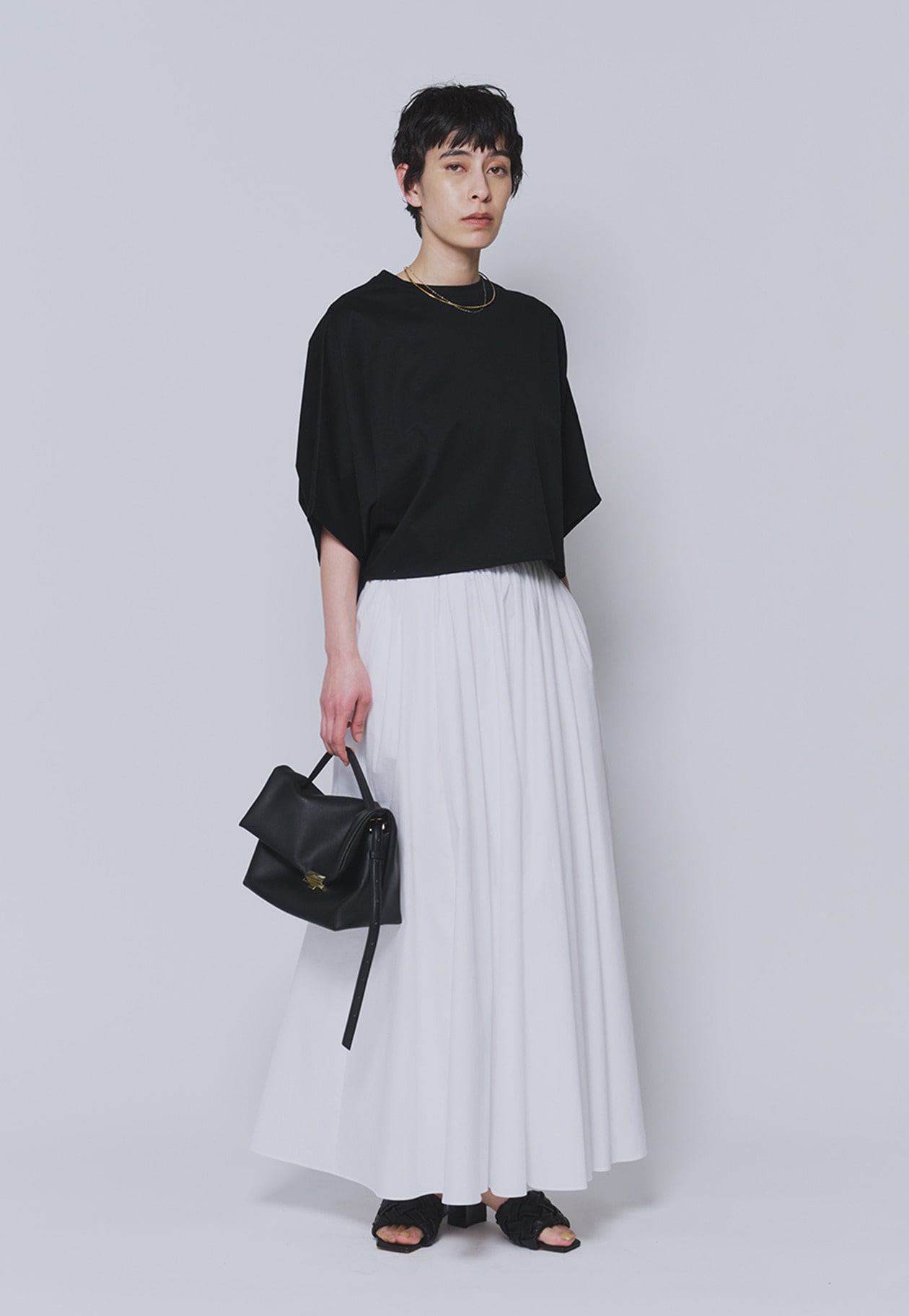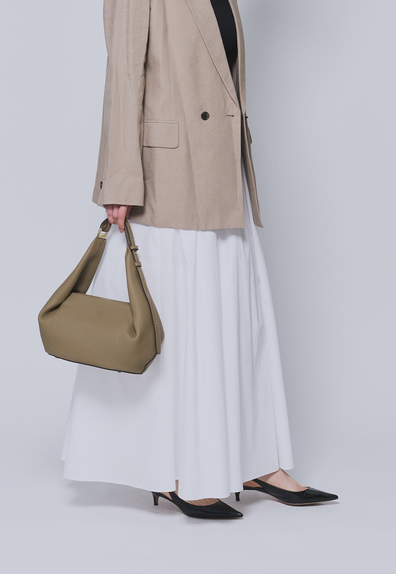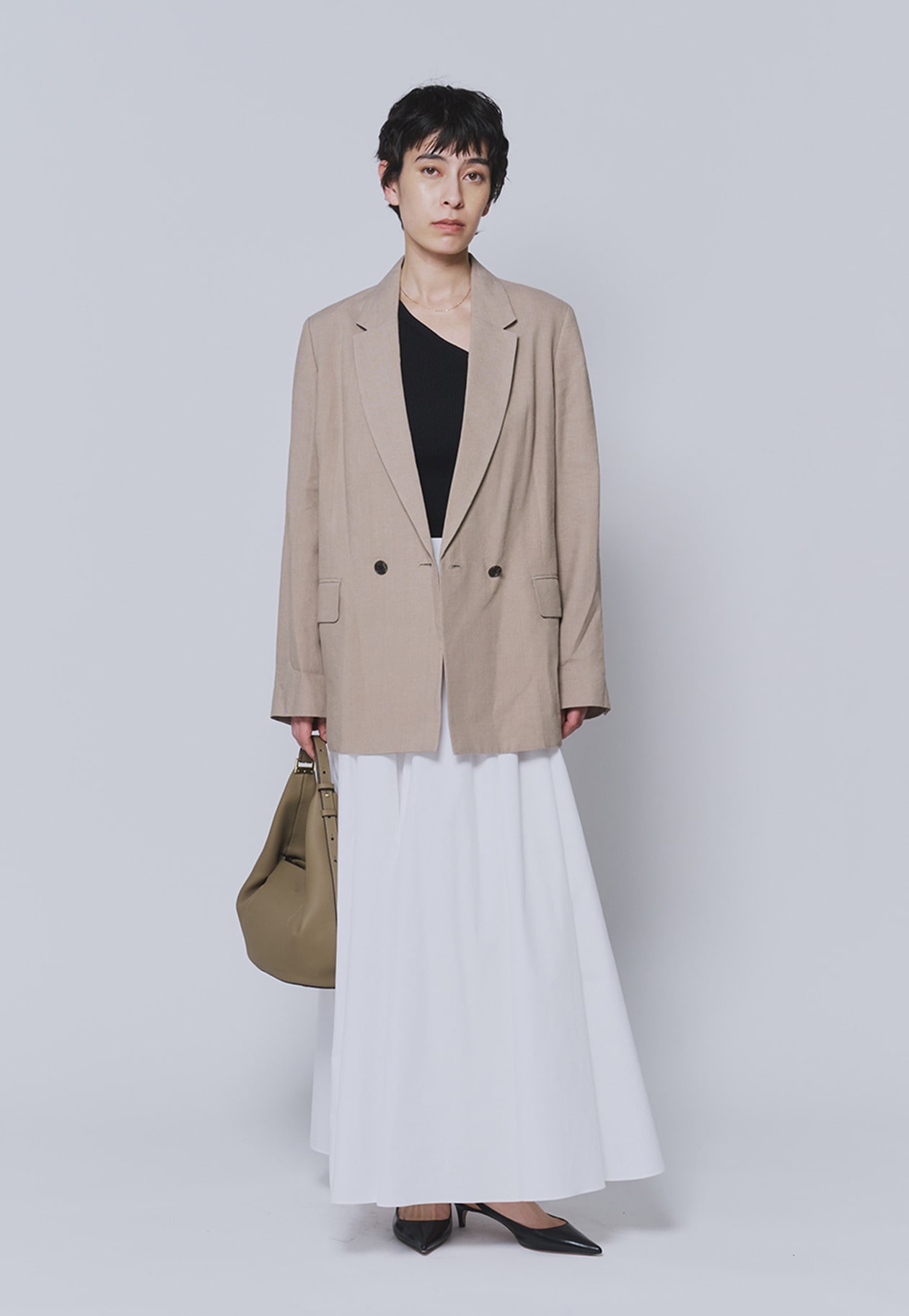 腰回りのボリュームはギャザーとタックでバランスよく調整し、すっきりとした印象に。