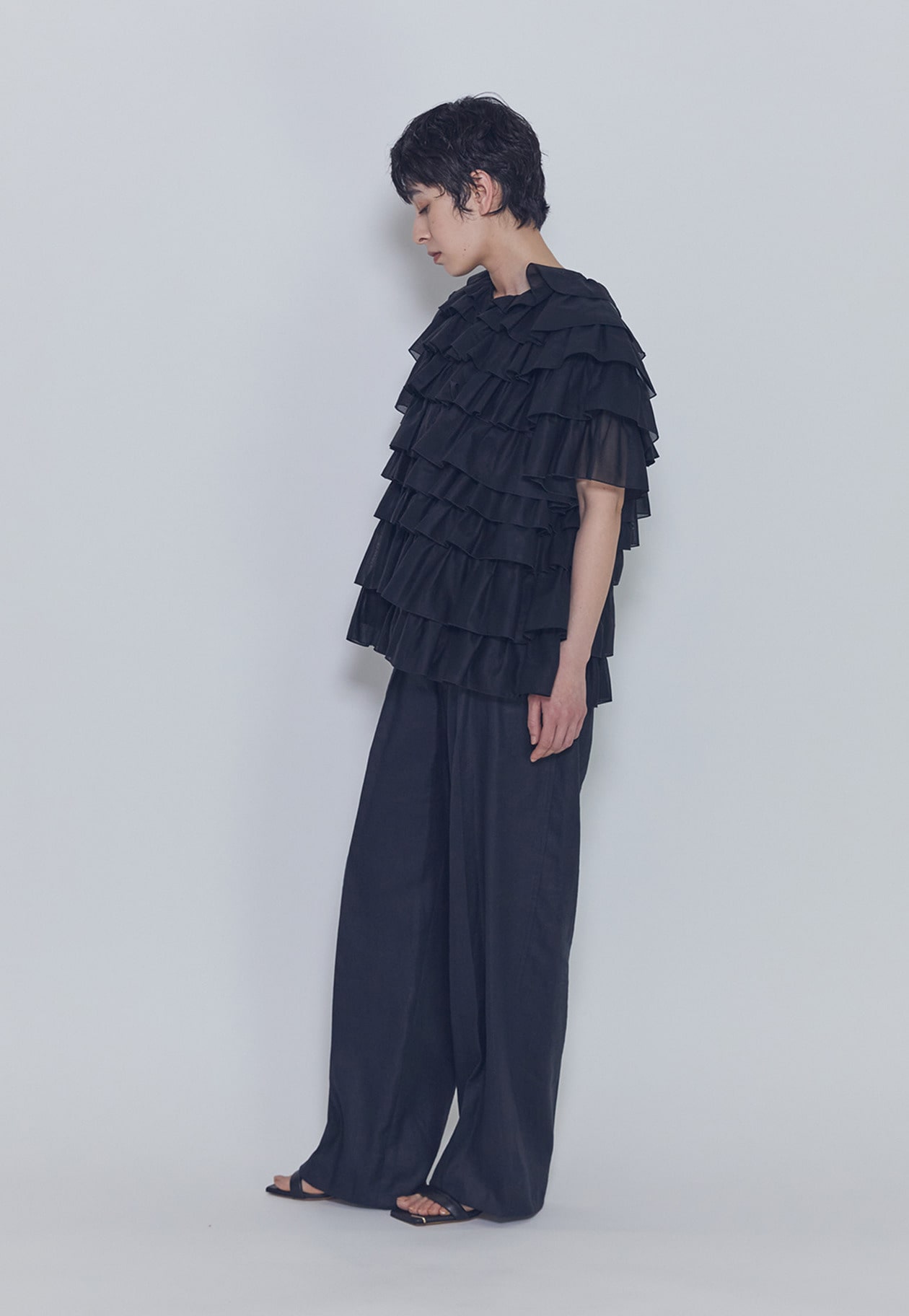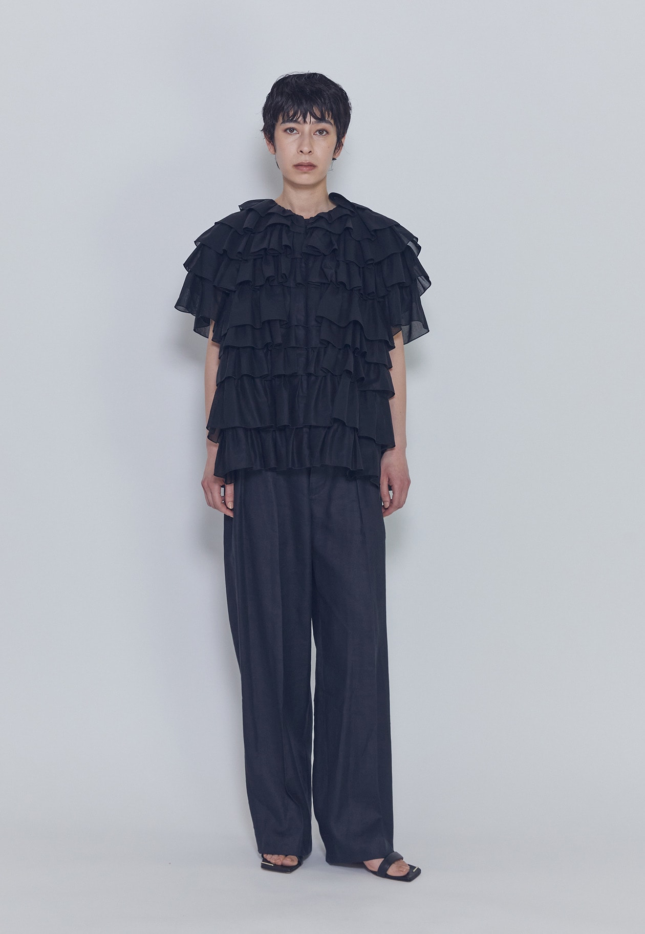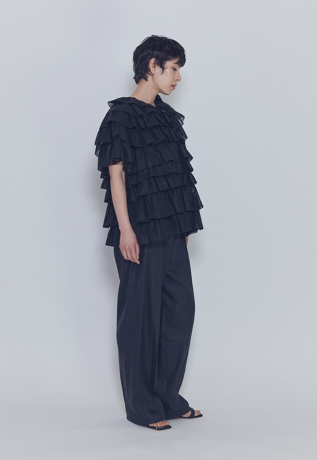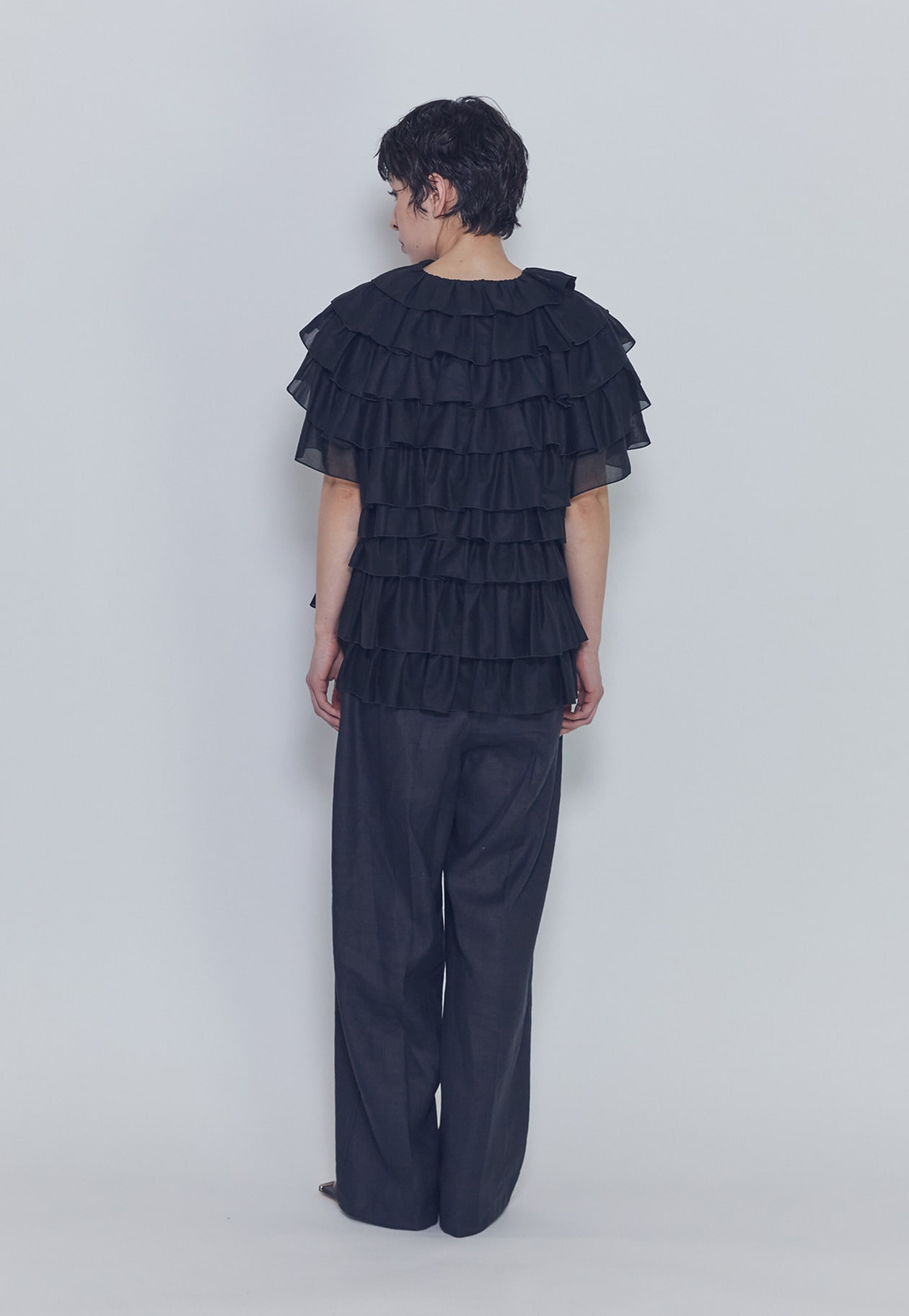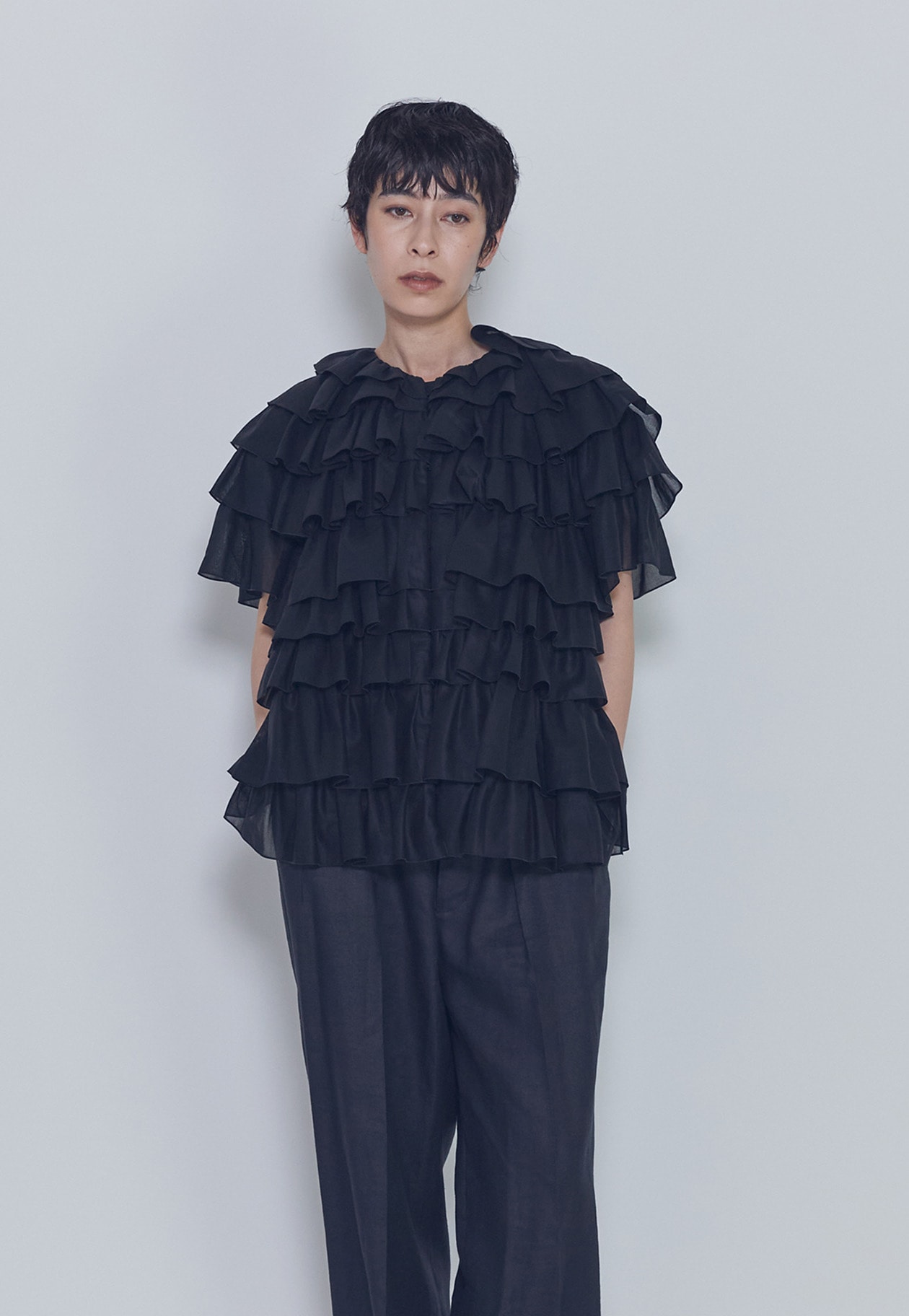 幾重にも重ねたフリルが造形的で、存在感のあるドラマティックな一着。